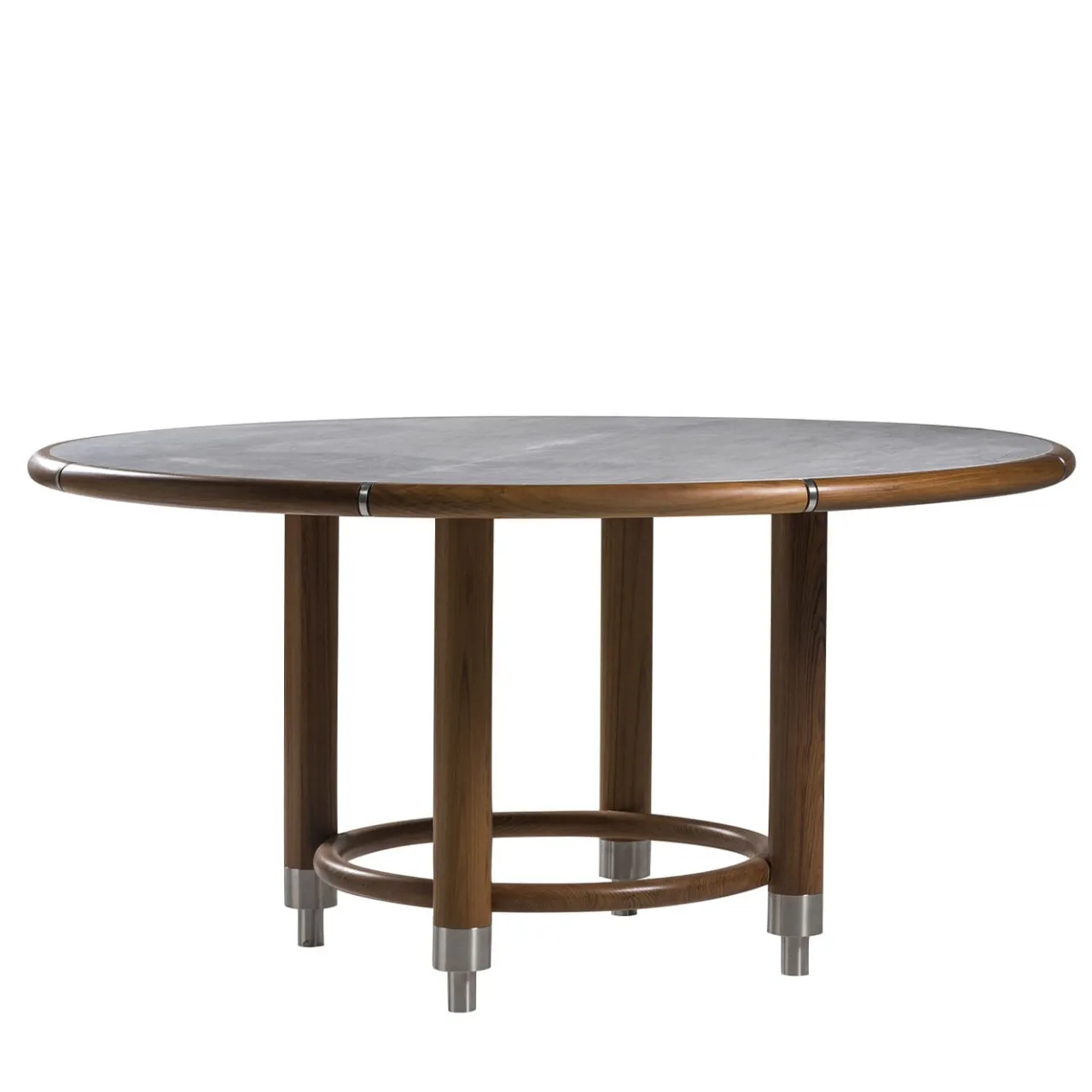 Soluzione ideale per riunire gli ospiti per un pasto rilassato in un patio, questo tavolo rotondo in pregiato Iroko è stato concepito per soddisfare le esigenze dell’esterno sia in termini di estetica che di funzionalità. I dettagli in acciaio inox – immediatamente individuabili nei piedi cilindrici – contrastano con la calda struttura in Iroko, che incorpora un anello alla base e accoglie un luminoso piano in gres.