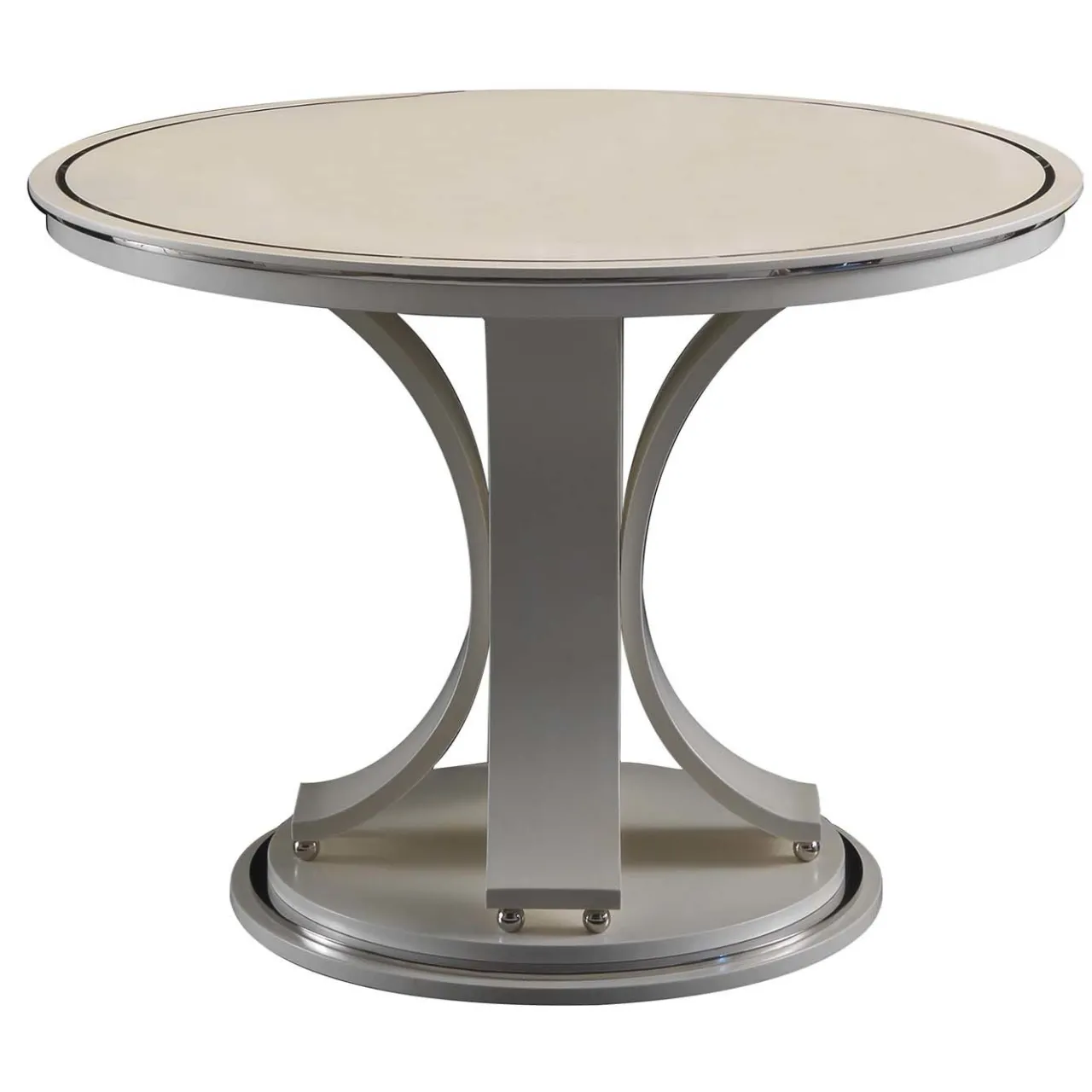 Questo tavolo unico nel suo genere è stato progettato per essere esposto in un ampio corridoio, per costituire un punto focale di grande effetto, da solo o con grandi composizioni floreali. Interamente rifinito in pergamena naturale opaca (col. 102), il piano rotondo misura 115 cm ed è sorretto da quattro gambe a C rivolte verso l’esterno che si raccordano al centro con un elegante disegno che ricorda un fiore sbocciato. La base rotonda è sollevata su uno zoccolo ed è rifinita, come il resto del pezzo, con dettagli in acciaio lucido.