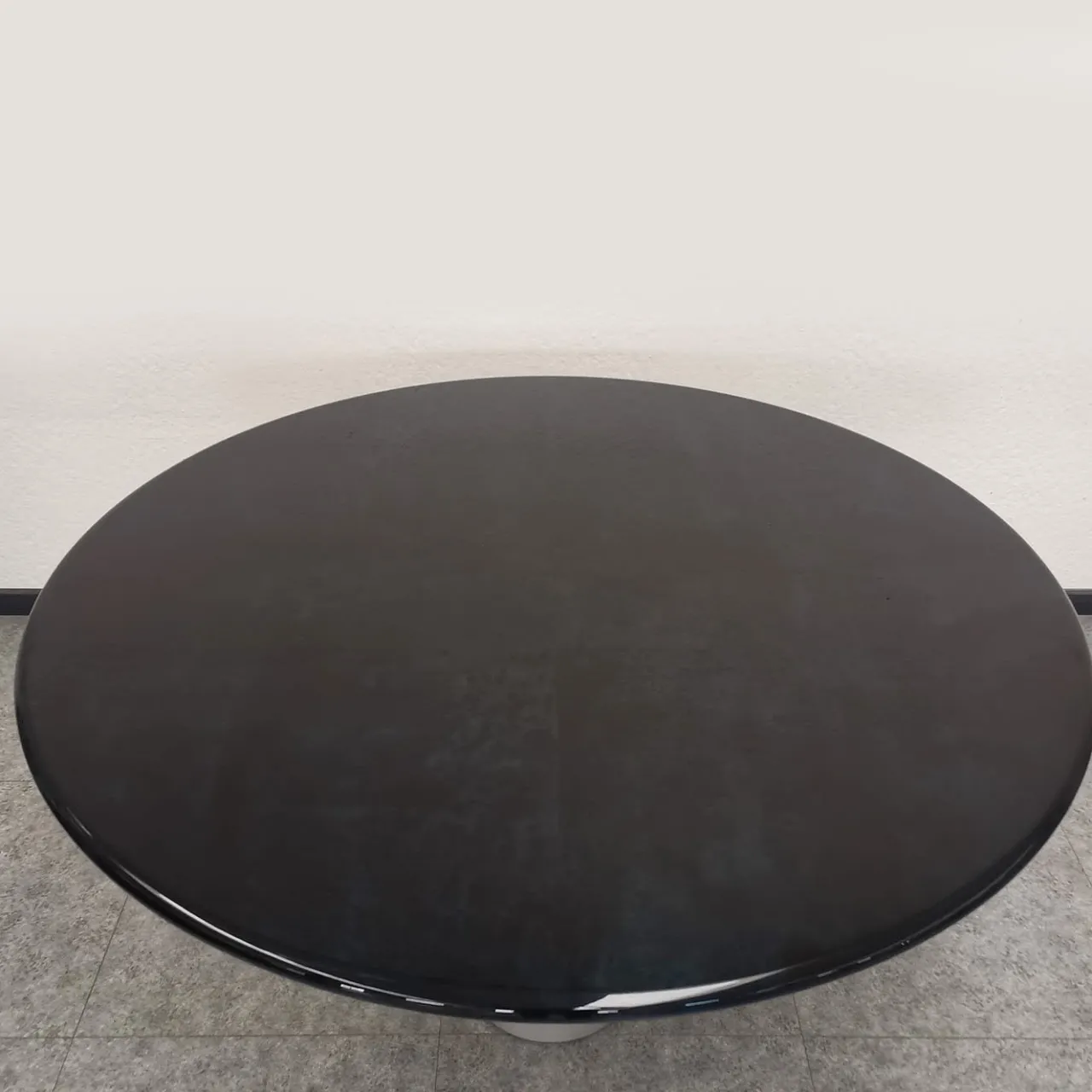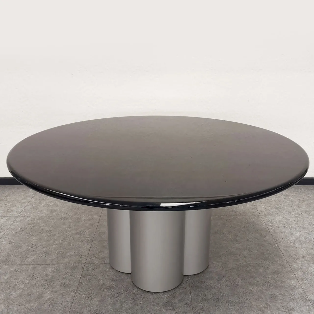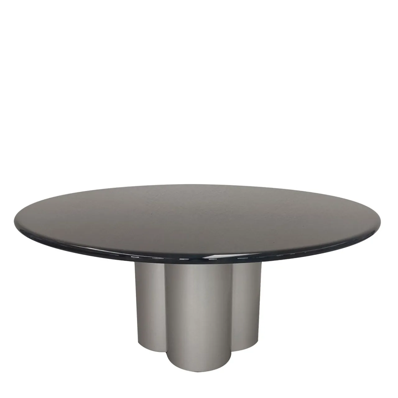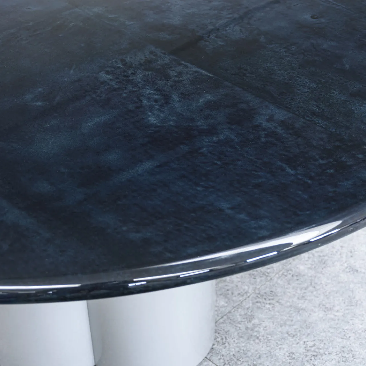 Questo tavolo rotondo, dal design straordinario e dal carattere senza tempo, è una testimonianza di estetica moderna e contemporanea. Caratterizzato da un piano in legno rivestito in pelle di capra blu, impreziosito da una finitura lucida, poggia su una base a forma di quatrefoglio realizzata in legno e laccata in tonalità argento. Per ulteriori informazioni, consultare il Concierge.