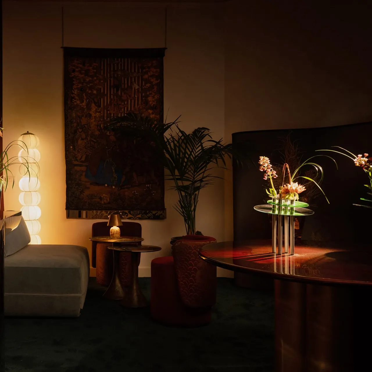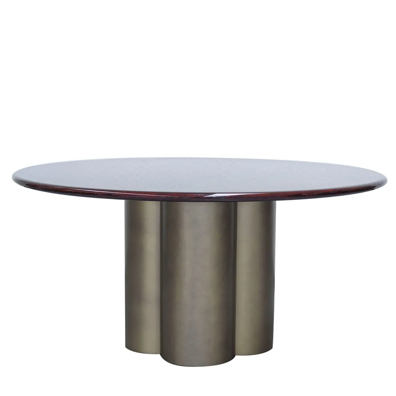 Design sofisticato che esprime la raffinatezza pulita dello stile contemporaneo, questo tavolo rotondo è caratterizzato da un piano in legno rivestito in pelle di capra color Amaranto, impreziosito da una finitura lucida. Poggia su una base a forma di quatrefoglio, anch’essa in legno e laccata in tonalità bronzo. Questo pezzo è unico. Per ulteriori informazioni, consultare il Concierge.