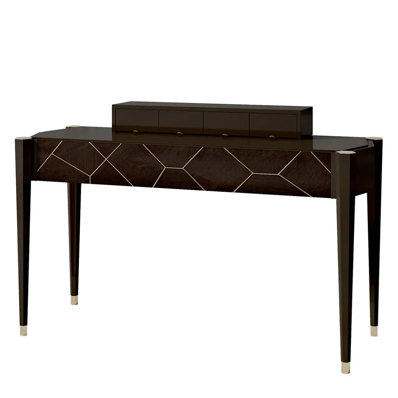 Il mobile Temptation è caratterizzato da un cassetto con dettagli in ottone e da un piano in legno. Con la sua forma iconica quasi a diamante, arricchita dall’uso del legno esotico “Lati” sul cassetto. Le decorazioni irregolari sono incise a mano, completate da finiture in metallo di ottone liquido. Il tutto è completato da dettagli in metallo galvanico dorato sulla parte superiore e inferiore delle gambe. All’interno del cassetto è presente un portagioie imbottito, mentre sul piano sono presenti quattro piccoli cassetti per un ulteriore spazio di archiviazione. È disponibile anche il piano in marmo. Chiedere al Concierge per i dettagli.