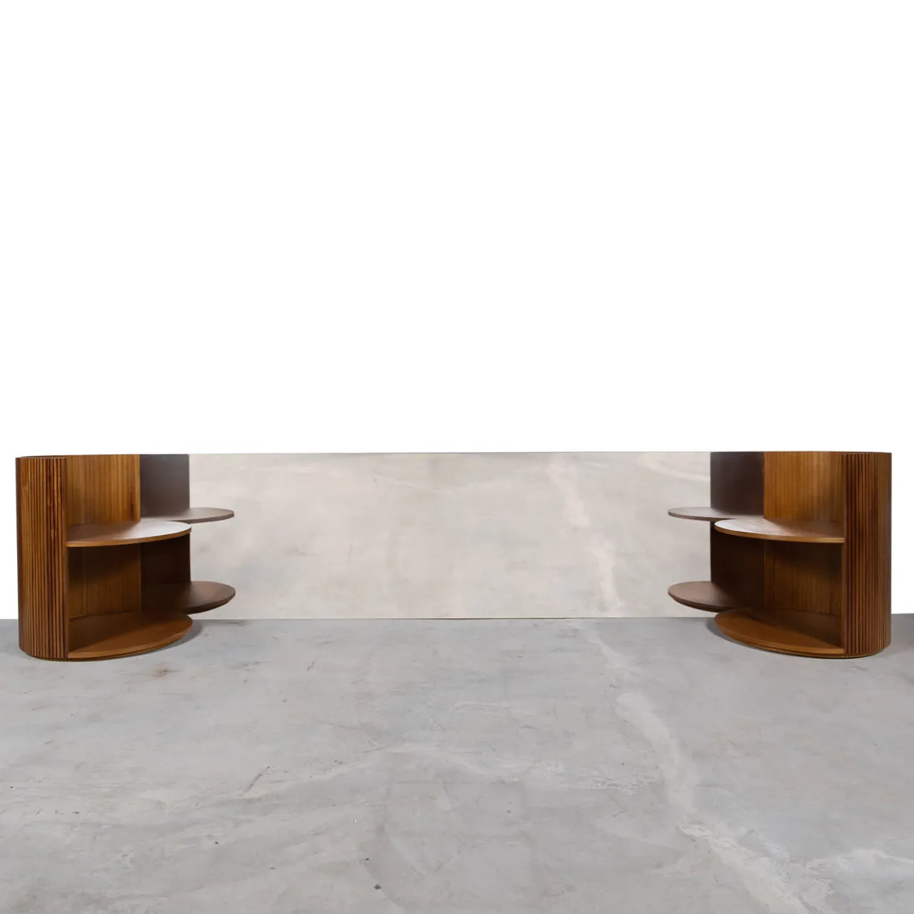 Combinando un’allure ultramoderna con un design funzionale, questa straordinaria testiera Verale presenta un pannello in legno rivestito in acciaio con comodini integrati in legno di Iroko, ognuno dei quali presenta sinuose silhouette in legno a doghe con due pratici ripiani. Un raffinato oggetto d’arte per una camera da letto moderna. Misure 330x60x75cm.