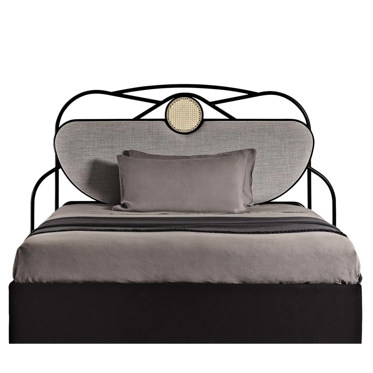 Ispirata alla Belle Epoque, la testiera Yvette, disegnata da Chiara Andreatti, integra una sottile femminilità con un’audace scintilla creativa. Caratterizzata da un profilo curvilineo in legno laccato nero e tubi metallici, Yvette crea un delicato disegno sulla parete, mentre la canna intrecciata è un sottile cenno allo stile caratteristico del marchio. La struttura del letto non è inclusa.