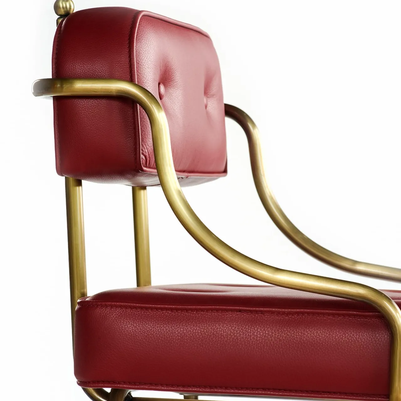 Questo splendido sgabello da bar di squisita ispirazione vintage è stato progettato per l’elegante Bar Centrale del Ristorante Alle Scuderie del Castello di Reschio. Arricchita da una finitura dorata, la struttura in acciaio presenta gambe che si svasano dolcemente alla base e braccioli inclinati che si estendono sinuosamente per collegare la seduta allo schienale aperto. Entrambi sono generosamente imbottiti, rivestiti in pelle rossa e ornati da bottoni decorativi per suggellare la sua estetica esclusiva.