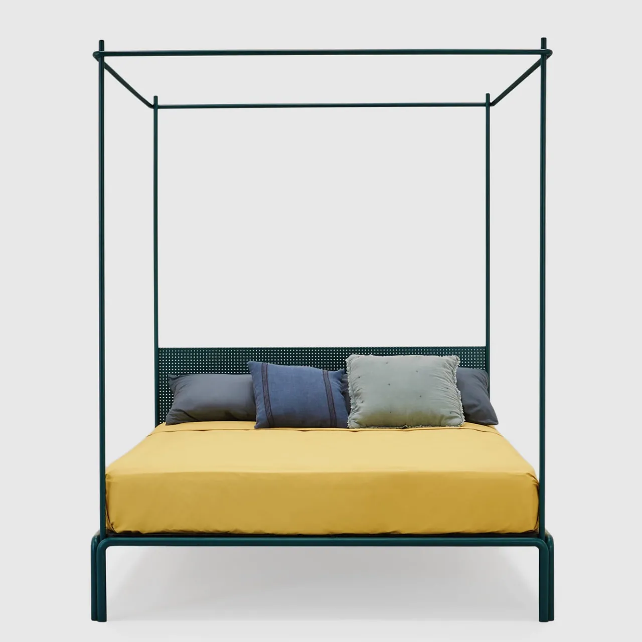 Accattivanti profili geometrici tracciano l’elegante struttura in ferro battuto di questo letto matrimoniale a baldacchino, un design moderno verniciato in una raffinata tonalità blu petrolio. Elementi cilindrici piegati di 21 e 33 mm di diametro compongono la base, i montanti e la struttura superiore del baldacchino. La rete traforata che caratterizza la testata in lamiera rafforza coerentemente il loro riferimento geometrico. La verniciatura, applicata due volte, garantisce una finitura di alta qualità.