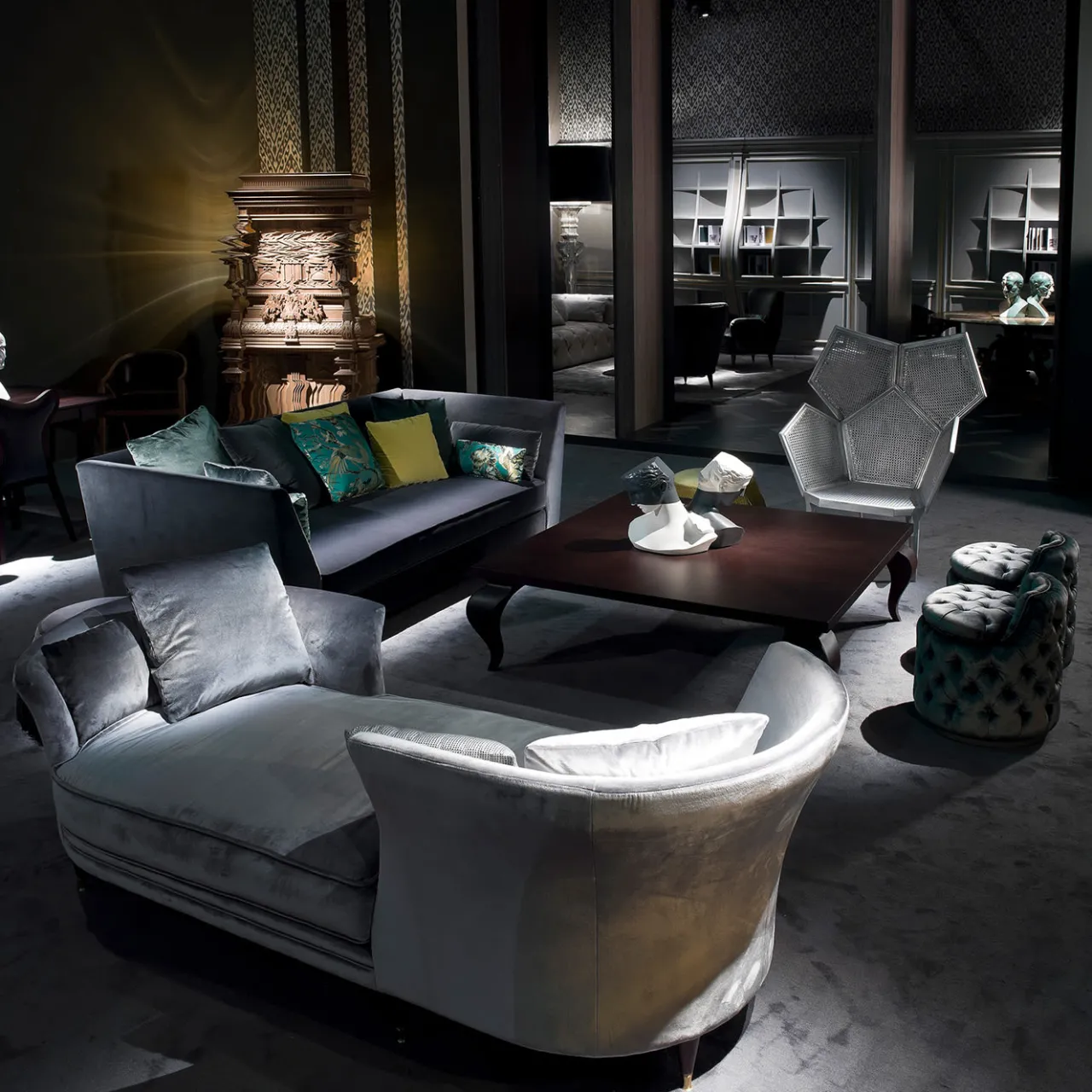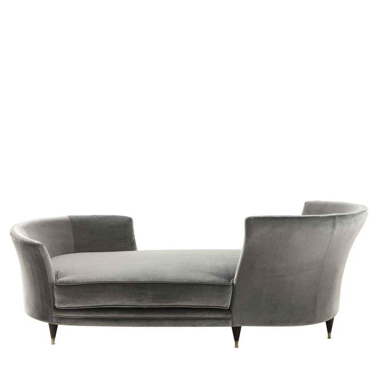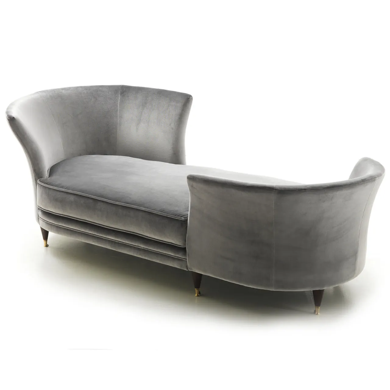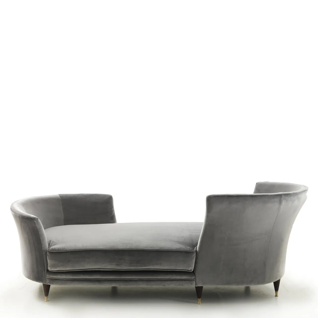 La chaise longue Triclinia alterna la sinuosità di un grande cuscino da seduta alle linee rette che delineano i due schienali, composti da due curve posizionate alle estremità opposte della chaise, creando così un’intima posizione di fronte. La base in legno è sostenuta da sottili piedini, pensati per slanciare la forma di Triclinia e renderla un oggetto femminile e aggraziato. La finitura è realizzata in noce scuro opaco.