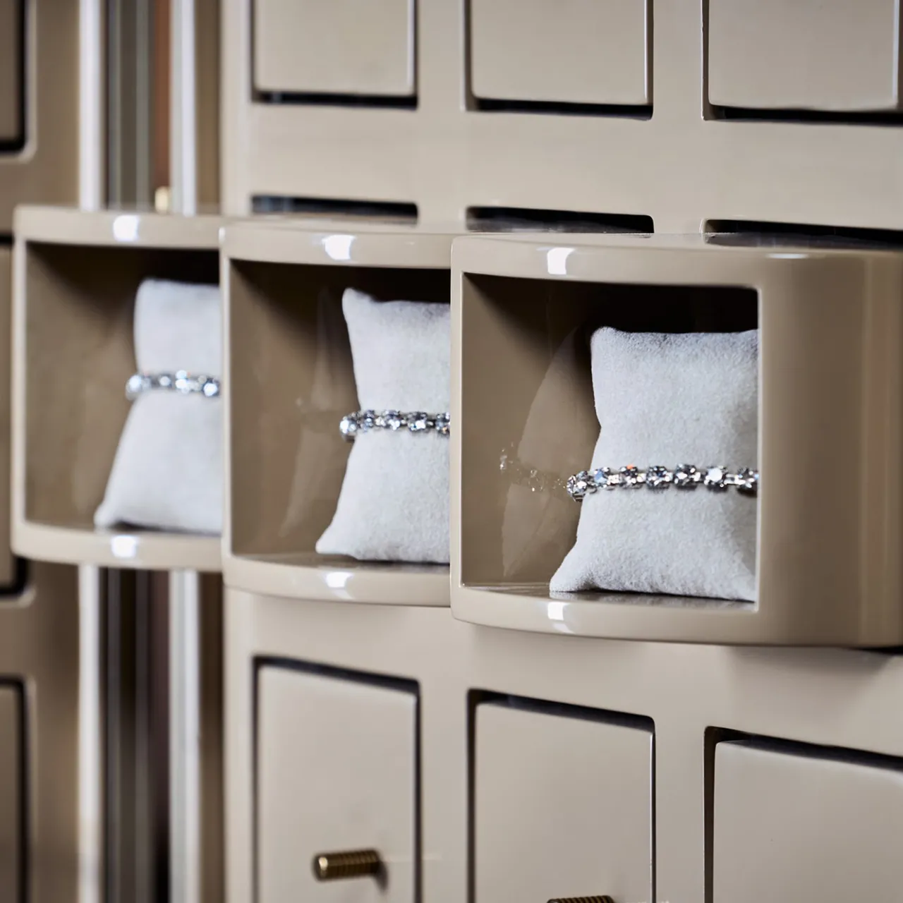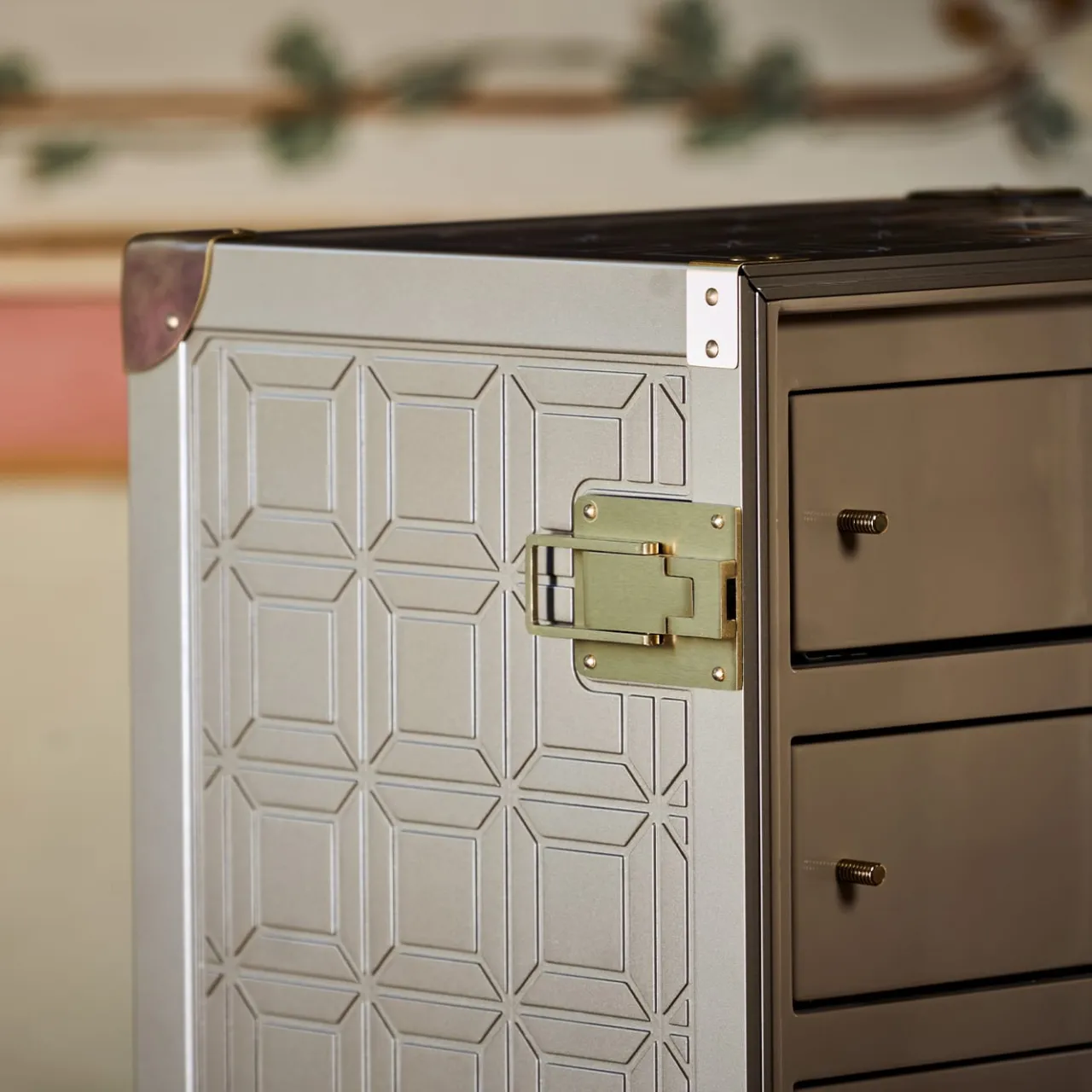 Doha è un trunk di lusso creato per organizzare e mostrare gioielli e orologi, grazie a couvettes dedicate al suo interno. L’esterno presenta una laccatura bronzata lucida con un decoro a motivo 3D, serrature in ottone opaco, protezioni per i bordi e bordature e maniglie laccate tono su tono. L’interno offre una finitura laccata lucida con manopole in ottone e couvettes rivestite in Alcantara, adatte per l’uso in un contesto di boutique di gioielli di lusso. Il trunk è dotato di ruote per una facile mobilità.