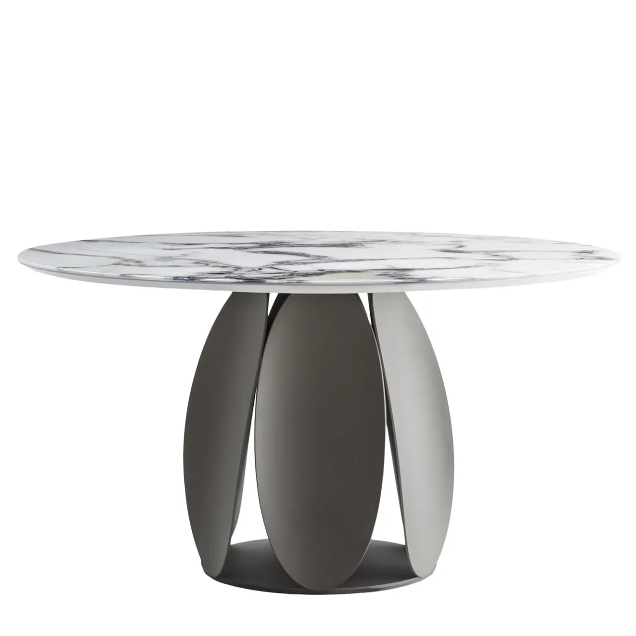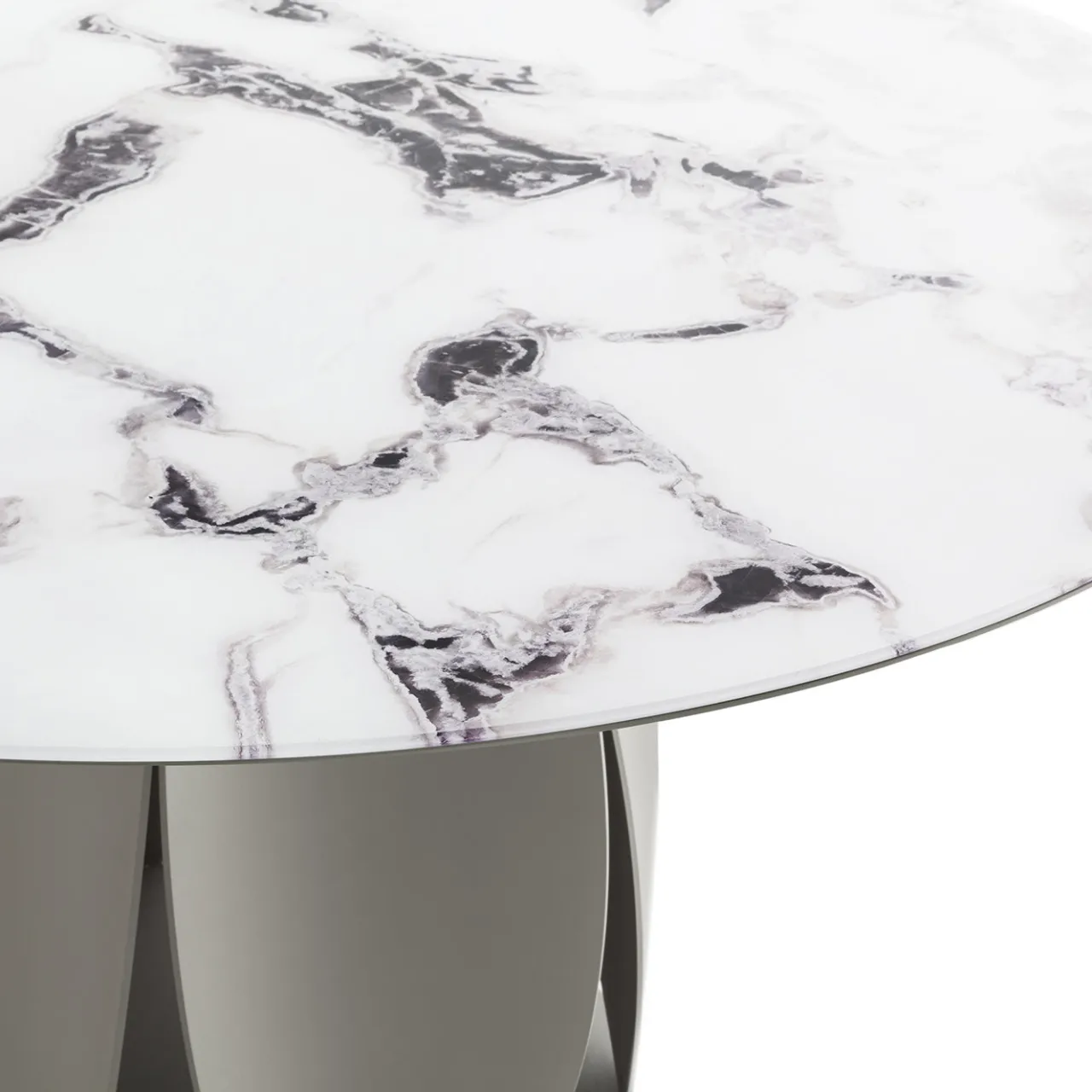 I petali di tulipano – che emergono da una base rotonda che condivide con loro la stessa struttura metallica laminata e la finitura champagne verniciata a polvere epossidica – rivelano la romantica ispirazione floreale di questo progetto. Disponibile in diverse finiture nel catalogo Artemest, qui sfoggia un piano in MDF smussato sormontato da una lastra di vetro abbinata, stampata in modo da ricordare un disco di autentico marmo Trinity.