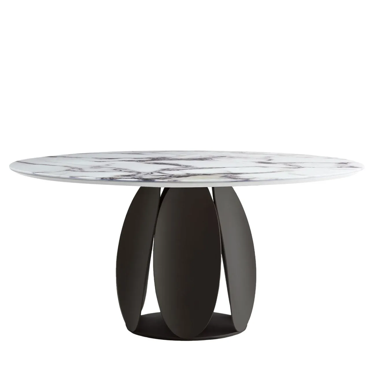 Scultoreo ed etereo al tempo stesso, questo tavolo rivela la sua ispirazione romantica al primo sguardo, quando l’occhio viene catturato dagli elementi a forma di petalo di tulipano che compongono la base in metallo calandrato brunito scuro con rivestimento epossidico. Un’intrigante stampa sul retro in marmo Trinity adorna il piano in vetro temperato extrachiaro, che aderisce a un pannello in MDF rifinito con bordi smussati a 60°.
