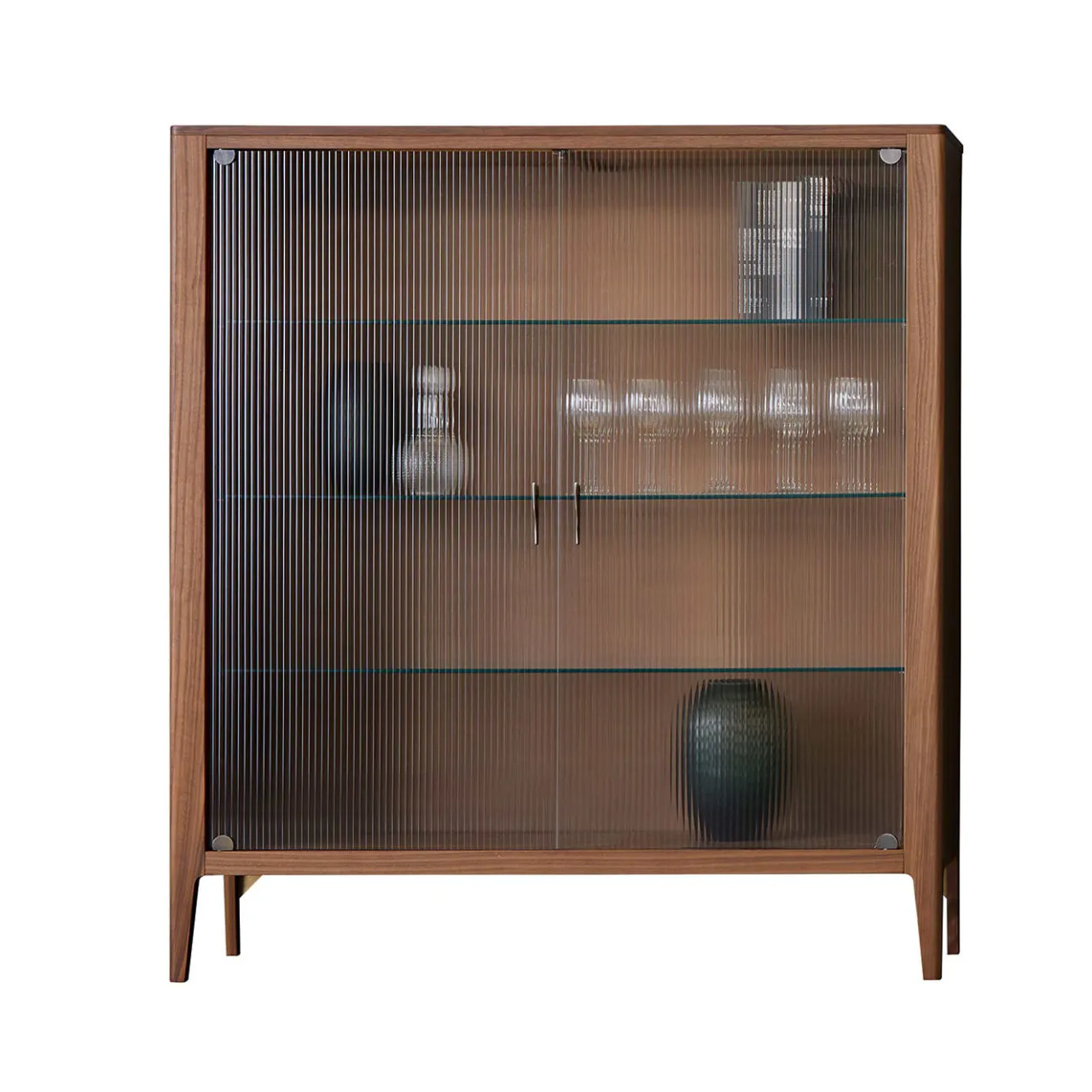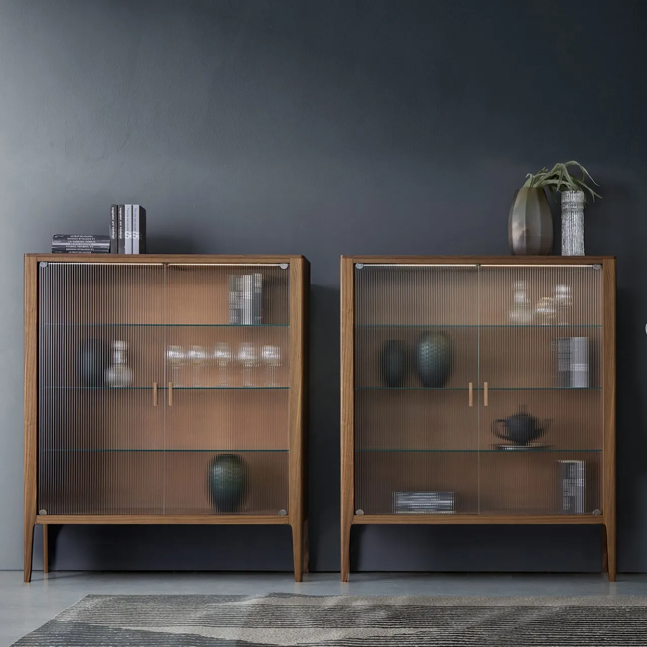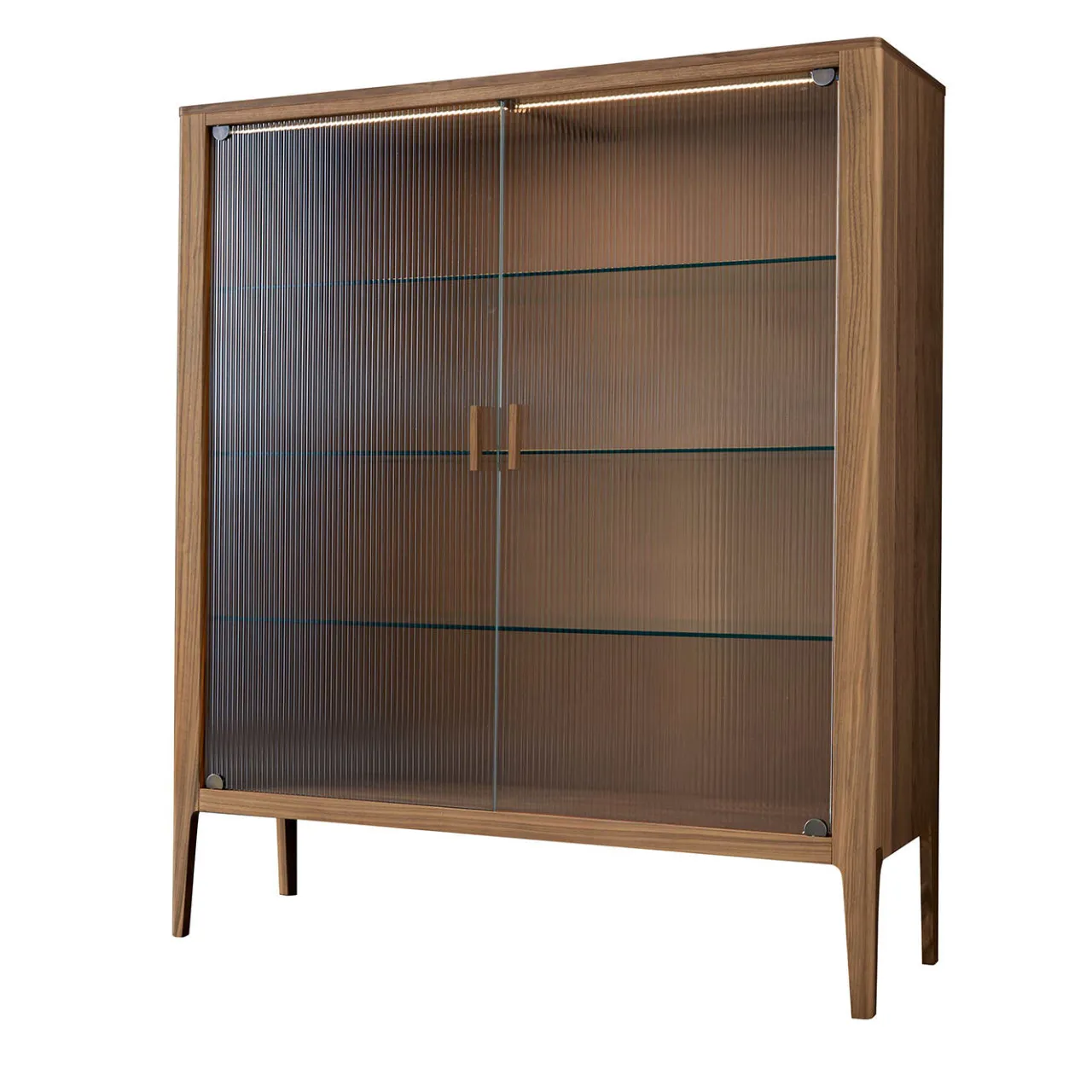 Questa vetrina è caratterizzata da 2 ante in vetro Cannetè e 3 ripiani in vetro. La struttura e le maniglie in legno hanno una finitura Havana ed è completata da eleganti luci a Led nella parte superiore.