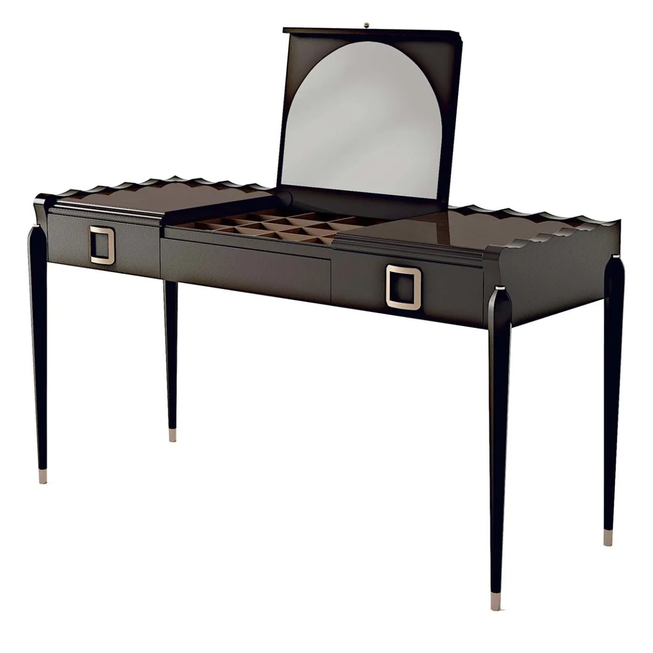 Il vanity Glamour è dotato di due cassetti e di uno specchio apribile. Caratterizzato da maniglie squadrate in metallo dorato, l’interno contiene un bellissimo portagioie imbottito.