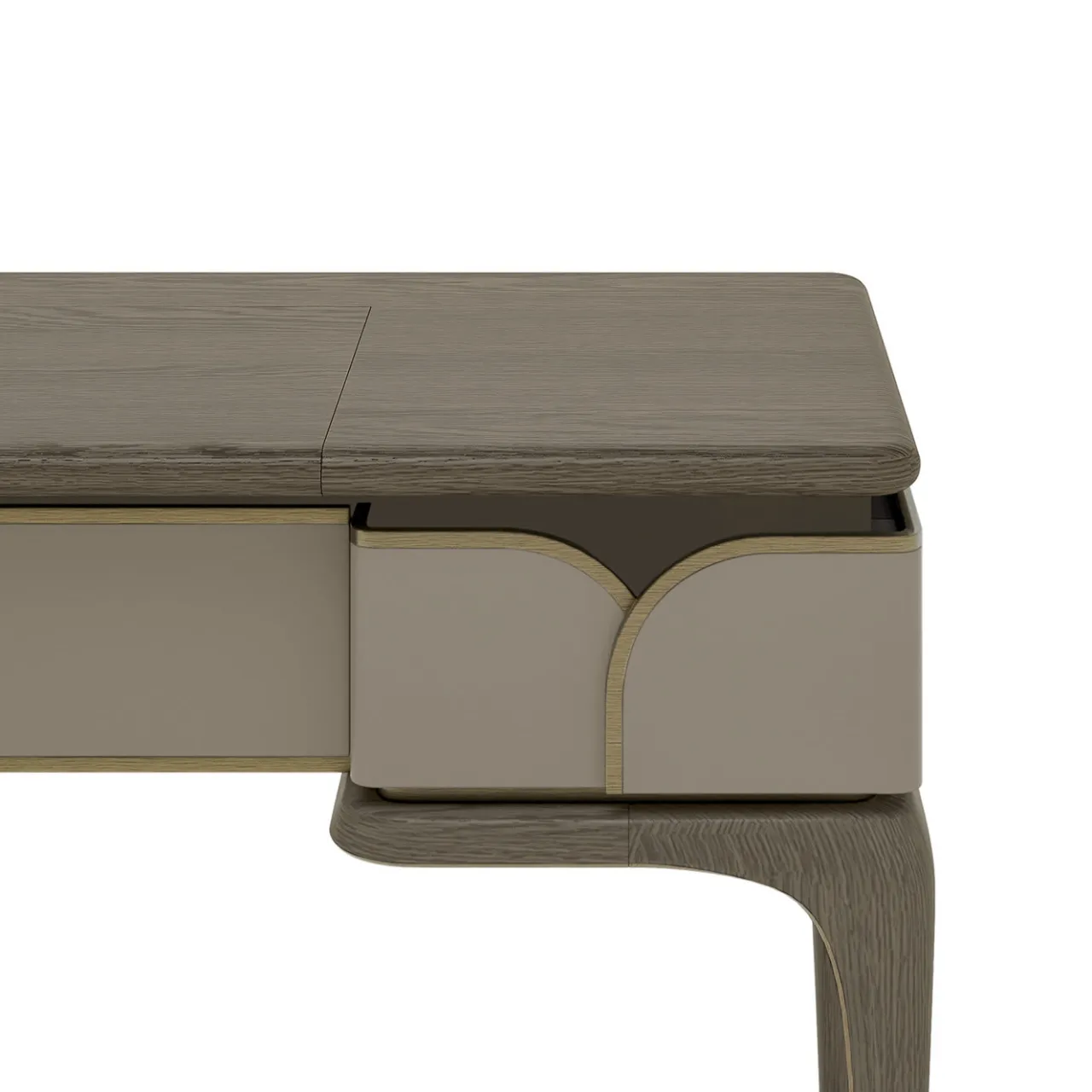 Un design elegante e pulito che eleva lo stile di qualsiasi camera da letto, questo vanity completerà qualsiasi collezione di mobili per la camera da letto. Caratterizzato da un profilo in ottone brunito che ne delinea i bordi, la struttura di questo mobile è realizzata in compensato e MDF con rivestimento in frassino, sostenuta da una base in massello di frassino fiammato. L’elemento distintivo di questo vanity è l’esclusivo top con specchio che si apre per rivelare i cassetti interni (dotati di cerniere blum) che offrono ampio spazio per cosmetici e gioielli.