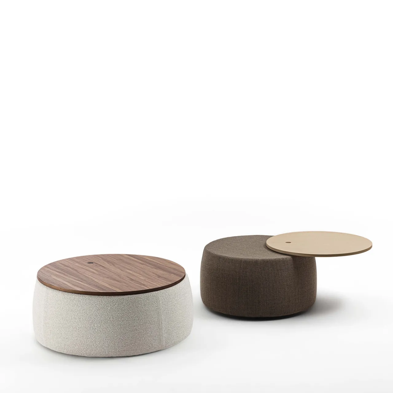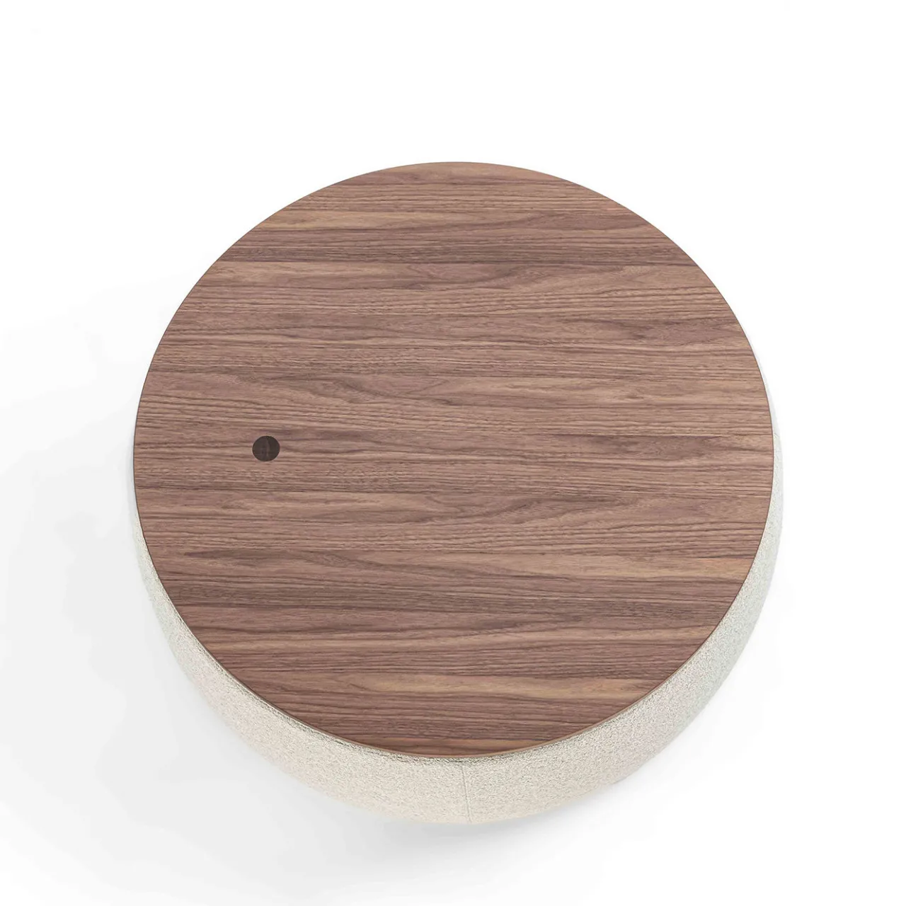 Il pouf e tavolino rotondo Verto beige unisce funzionalità e design, presentando un volume imbottito rivestito in tessuto con un top in legno di noce integrato. Il meccanismo rotante rivela una superficie di seduta, consentendo un uso duplice come pouf o tavolino da caffè. Disponibile in diverse dimensioni e finiture, contattare il Concierge per ulteriori informazioni.