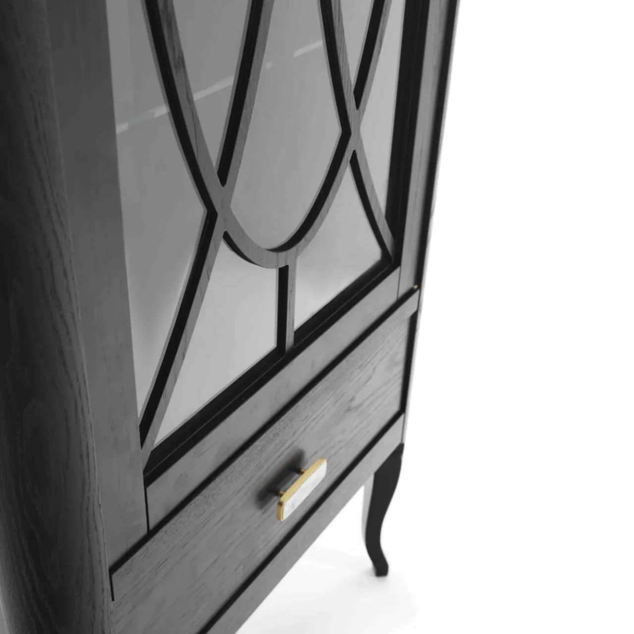 Semplice e sofisticata, questa vetrinetta diventerà il punto focale di un soggiorno o di una sala da pranzo in un ambiente moderno. Elegante e funzionale al tempo stesso, la struttura in legno di frassino con finitura ebanizzata si erge su sottili gambe in stile cabriole e presenta un’unica anta in vetro con un elegante pomello in ottone e un cassetto inferiore con maniglia in ottone Art Déco con inserto in corno di bufalo. All’interno del mobile, tre ripiani in vetro e un pannello posteriore in pelle sintetica avorio consentono di esporre con stile oggetti da collezione e preziosi.