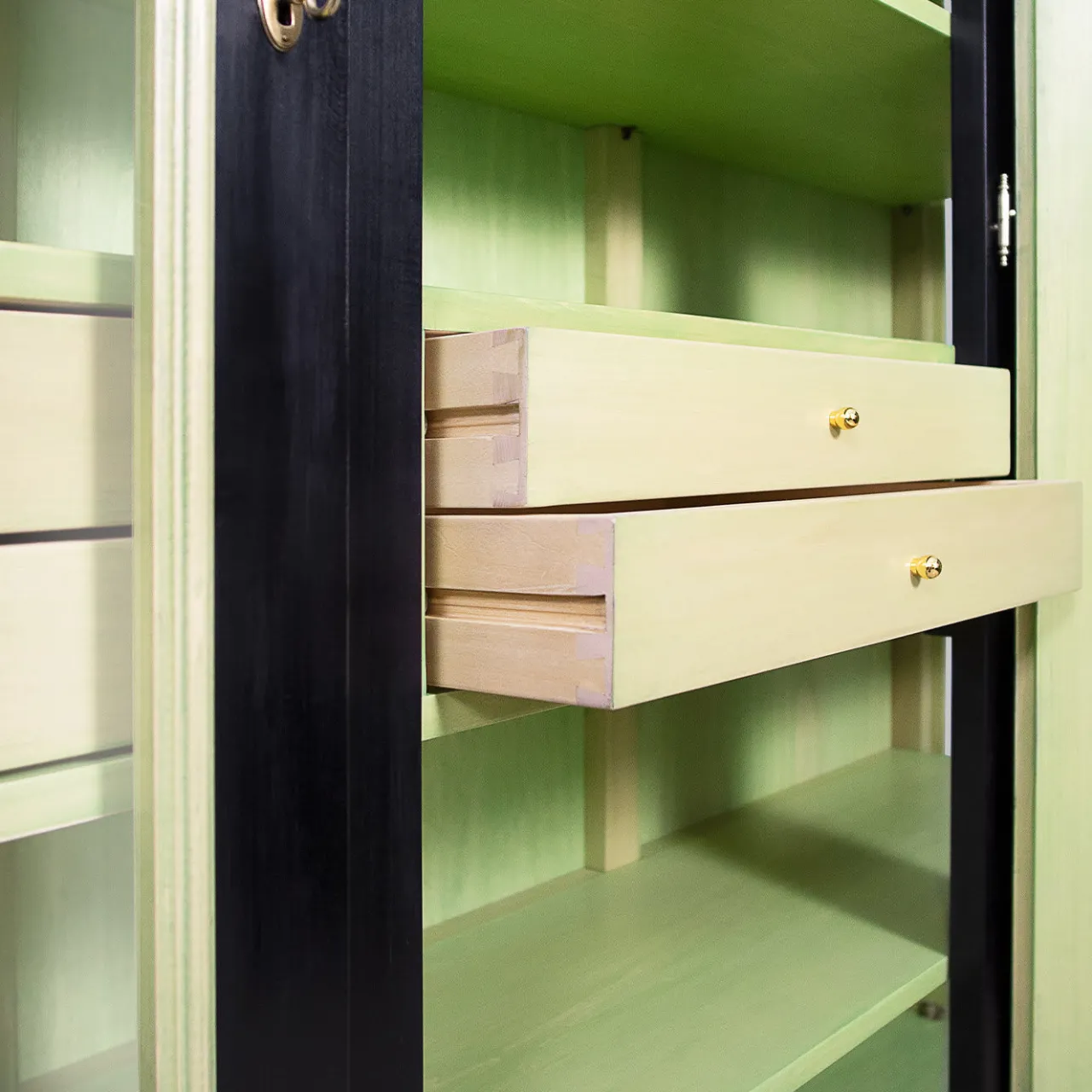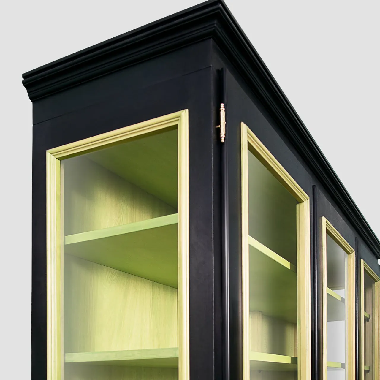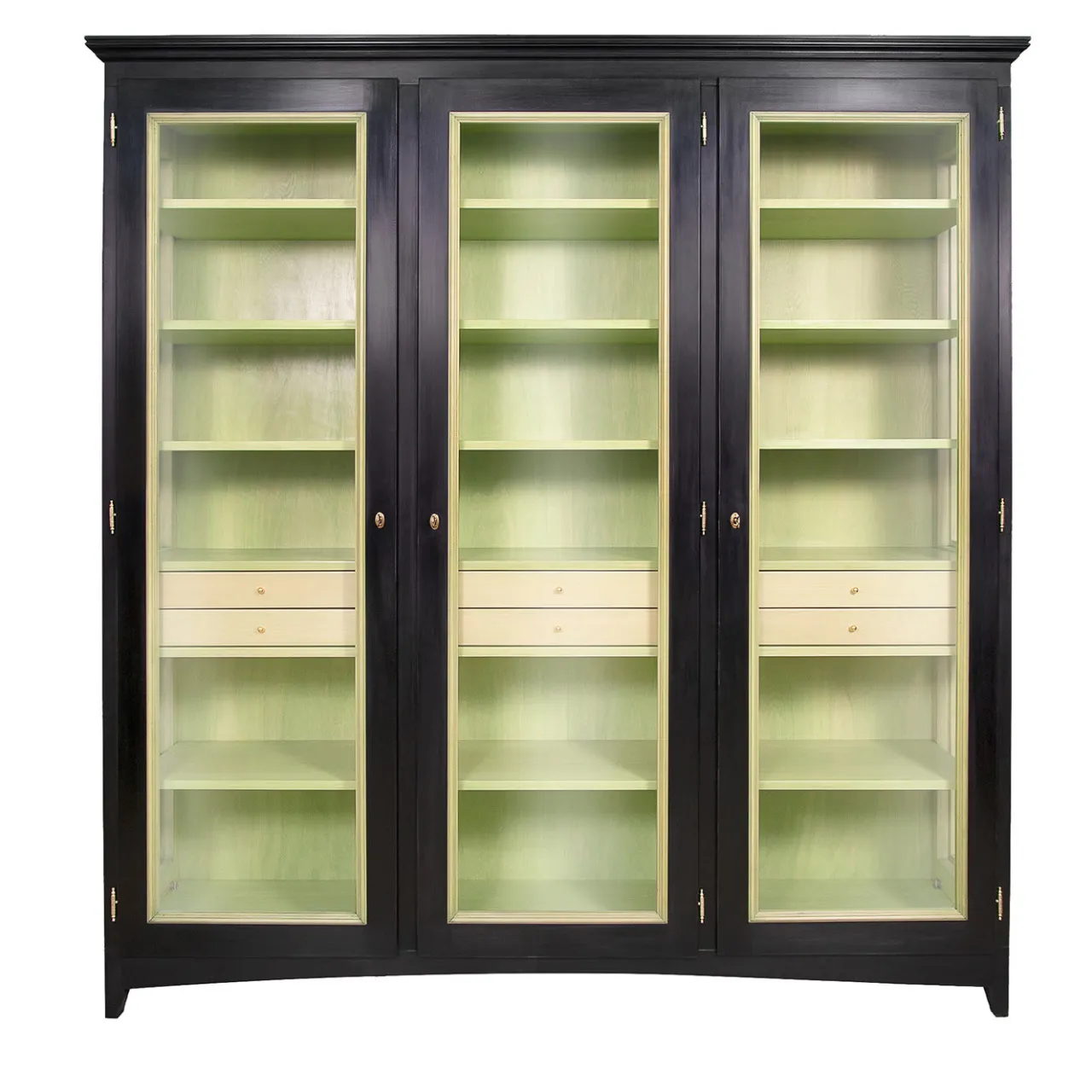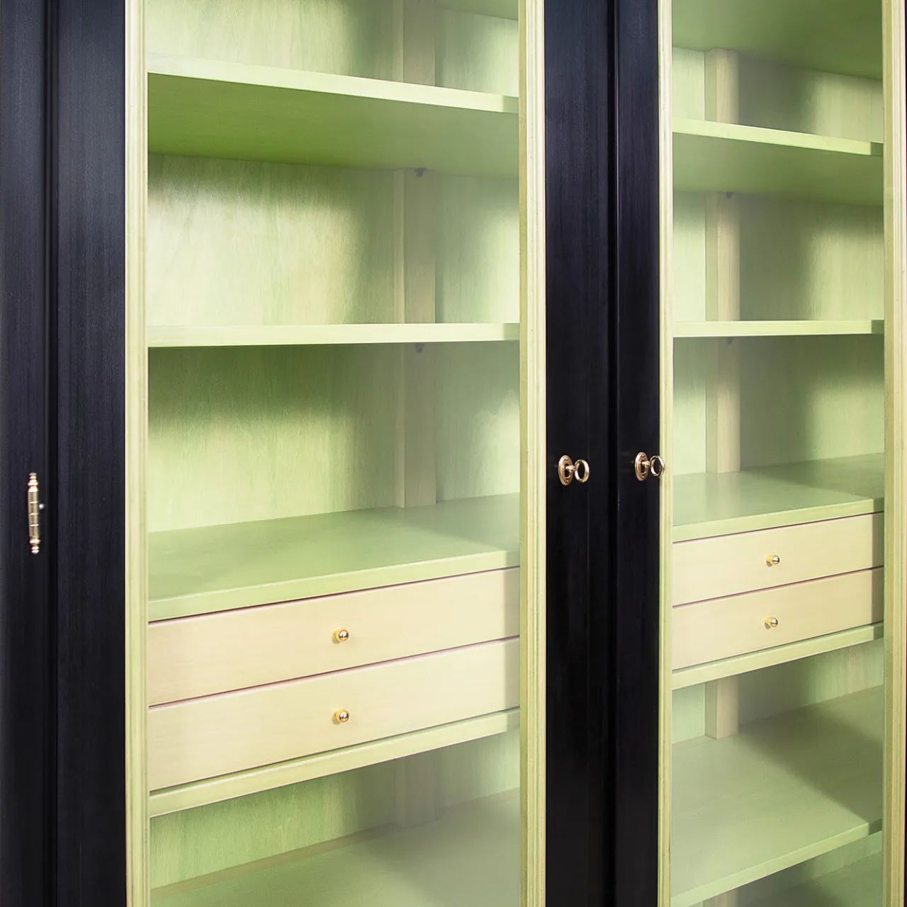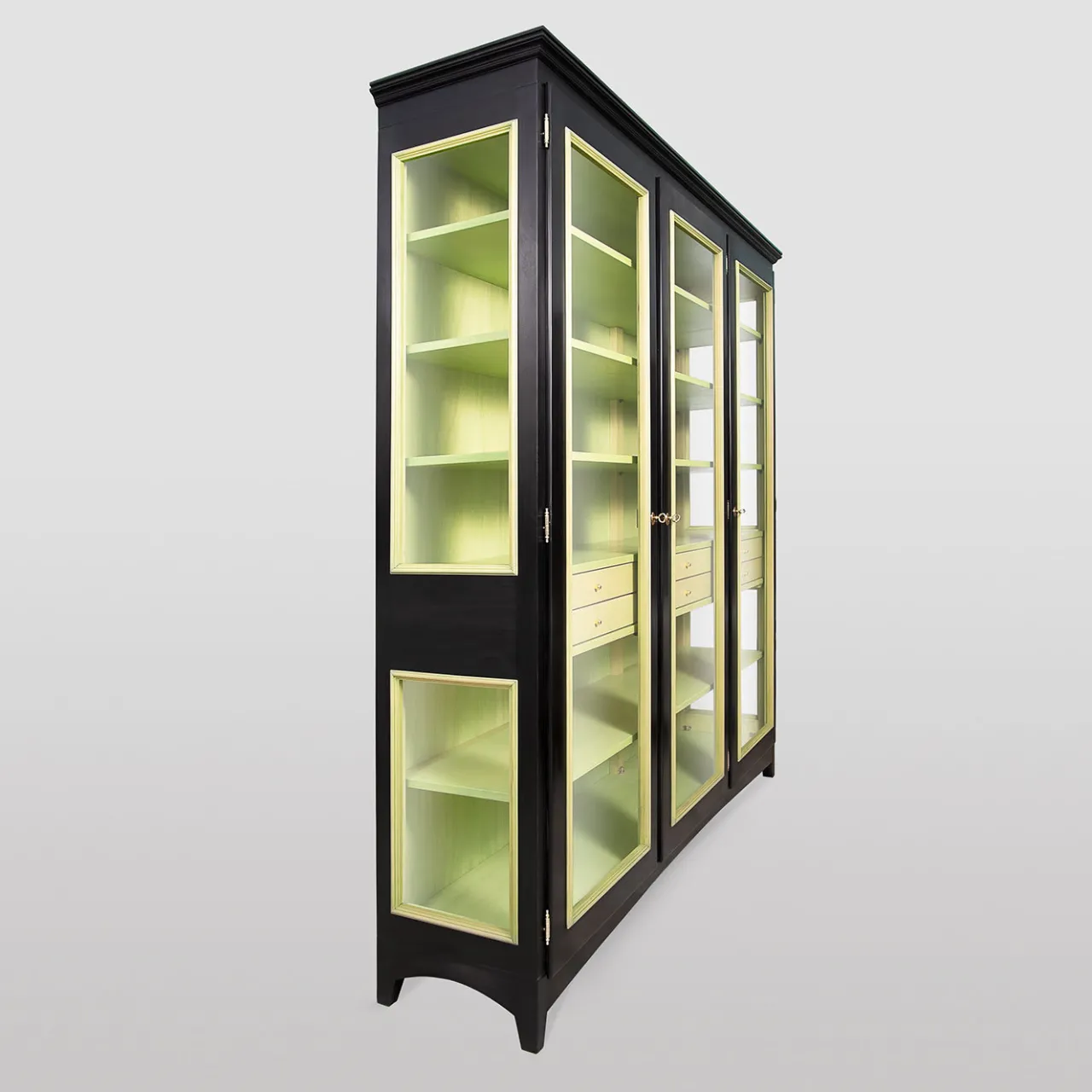Una vetrina dalle proporzioni equilibrate e di squisita fattura, questa vetrina ha una struttura in legno massiccio di tiglio con tre ante in vetro dotate di chiusura a doppio gancio (superiore e inferiore), che si aprono ciascuna per rivelare quattro ripiani e due cassetti. La finitura a contrasto – nera all’esterno e verde lime all’interno – è realizzata con vernici ecologiche atossiche a base d’acqua e un rivestimento finale in cera d’api è applicato a mano per dare un effetto satinato opaco. Richiede il montaggio (sono incluse istruzioni facili da seguire). Personalizzabile in altre dimensioni, essenze e finiture su richiesta.