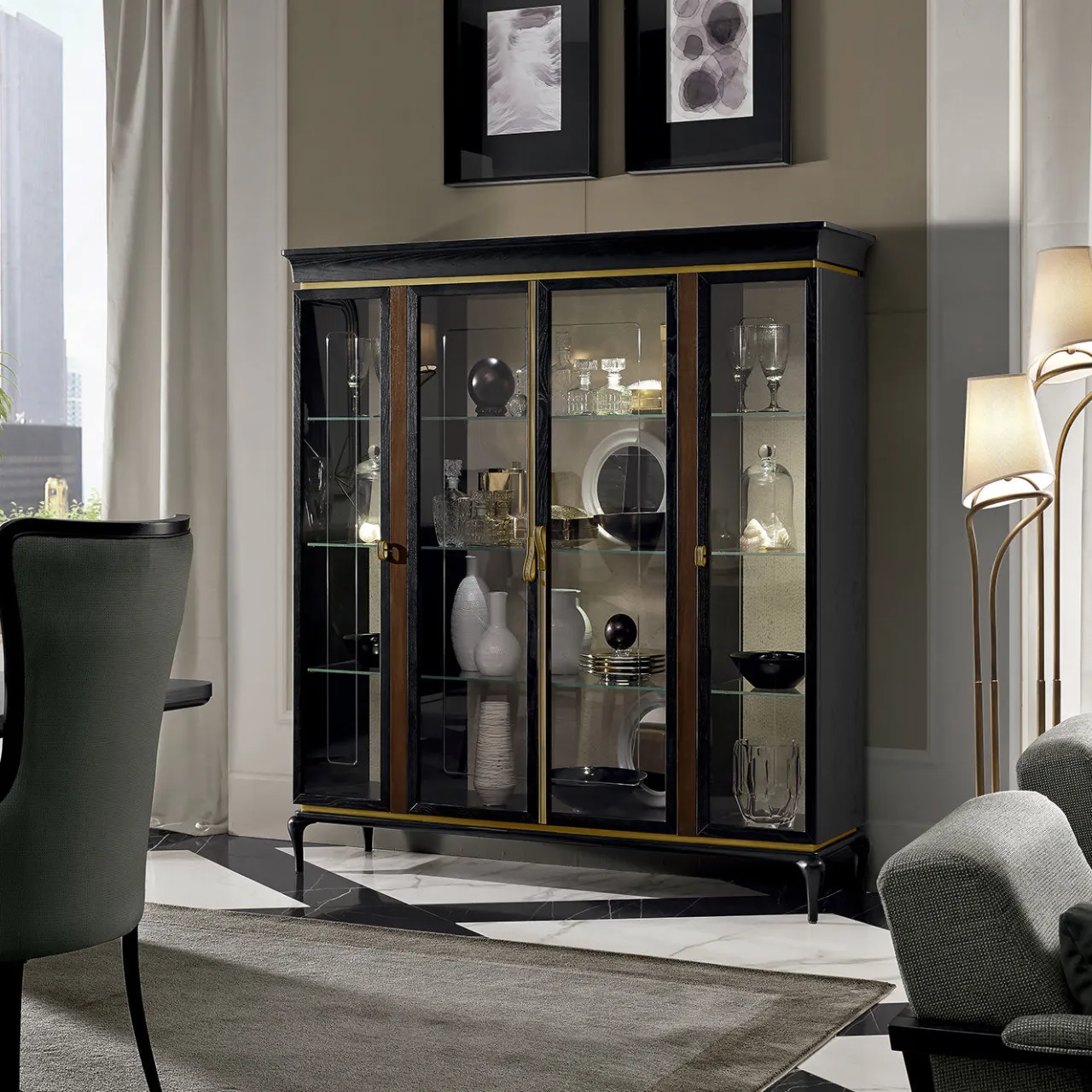 Sofisticatezza e funzionalità si fondono armoniosamente in questa splendida vetrina a quattro ante. Resistente e robusto, questo mobile è realizzato in MDF e compensato noce canaletto con profilo in ottone brunito, mentre la base è in frassino massiccio con finitura laccata nera. I pannelli delle porte e i ripiani interni sono in vetro e conferiscono al pezzo un aspetto brillante e affascinante.