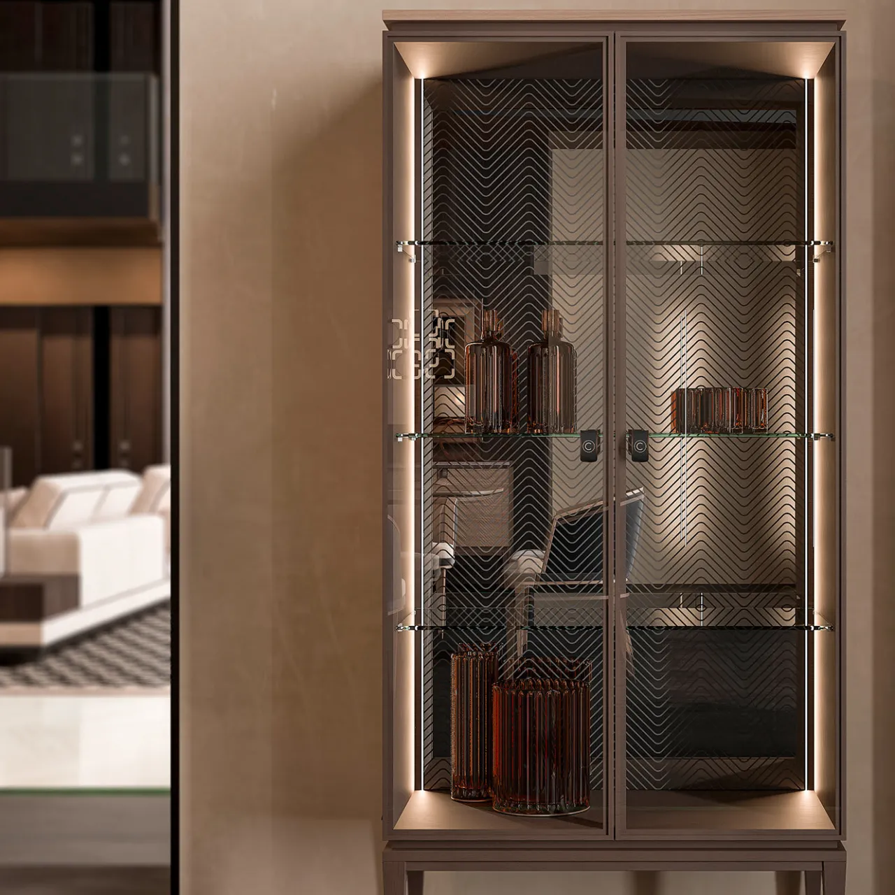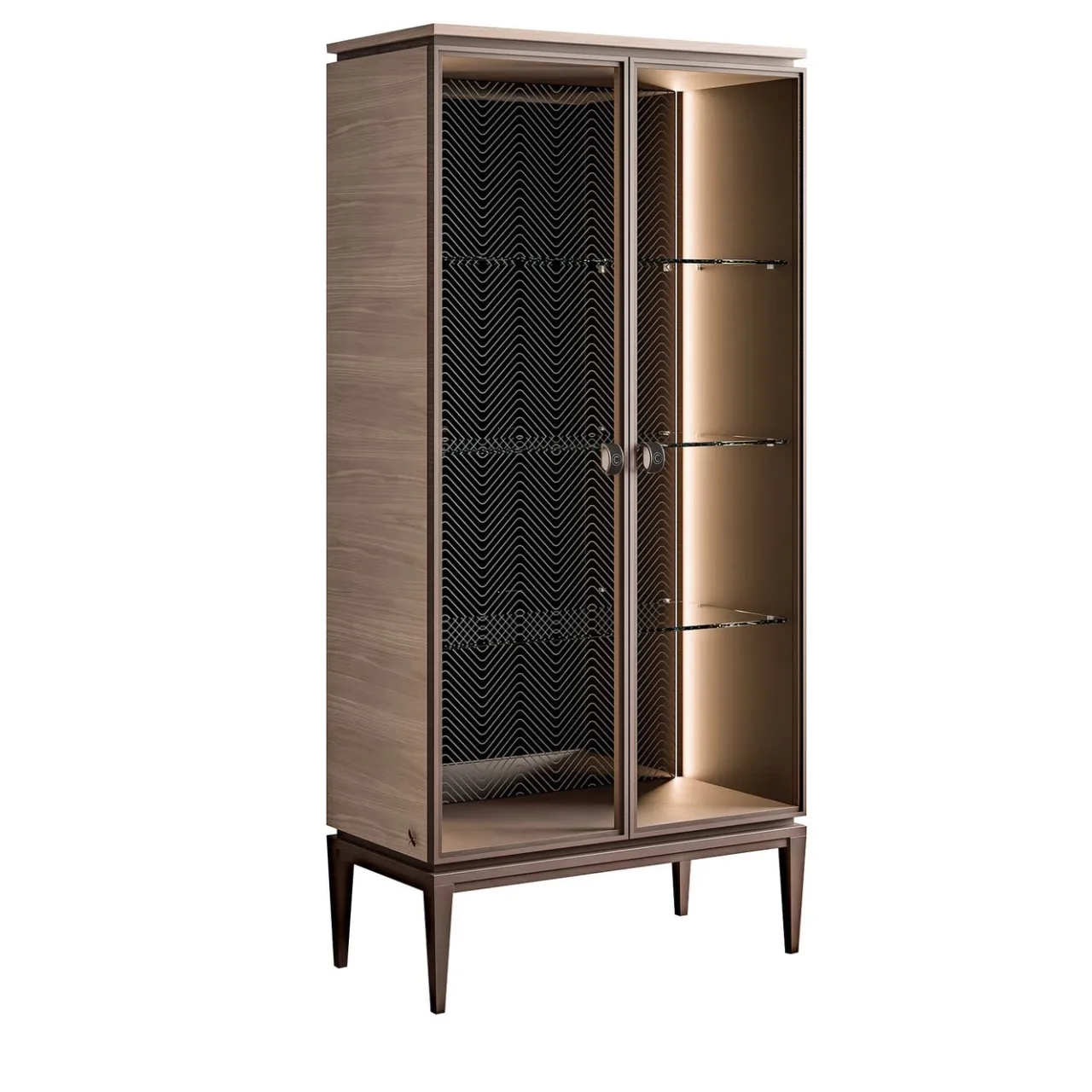 A completamento di una collezione completa di arredi per il soggiorno e la sala da pranzo, la Vetrina in vetro inciso presenta un’elegante incisione a zig-zag sul retro delle teche. Con tre ripiani in vetro e ante in vetro su una base in metallo, la vetrina è perfetta per esporre cristalli, sculture in vetro di Murano o altri oggetti preziosi.