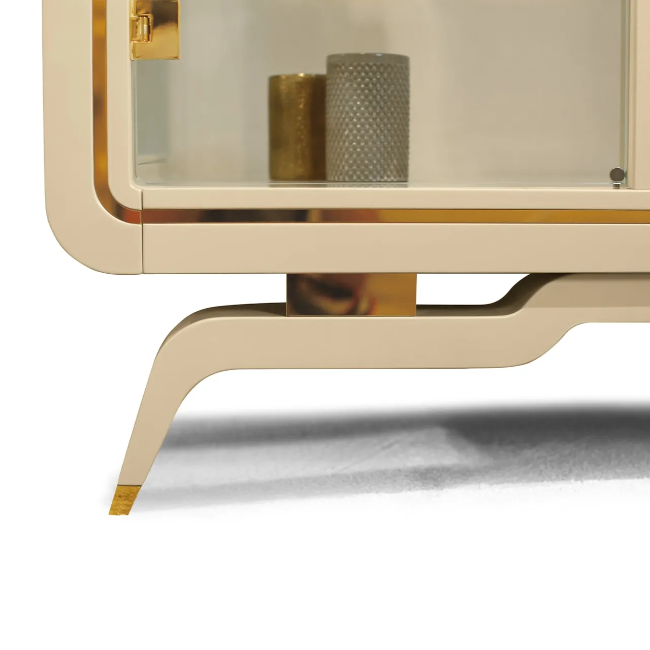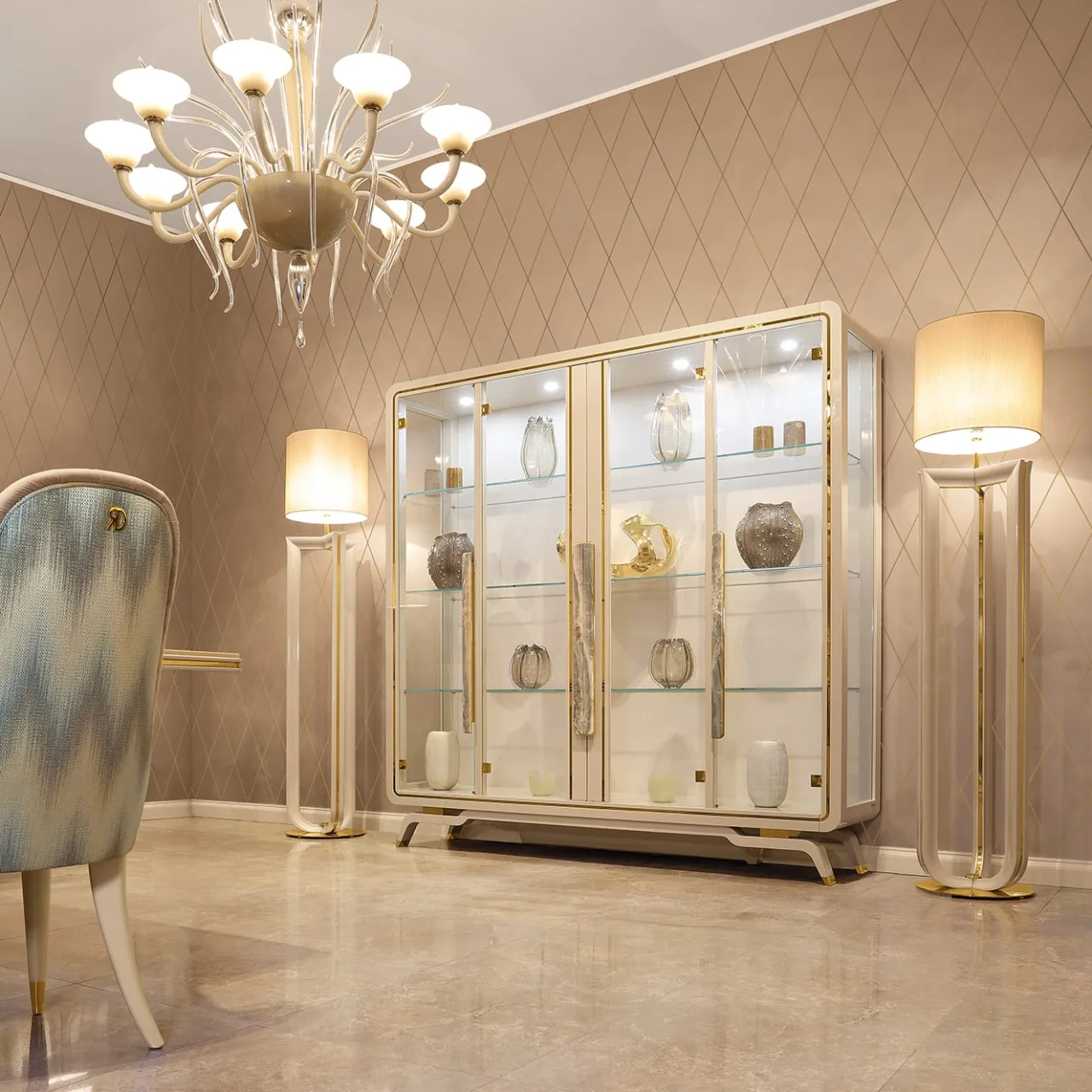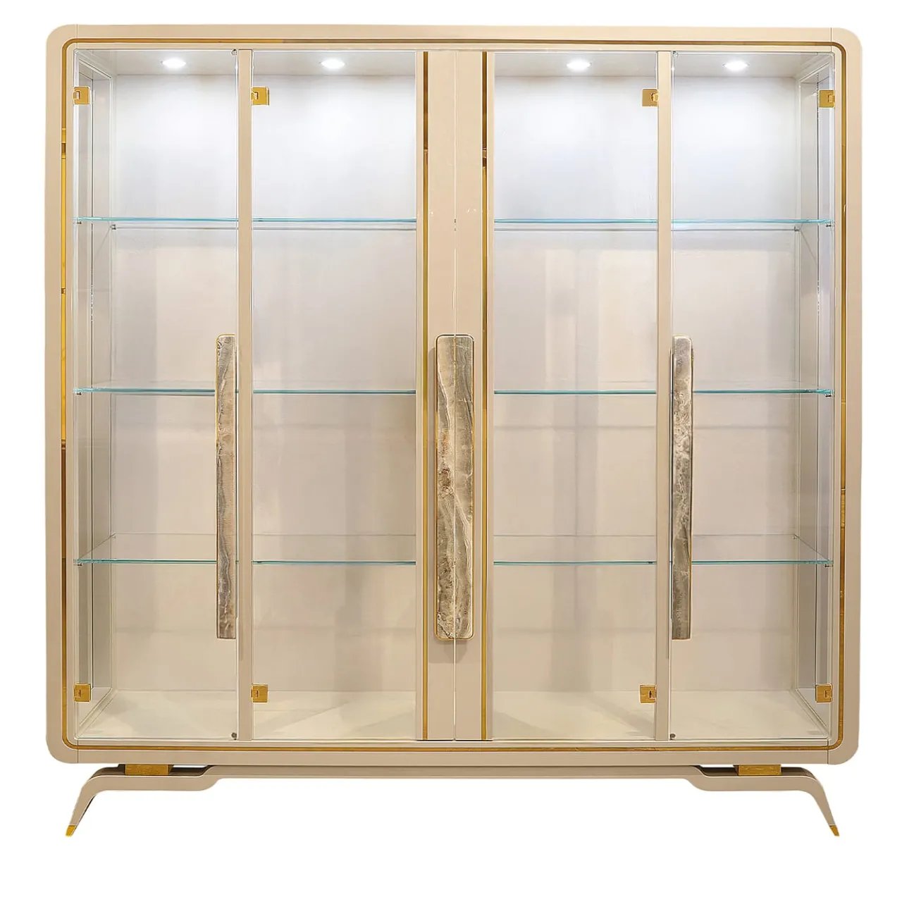 Una dichiarazione di eleganza, la vetrina della collezione Hanami presenta una struttura in legno con finitura laccata lucida Pearl Cappuccino, impreziosita da dettagli in metallo Gold Plus. Le quattro ante in vetro sono impreziosite da marmo Onyx e maniglie in metallo, mentre lo schienale rivestito in econabuk aggiunge un tocco di raffinatezza. Disponibile con quattro faretti LED per una migliore esposizione. Per le opzioni di personalizzazione, contattare il Concierge.