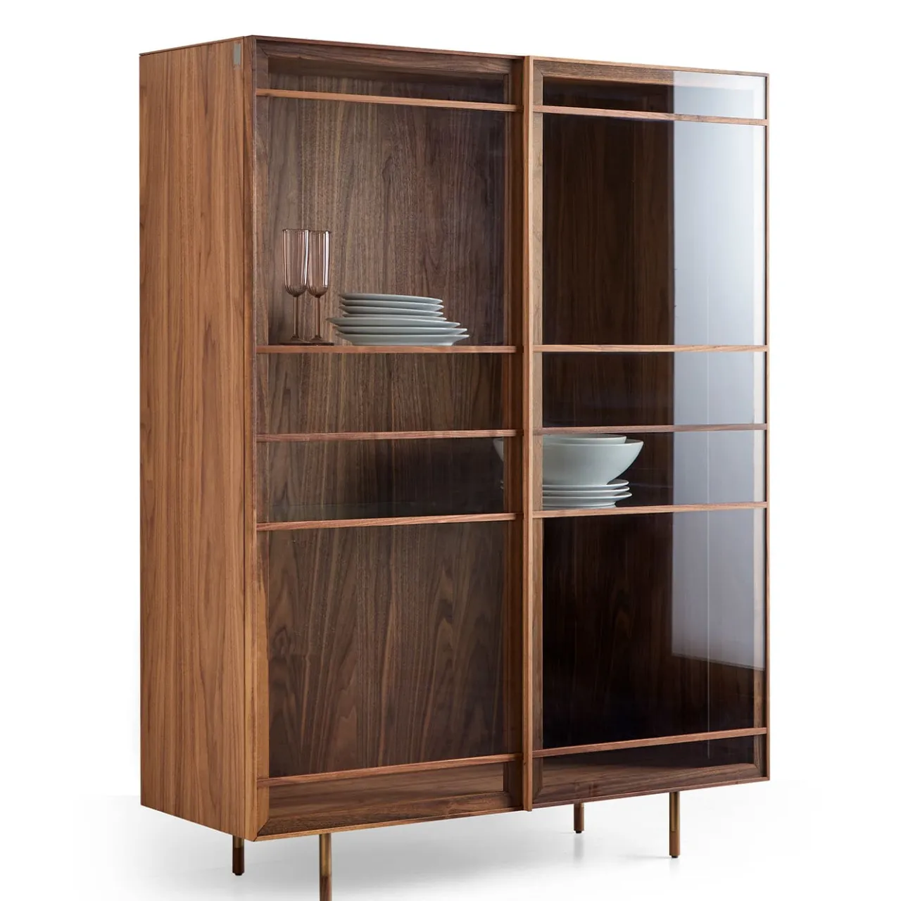 La vetrina York, con 2 ante e 2 ripiani interni in vetro, è interamente realizzata in legno di noce canaletto, sia per la parte posteriore che per quella interna. Il vetro delle ante è di colore naturale trasparente. Le gambe cilindriche sono in ferro verniciato bronzo e terminano con un puntale in legno massello dello stesso colore del mobile. L’apertura è resa possibile dalla maniglia in legno presente sull’anta destra. La vernice è un prodotto naturale a base d’acqua. È possibile aggiungere 2 sottili luci LED sui lati.