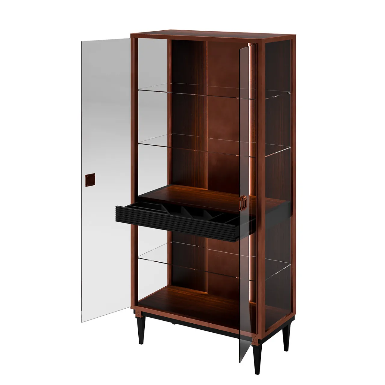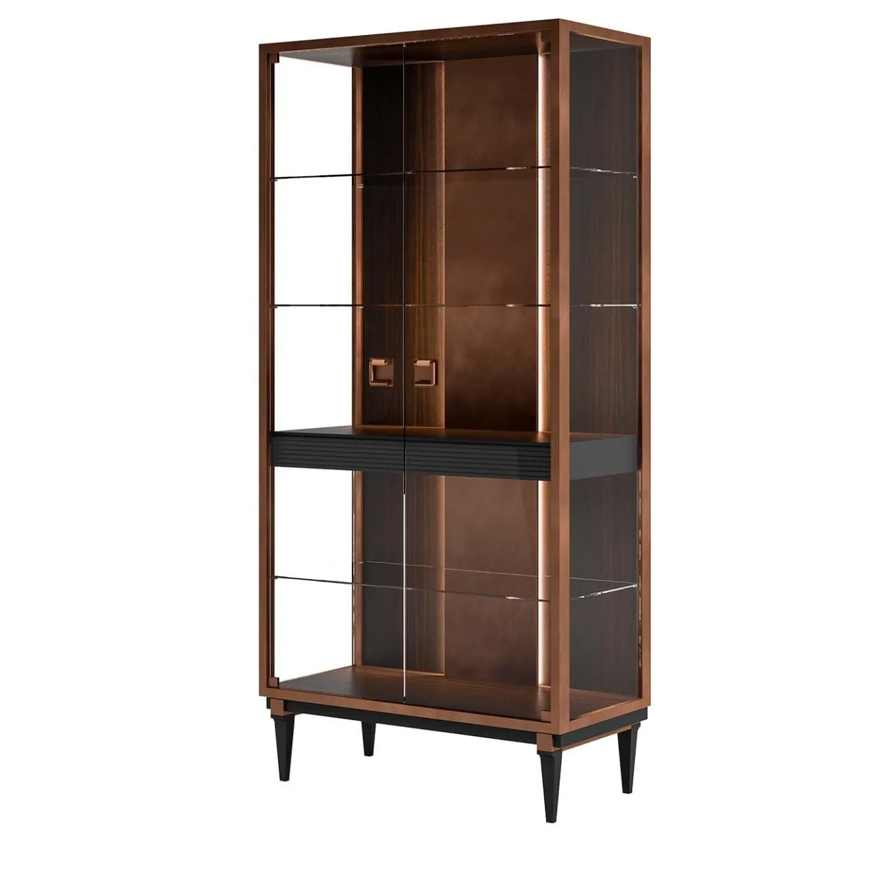 Ispirata alle tradizionali vetrine per le porcellane, questa sofisticata vetrinetta presenta una struttura rettangolare in impiallacciatura di eucalipto forestale sollevata su quattro gambe affusolate con finitura nera. Entrambi i lati e le porte sono dotati di pannelli in vetro. All’interno il mobile è dotato di tre ripiani in vetro e di un cassetto centrale nero. I pomelli in metallo spazzolato-rame presentano il logo dell’azienda, un dettaglio sofisticato che rende questo mobile degno di nota una splendida aggiunta a soggiorni e sale da pranzo sia classici che moderni.
