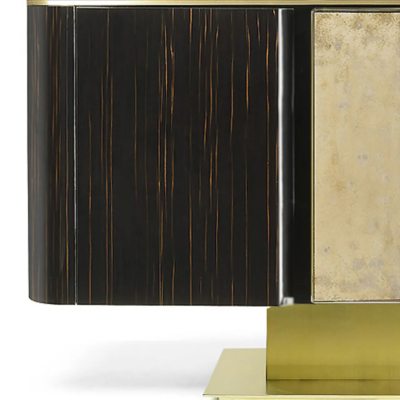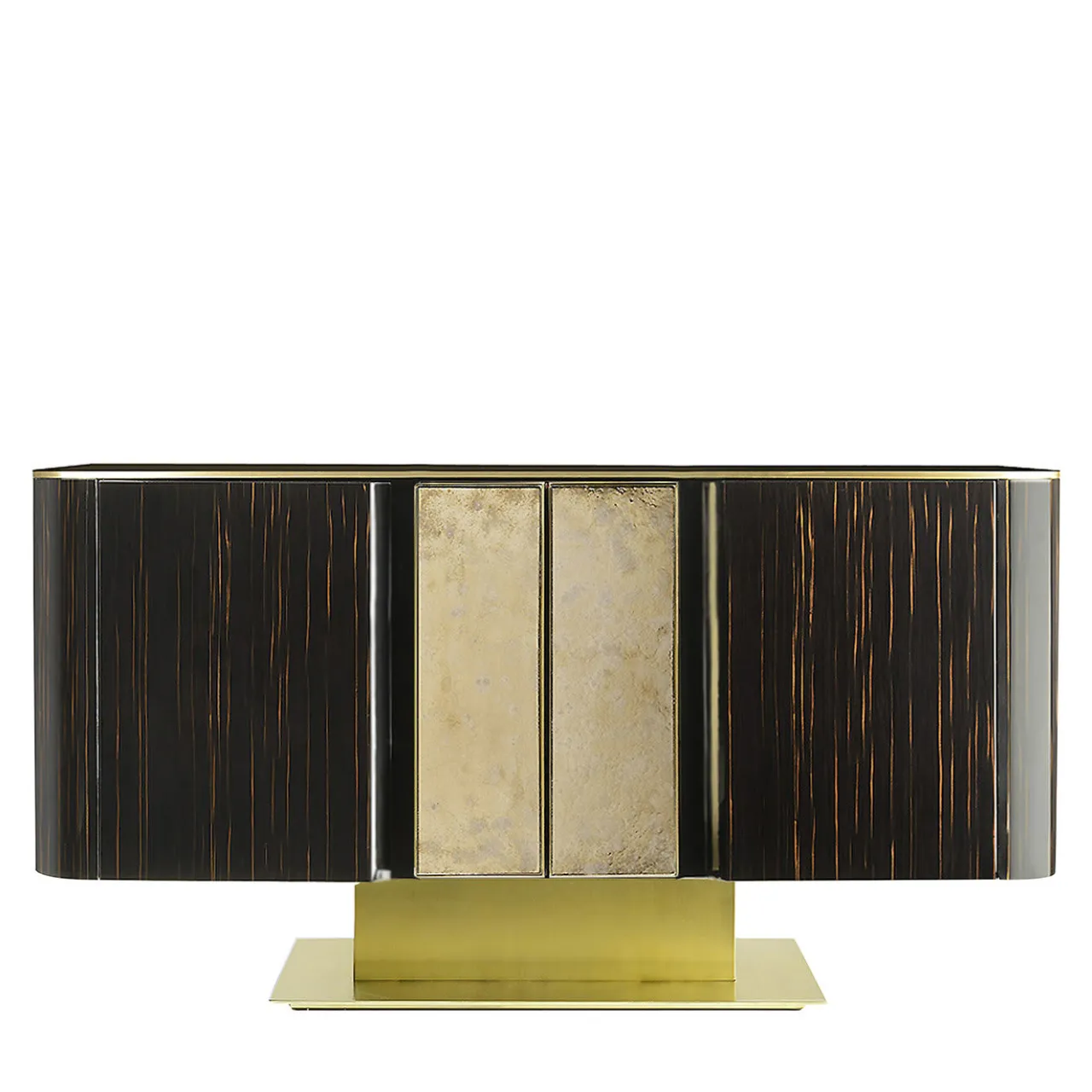 Questa sofisticata e sontuosa credenza disegnata da Studio 63 per Marioni è realizzata principalmente in legno e presenta una base in metallo e doppie ante nere con elementi in ceramica. L’interno è caratterizzato da ripiani in vetro extra chiaro. Su richiesta, il pezzo è disponibile in diversi materiali e colori.