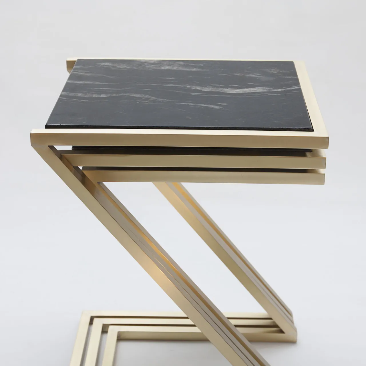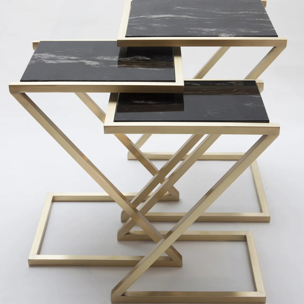 Questo set di tre magnifici tavoli è stato realizzato da abili artigiani italiani e presenta strutture in ottone spazzolato e piani in marmo nero Marquina. Sono disponibili anche in diversi metalli e finiture e i piani in marmo possono essere sostituiti con legno o vetro su richiesta. Questi tavoli possono essere accostati tra loro o esposti separatamente per ottenere look diversi.
