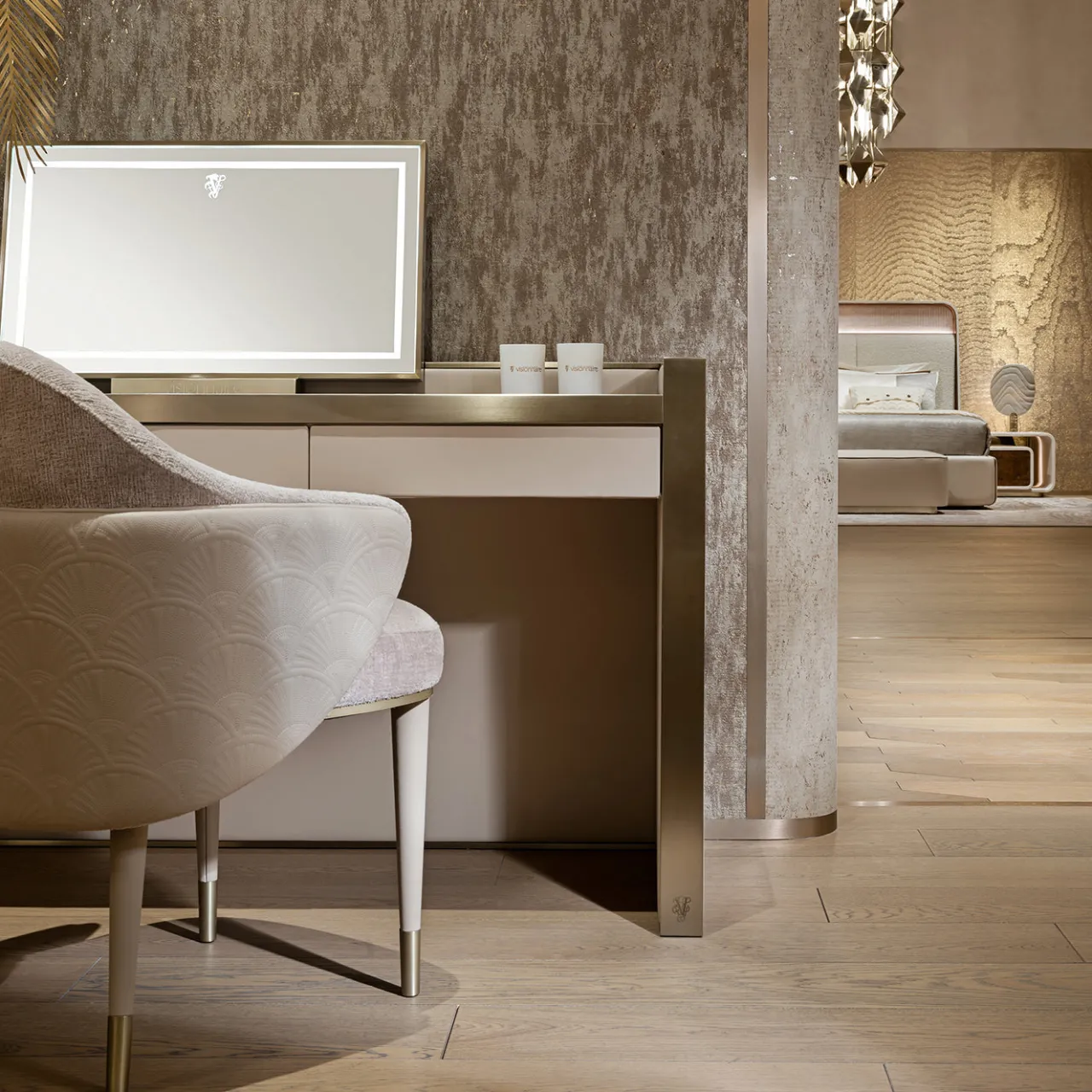La sedia Adele emana un’eleganza senza tempo grazie alla sua struttura esterna in acciaio satinato. La seduta e lo schienale sono rivestiti in un lussuoso tessuto beige, mentre il retro, i bordi e le gambe sono rivestiti in pelle pregiata. Le punte in metallo satinato oro sulle gambe aggiungono un tocco di raffinatezza, rendendo questa sedia un’aggiunta sofisticata a qualsiasi sala da pranzo o spazio abitativo di lusso.