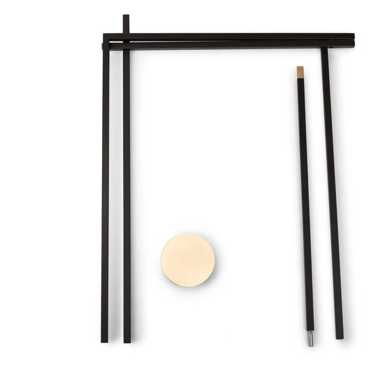 Questo squisito pezzo di arredamento funzionale è una scultura minimalista che può essere utilizzata come appendiabiti. È composto da linee che si incrociano, bilanciandosi l’una sull’altra e creando un forte senso di geometria e materia. Questo sistema modulare si adatta a tutti gli ambienti e la sua squisita fattura valorizzerà qualsiasi arredamento. La struttura in ferro completa gli elementi circolari in ottone che possono essere utilizzati come mini-scaffale per esporre piccoli oggetti personali. Questo pezzo può essere smontato e i suoi elementi possono essere ridotti in un piccolo pacchetto. Progettato da Marco Zito.
