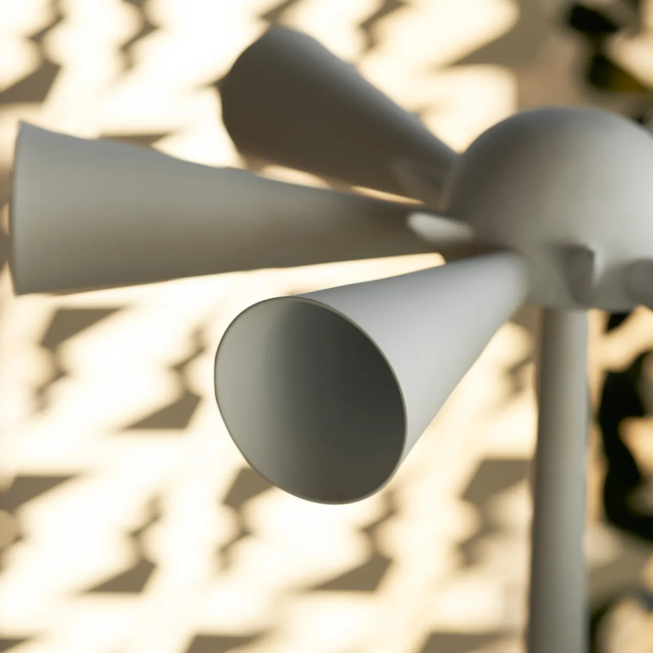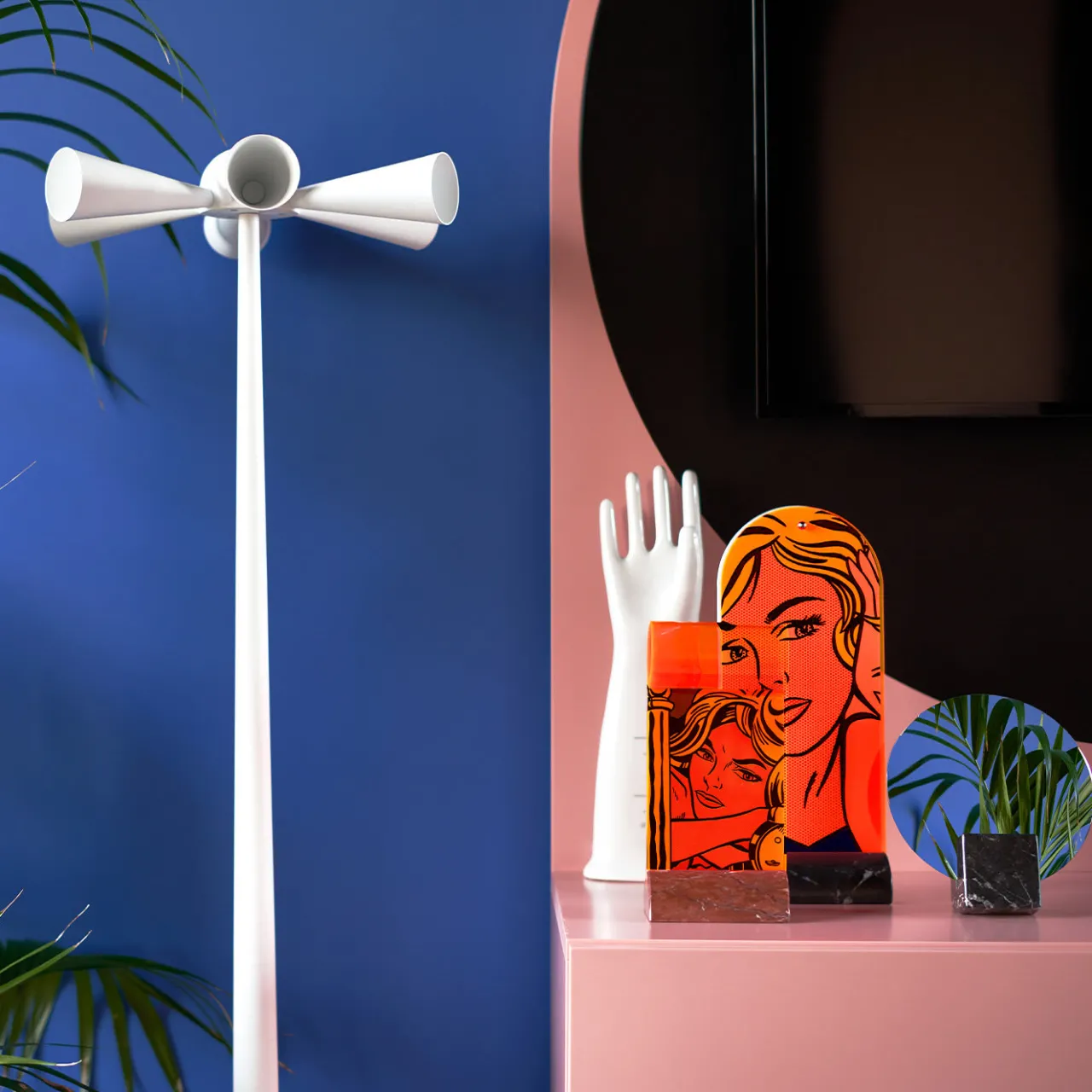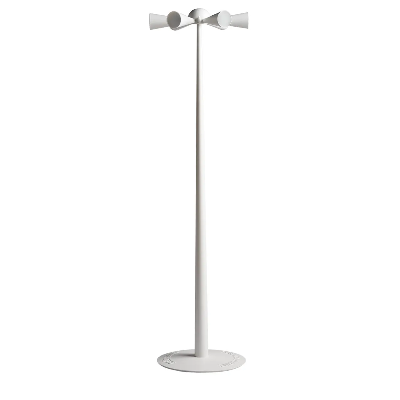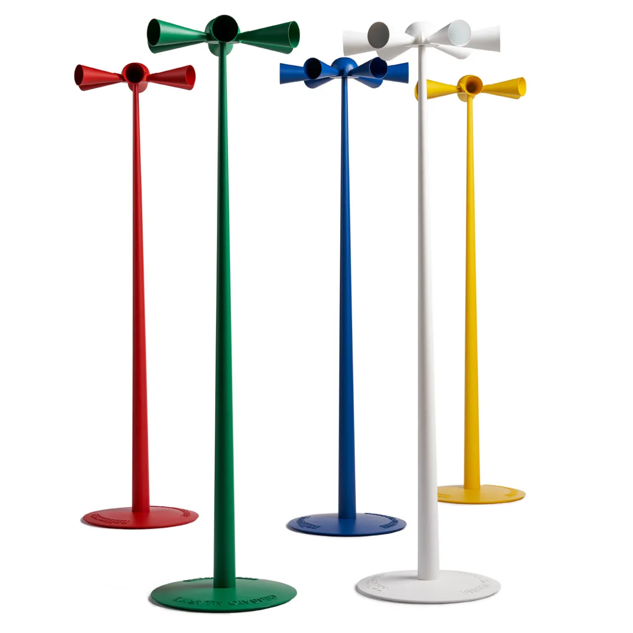Progettato nel 1986 da DDL e lanciato da Poltronova nel 1991, questo appendiabiti prende il nome dal suo concetto di fondo: la frase italiana che significa “Allarme finito”. Realizzato in alluminio laccato bianco, presenta una serie di appendiabiti a tromba che ricordano la fine della guerra. Caratterizzato da uno stile moderno, pulito e allegro, è completato da uno stelo in ferro e da una base rotonda in alluminio, il tutto rifinito con una vernice bianca a base d’acqua.