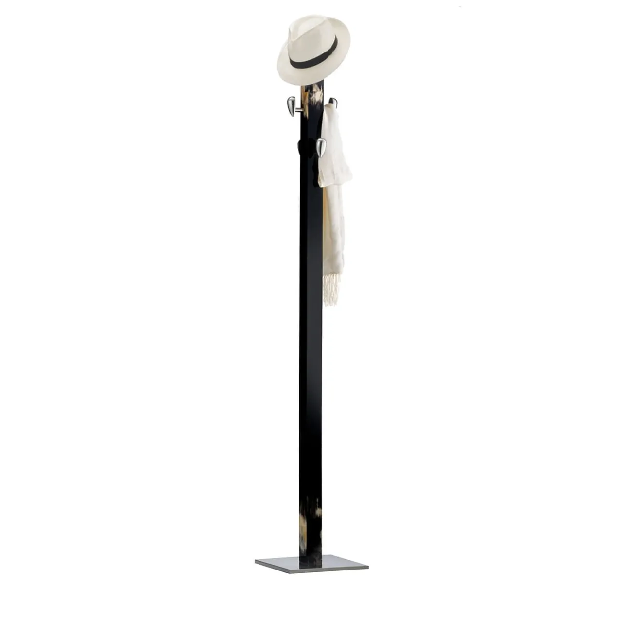 Questo pezzo esclusivo ed elegante combina materiali e design di lusso con una silhouette pulita e contemporanea. La struttura alta in legno nero laccato, che si erge da una base quadrata in ottone cromato, è arricchita nella parte superiore e inferiore da dettagli in corno scuro con squisite sfumature frutto di una tecnica di lavorazione esclusiva. Cinque pomelli a forma di uovo in ottone cromato offrono un posto elegante e comodo per appendere cappotti, cappelli e accessori. La qualità scultorea di questo appendiabiti lo renderà un raffinato e moderno accento decorativo anche quando è vuoto.