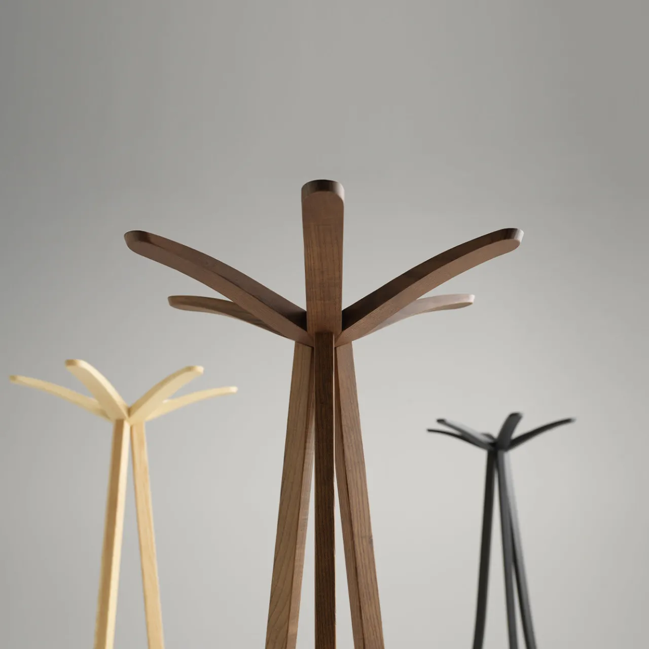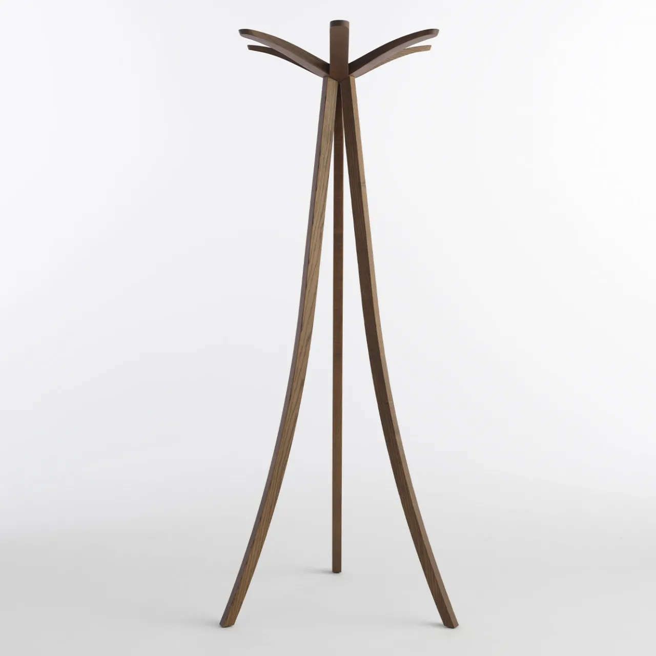 Questo appendiabiti è un pezzo squisito di arredamento funzionale, caratterizzato da una scultura minimalista, che si adatta a spazi residenziali e commerciali. Realizzato in legno di frassino tinto noce, la sua struttura a tre gambe si collega alle estremità, formando dei pioli per appendere cappotti e accessori.