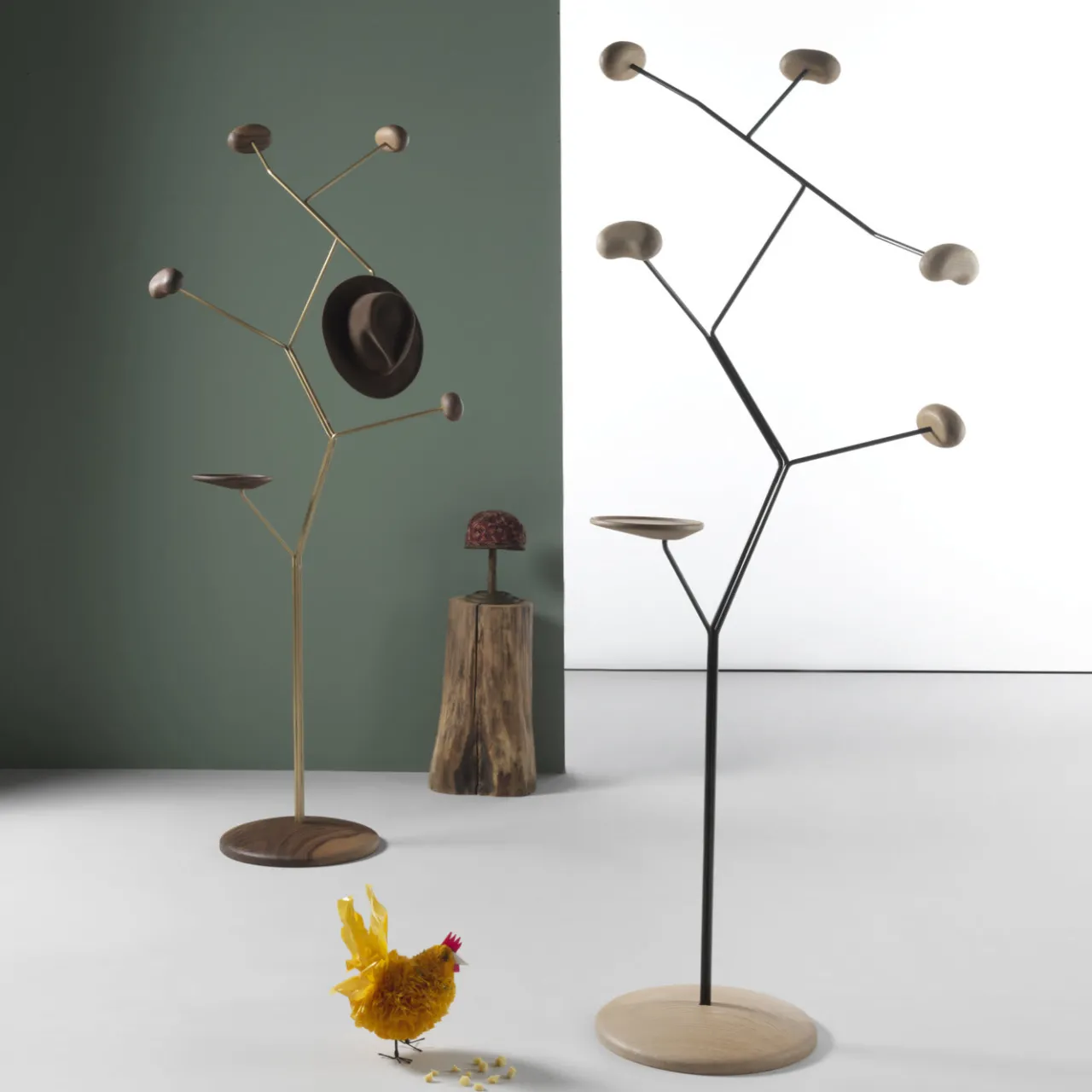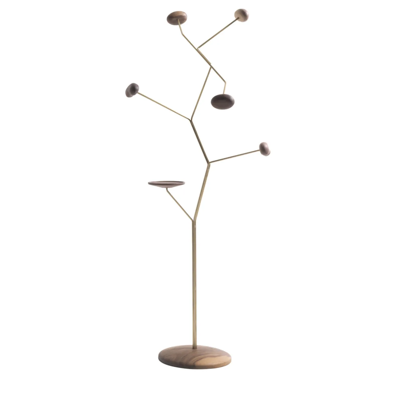 Questo suggestivo appendiabiti evoca poeticamente i primi germogli che compaiono poco prima della fioritura. La struttura è una scultura stilizzata con base e puntali in legno massello di noce canaletto e struttura in ferro con finitura in ottone. Sono disponibili altre configurazioni: legno di rovere con ferro laccato e legno di pino con ferro laccato.