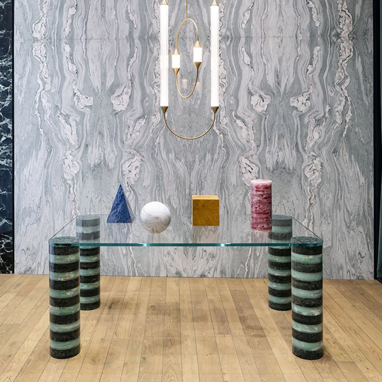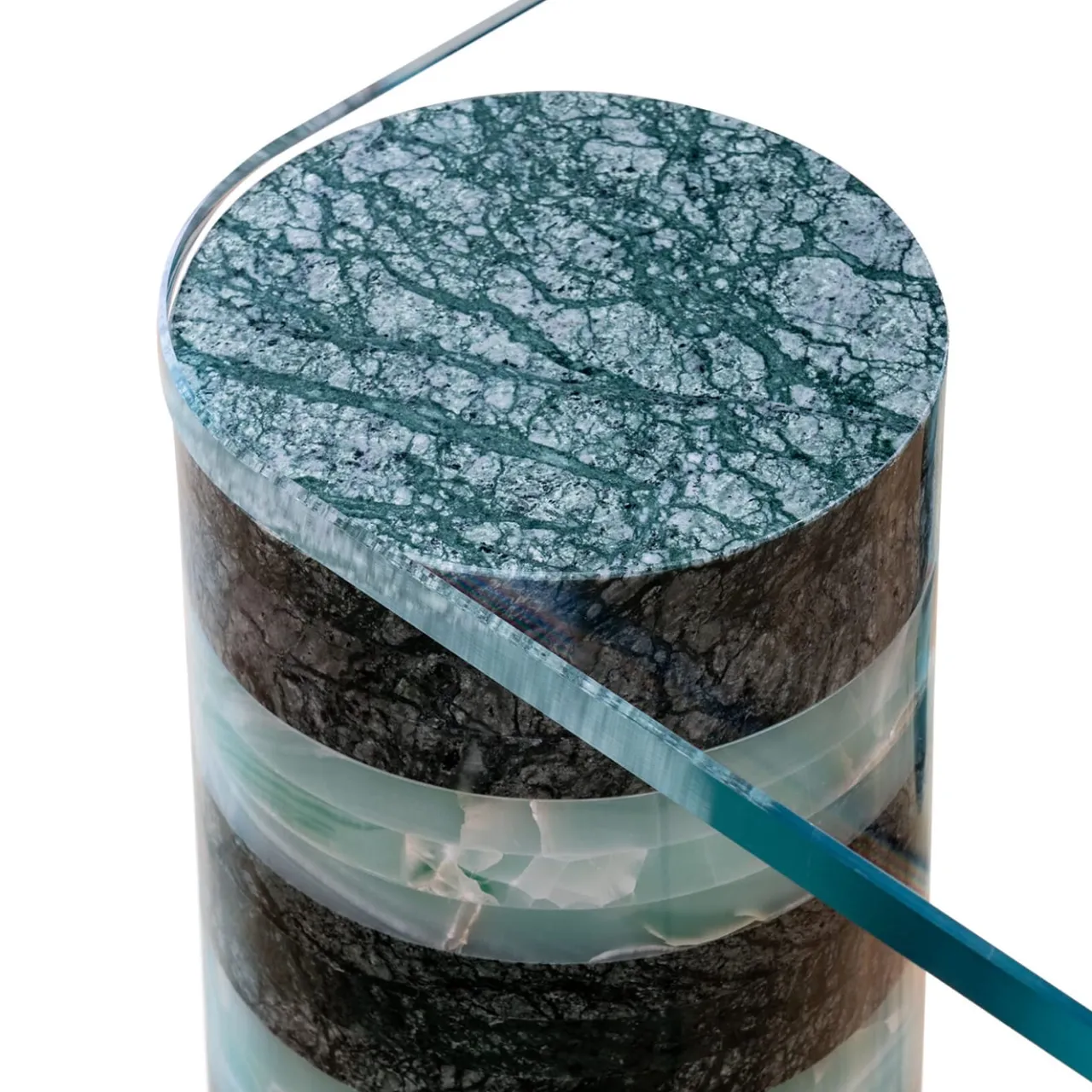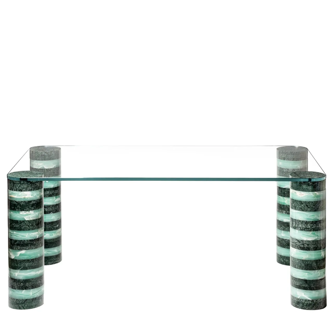 Il tavolo Architexture Living Table 01 è composto da quattro gambe a colonna, formate da anelli alternati in marmo Verde Guatemala e Onice Menta Aquarel. Il marmo verde monocromatico, privo di venature, contrasta con la luminosità e la delicata “nuvolatura” dell’onice verde chiaro. Il piano rettangolare in vetro extrachiaro segue le forme delle gambe, lasciando trasparire il primo cerchio Verde Guatemala della colonna.