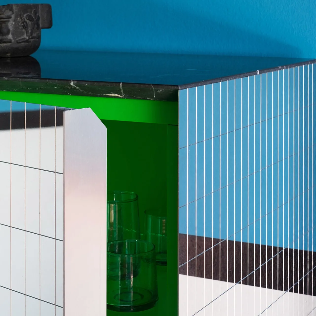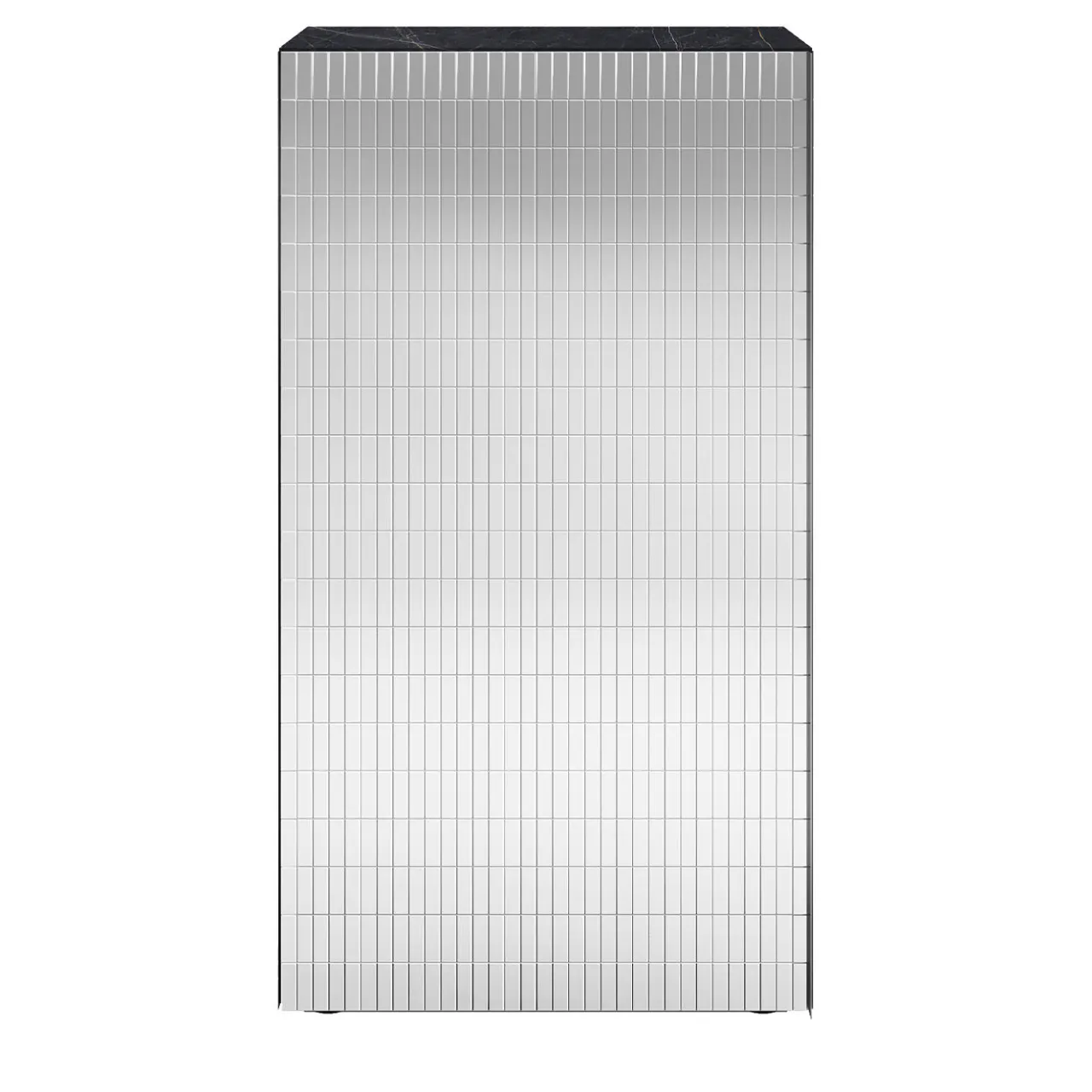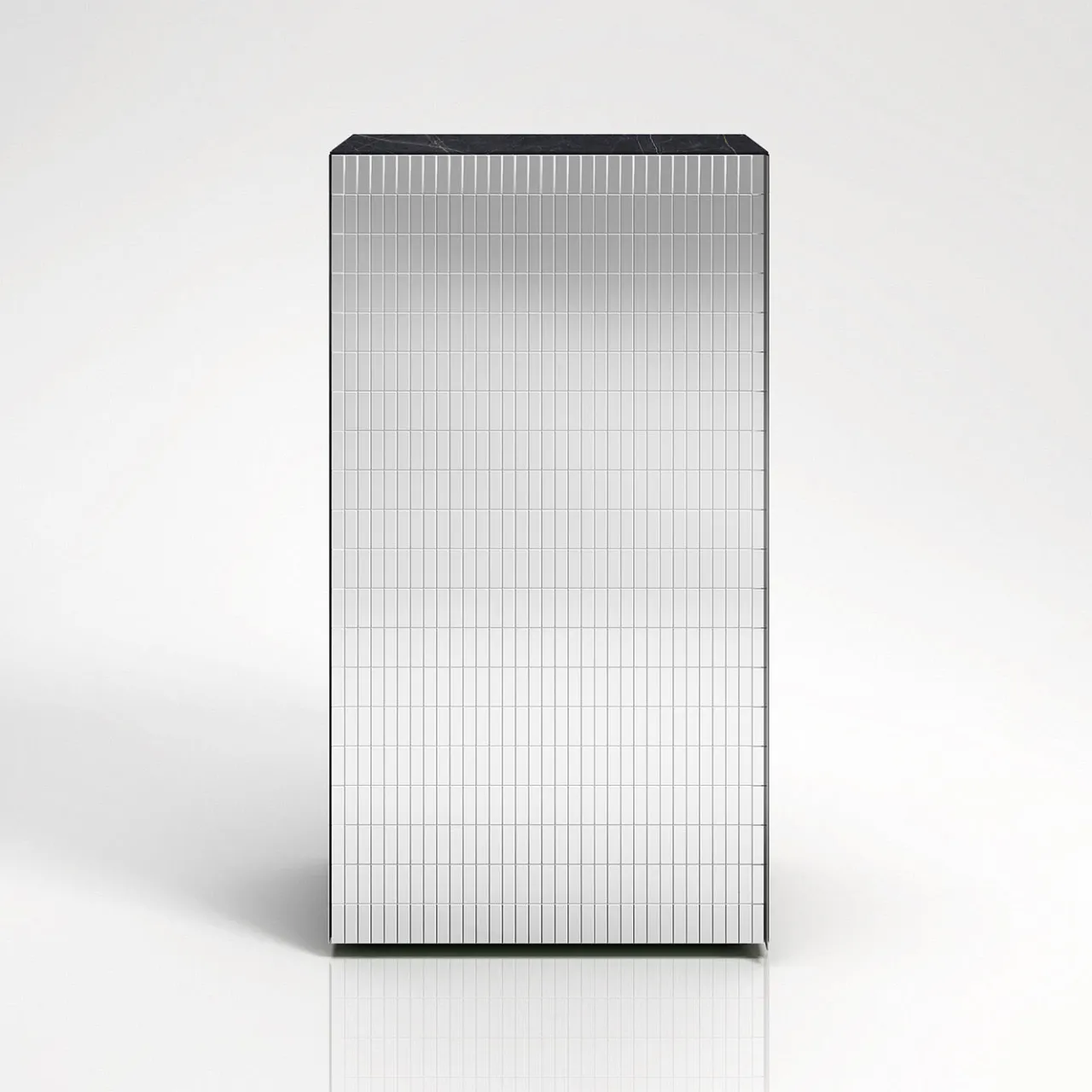 Mobile con anta e pannelli laterali in acciaio cromato, piano in marmo New Saint Laurent e interno in legno laccato. Le superfici a specchio frammentate creano un effetto illusorio, lasciando che il pezzo venga percepito soprattutto attraverso l’ambiente che riflette. Il ripiano interno regolabile in vetro permette di utilizzare il mobile come mobile bar o come contenitore multifunzionale.
