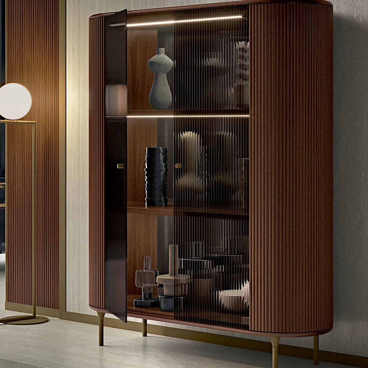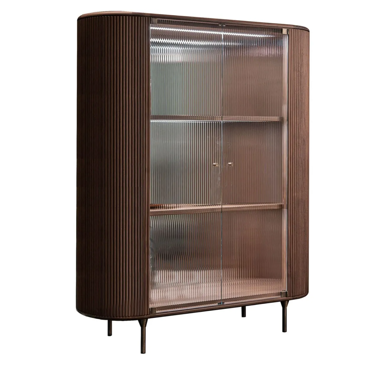 Questo superbo mobile vanta un fascino ipnotizzante grazie all’ampio design canalizzato lungo l’esterno, a una coppia di ante in vetro e ai lati arrotondati della struttura in noce americano. Le strisce LED all’interno permettono di creare effetti di luce ipnotici e di identificare facilmente gli oggetti disposti sui ripiani in legno. Poggiato su piedini in ottone brunito, è disponibile in diverse varianti di colore.