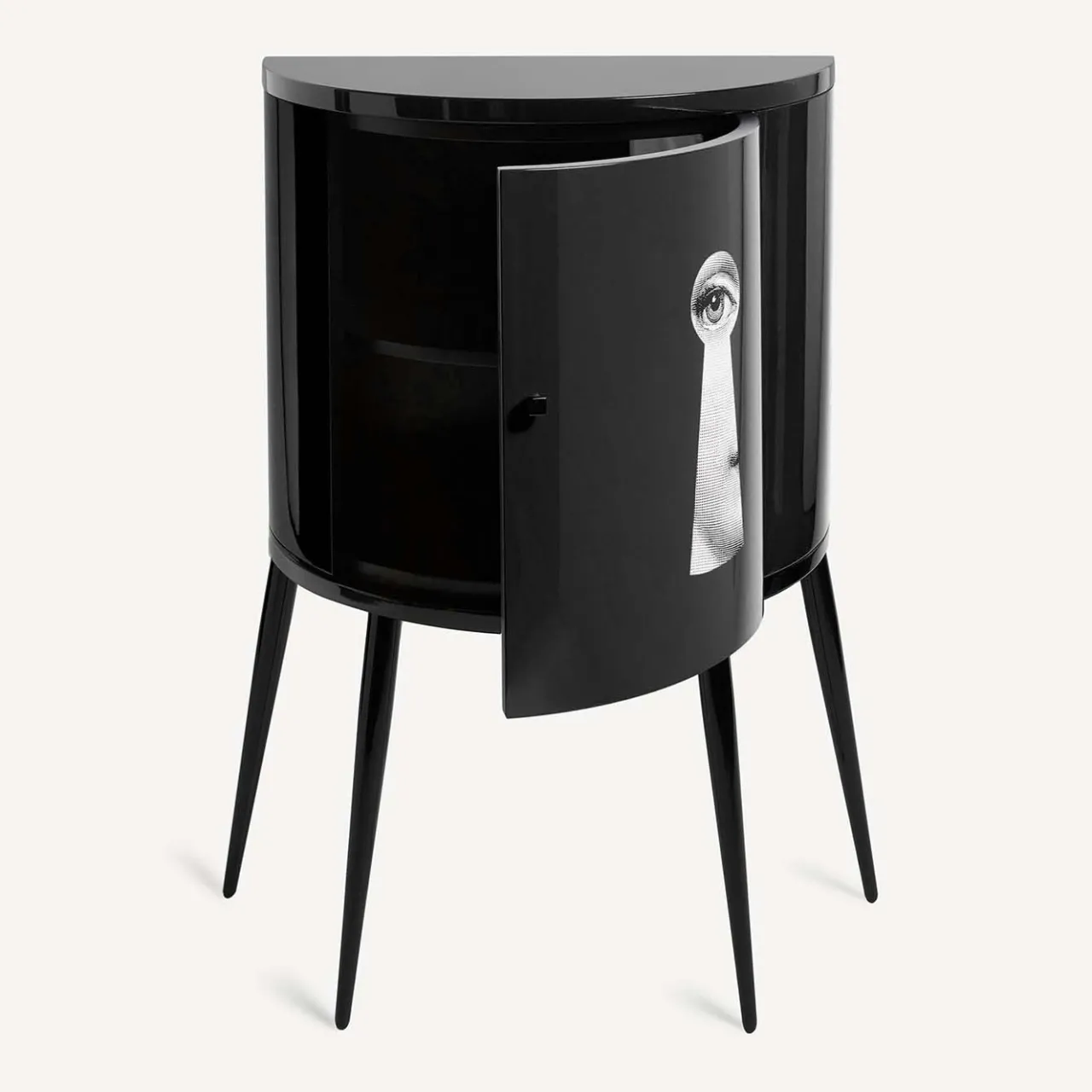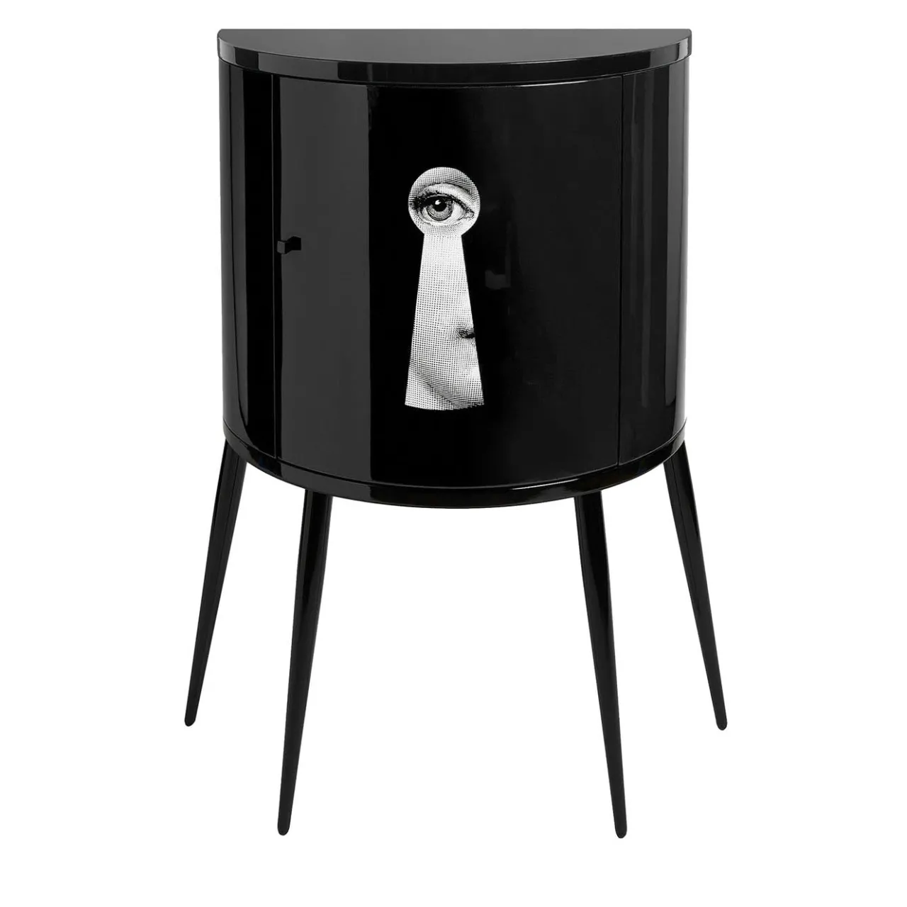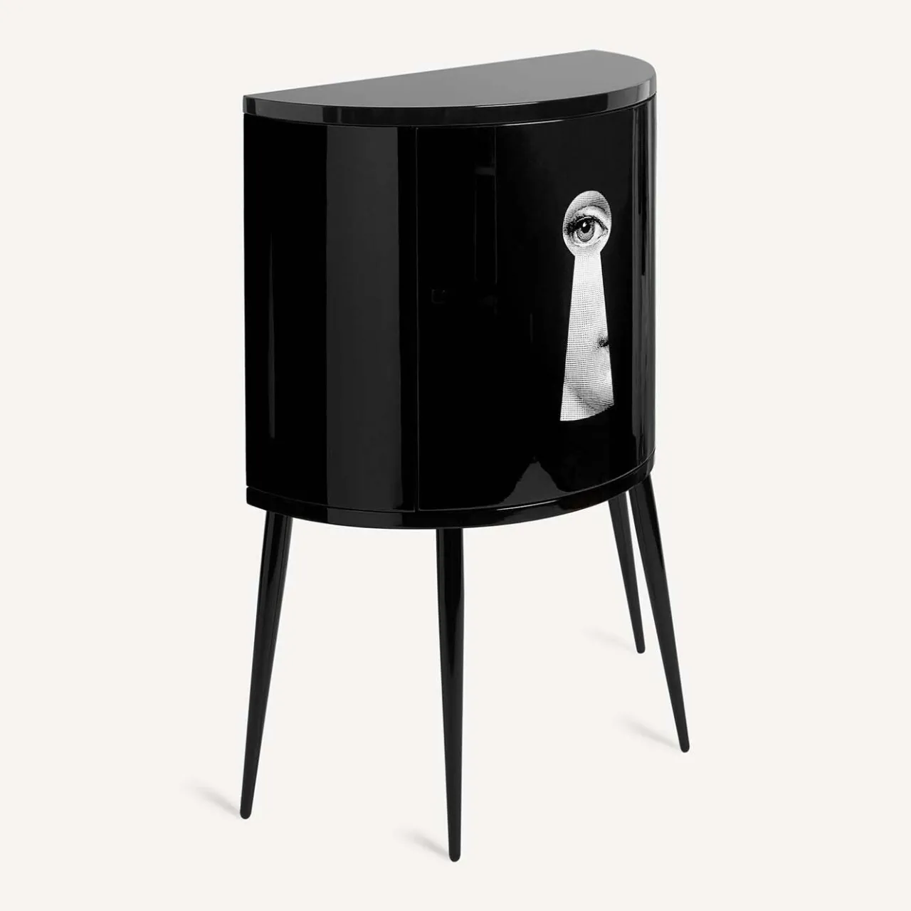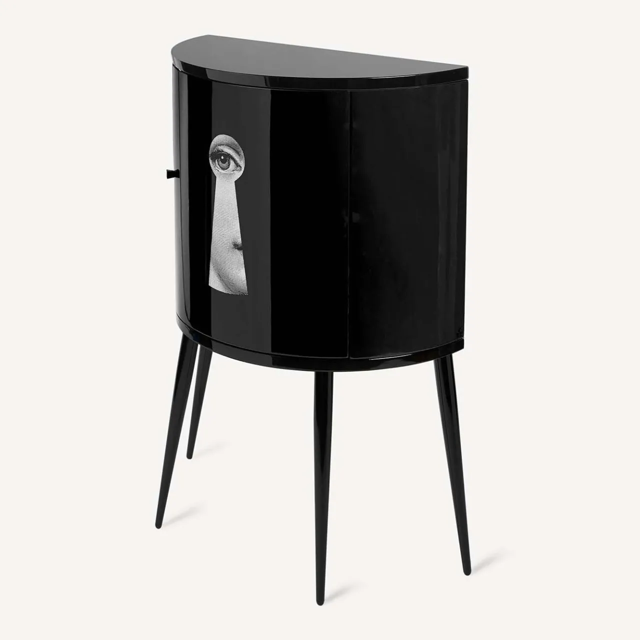 Il mobile Fornasetti è un mobile contenitore in legno serigrafato, dipinto e laccato a mano secondo il metodo tradizionale dell’Atelier. Il motivo Serratura proviene dalla serie iconica Fornasetti Tema e Variazioni. Come ogni oggetto Fornasetti, anche il mobile Serratura è un pezzo unico e ogni piccola discrepanza tra creazioni simili è frutto della lavorazione artigianale. Il piano monocromatico di questo mobile Fornasetti è laccato a mano e il vetro di protezione non è previsto.
