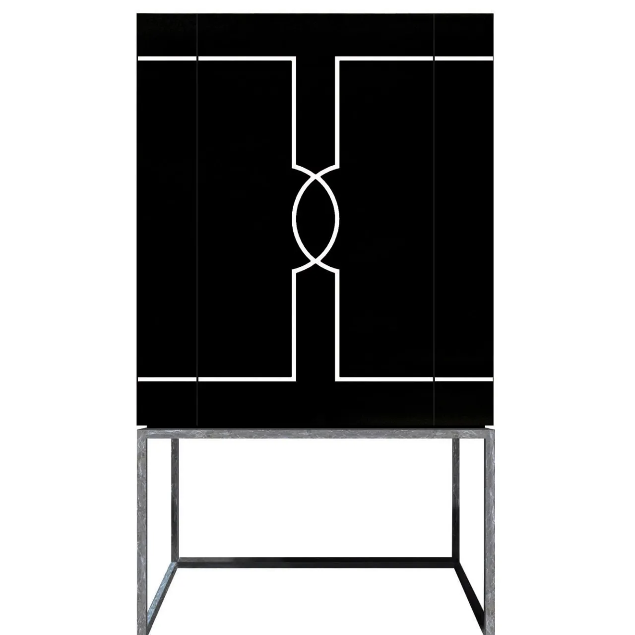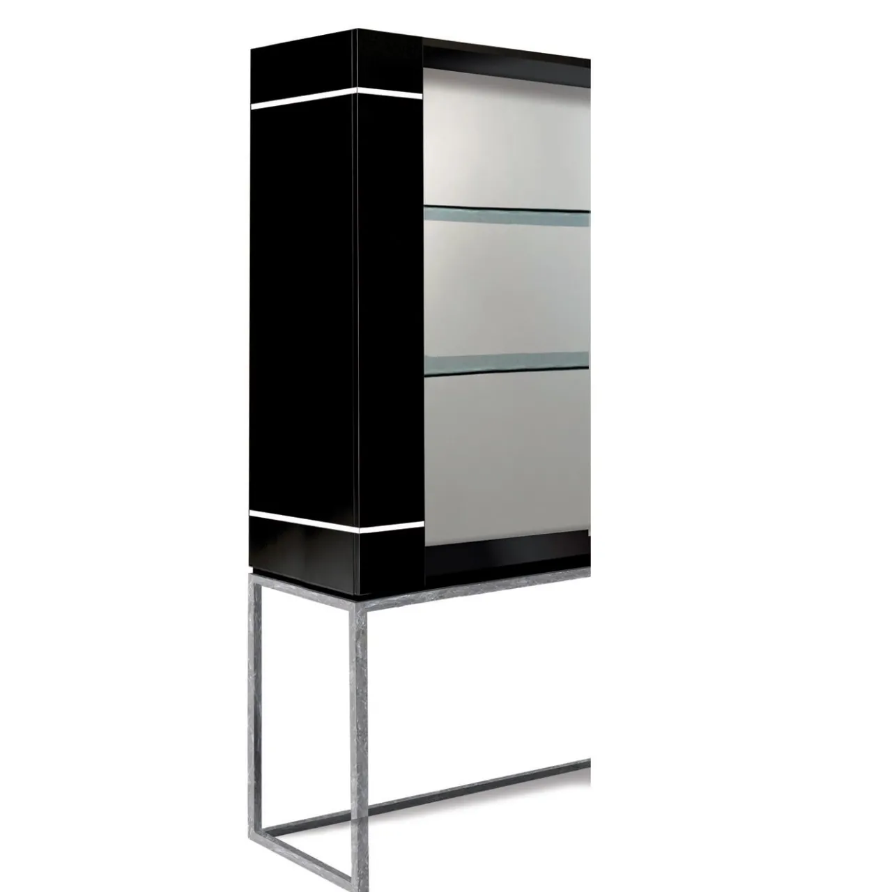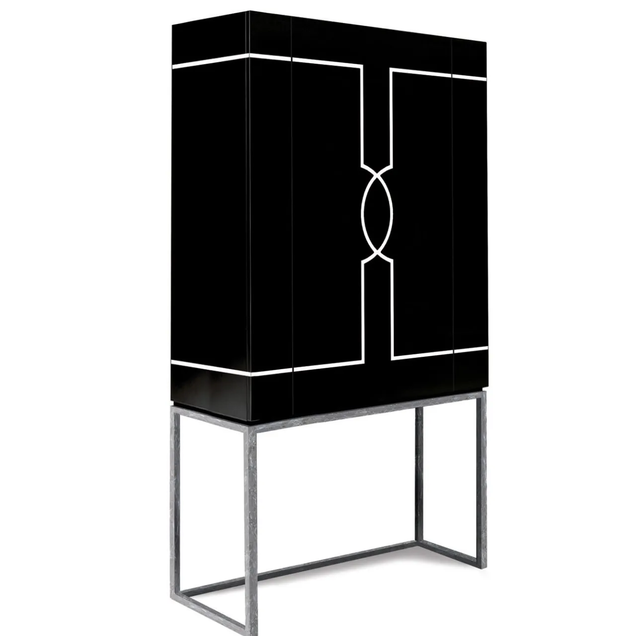 Questo mobile a un’anta, realizzato dai migliori artigiani italiani, poggia su una struttura metallica in foglia d’argento ed è dotato di un meccanismo di apertura a pressione sull’anta centrale. L’aggiunta di un motivo geometrico sulla parte anteriore e sui lati conferisce un fascino sottile e glamour. Ideale per conservare bottiglie e bicchieri, il mobile è dotato di due ripiani in vetro e di uno sfondo a specchio. Il mobile è disponibile in nero opaco e laccato bianco. Designer: Isabella Costantini.