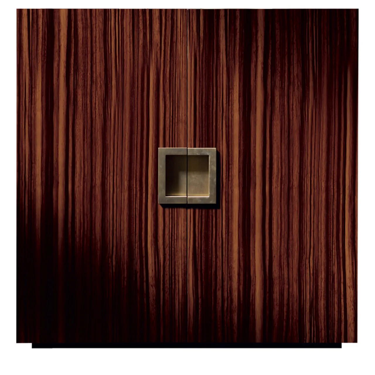 Questo mobile alto fa parte della serie Gilbert e può essere abbinato alla sua controparte più corta. La silhouette rigorosa è realizzata in legno massiccio di Macassar, evidente nelle due ante frontali con venature verticali che aggiungono una magnifica decorazione naturale e un accento unico a qualsiasi stanza della casa. Per completare questo design audace, le due maniglie creano un motivo quadrato con finitura galvanica.
