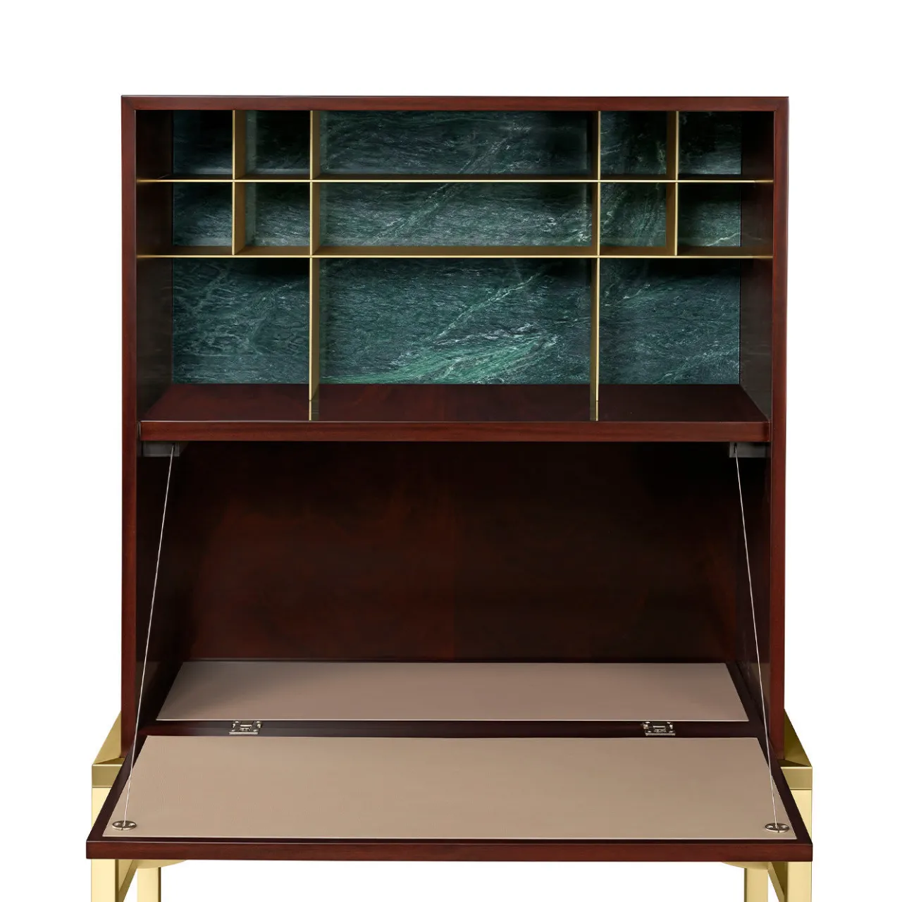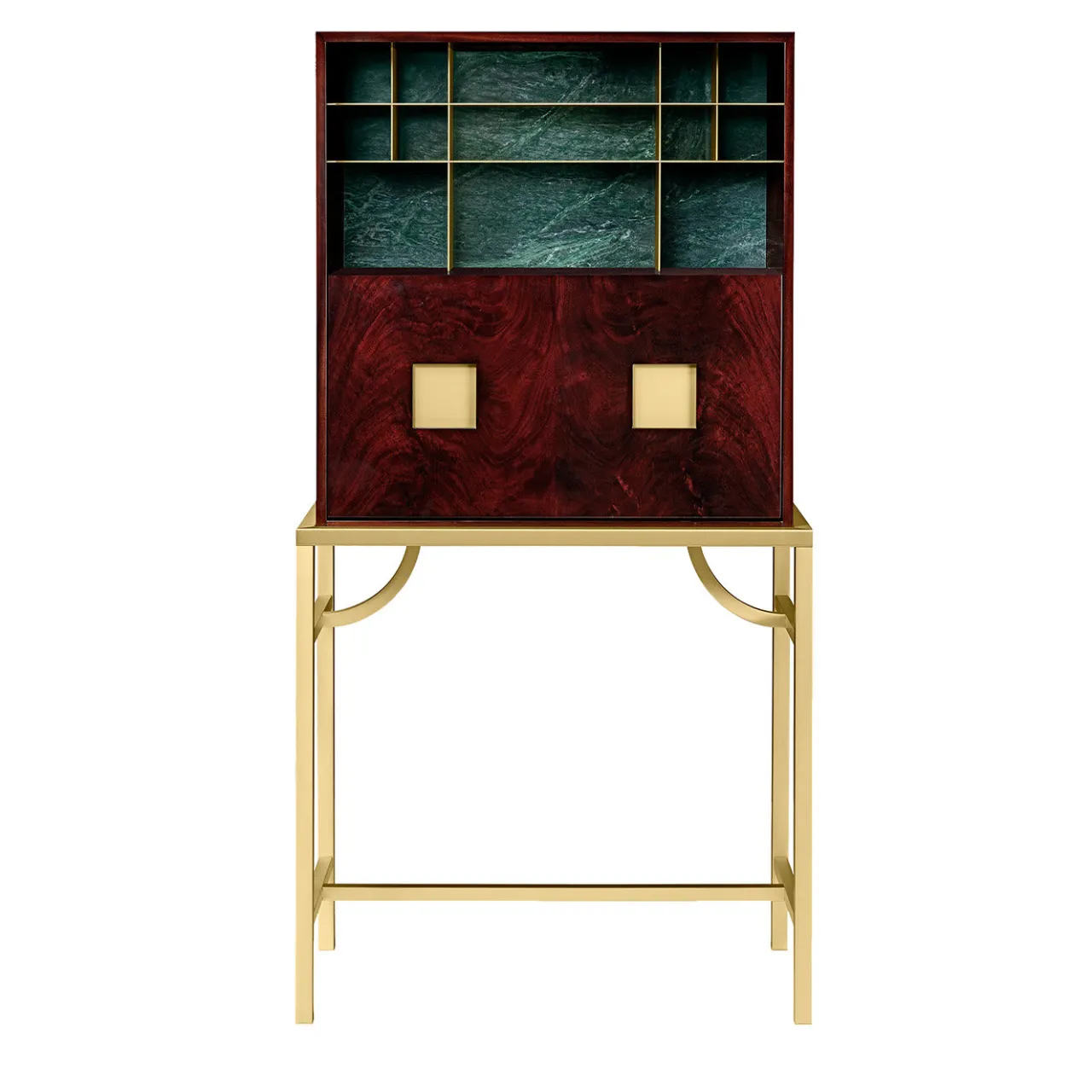 Superlativa vetrina di artigianato, questo mobile può essere utilizzato come mobile bar, scrigno per gioielli o wunderkabinett per esporre eleganti e preziosi pezzi d’accento. Di ispirazione giapponese, il mobile poggia su gambe in ottone con finitura satinata ed è realizzato in pregiato legno di mogano abbinato a marmo verde Alpi, per un gioco ipnotico di tinte, venature e texture. Il mobile presenta due scomparti chiusi e una piccola serie di ripiani aperti.