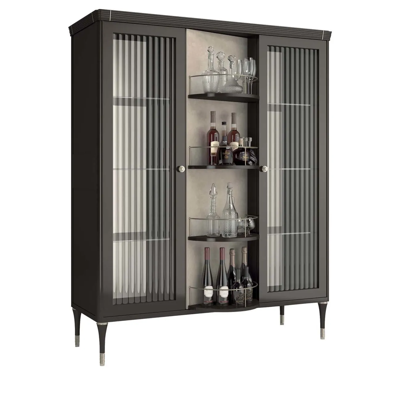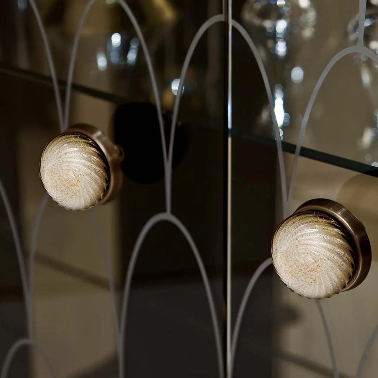 Vera protagonista di ogni interno, questa vetrinetta abbina la funzionalità a un design elegante e raffinato che valorizzerà qualsiasi arredamento con glamour. Le linee semplici della struttura in legno ebanizzato lucido permettono alle caratteristiche dettagliate di essere protagoniste senza essere esagerate. Le ante e i pannelli laterali in vetro sono impreziositi da un motivo geometrico inciso a onde alternate che permette di vedere i tre ripiani in cristallo all’interno. La base è costituita da due doghe metalliche piegate con una calda finitura bronzata che aggiunge un fascino moderno a questo pezzo sofisticato.