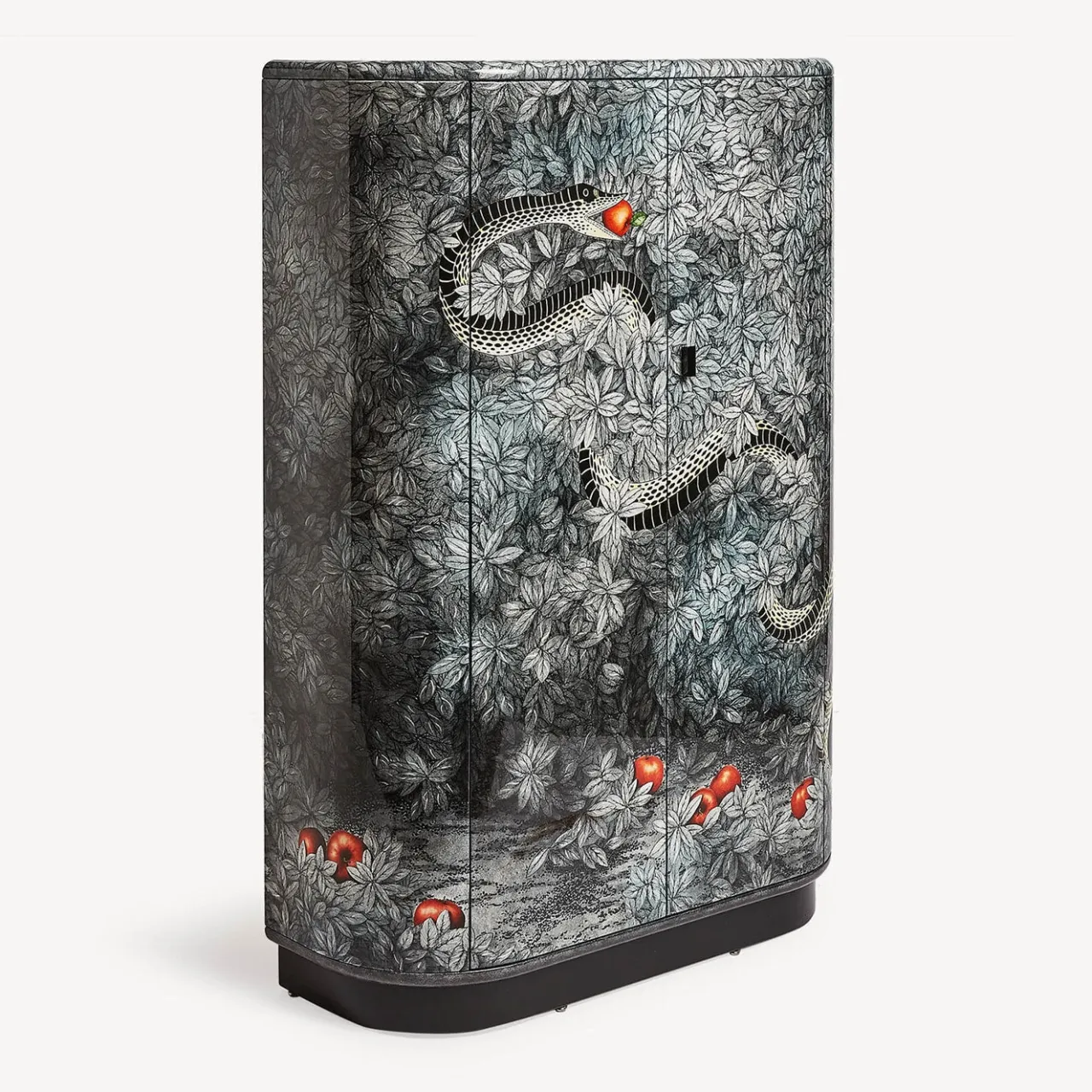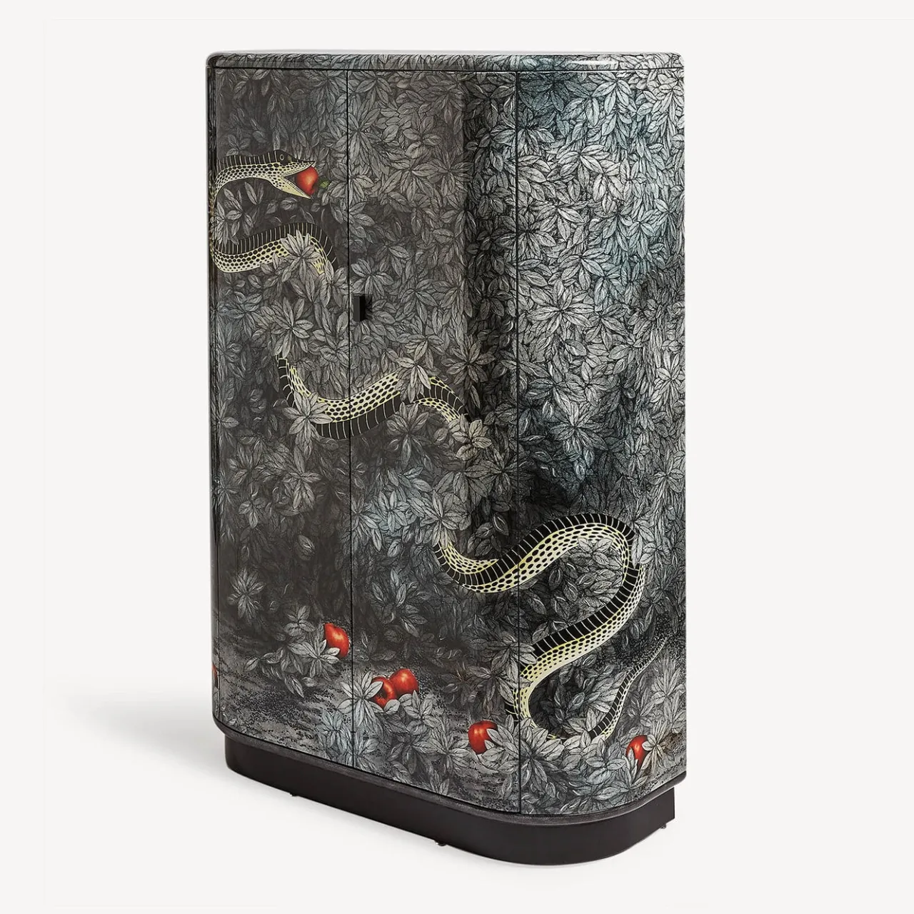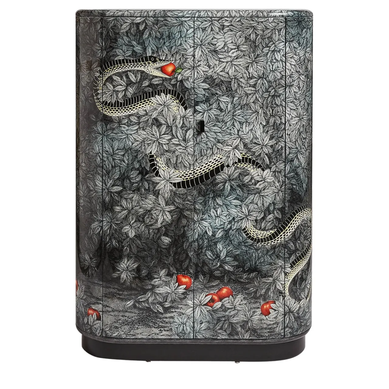 Questo mobile dalle forme arrotondate ed eleganti è diventato rapidamente uno dei classici più apprezzati di tutti i tempi. Serigrafato, dipinto e laccato a mano, è decorato con il serpente tentatore, eterno simbolo di seduzione ed esempio dell’estetica senza tempo di Fornasetti. Eventuali piccole differenze tra creazioni simili sono il risultato della lavorazione artigianale e testimoniano l’unicità di ogni prodotto.