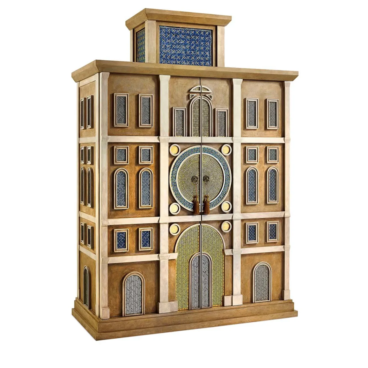 Questo mobile da vino è un capolavoro disegnato da Massimiliano Raggi e celebra l’eleganza signorile del Rinascimento italiano. La struttura in legno con rivestimento a cera e finitura intonacata a mano è impreziosita da bronzo, vetro a specchio e mosaico artistico in oro e platino applicato a mano. Questa squisita opera d’arte riproduce l’esterno della torre dell’orologio di Venezia, con i suoi volumi armoniosi e il suo fascino prezioso. L’interno è dotato di divisori rivestiti in pelle. Il bar interno è opzionale, si prega di informarsi presso il Concierge per i dettagli.