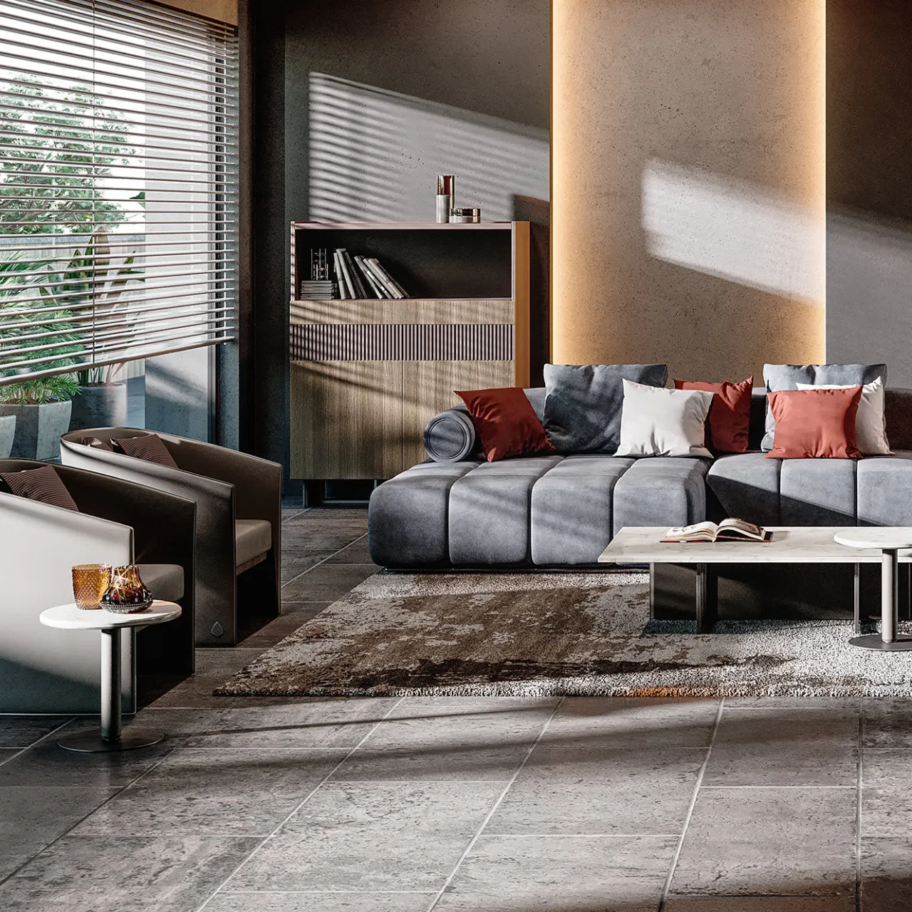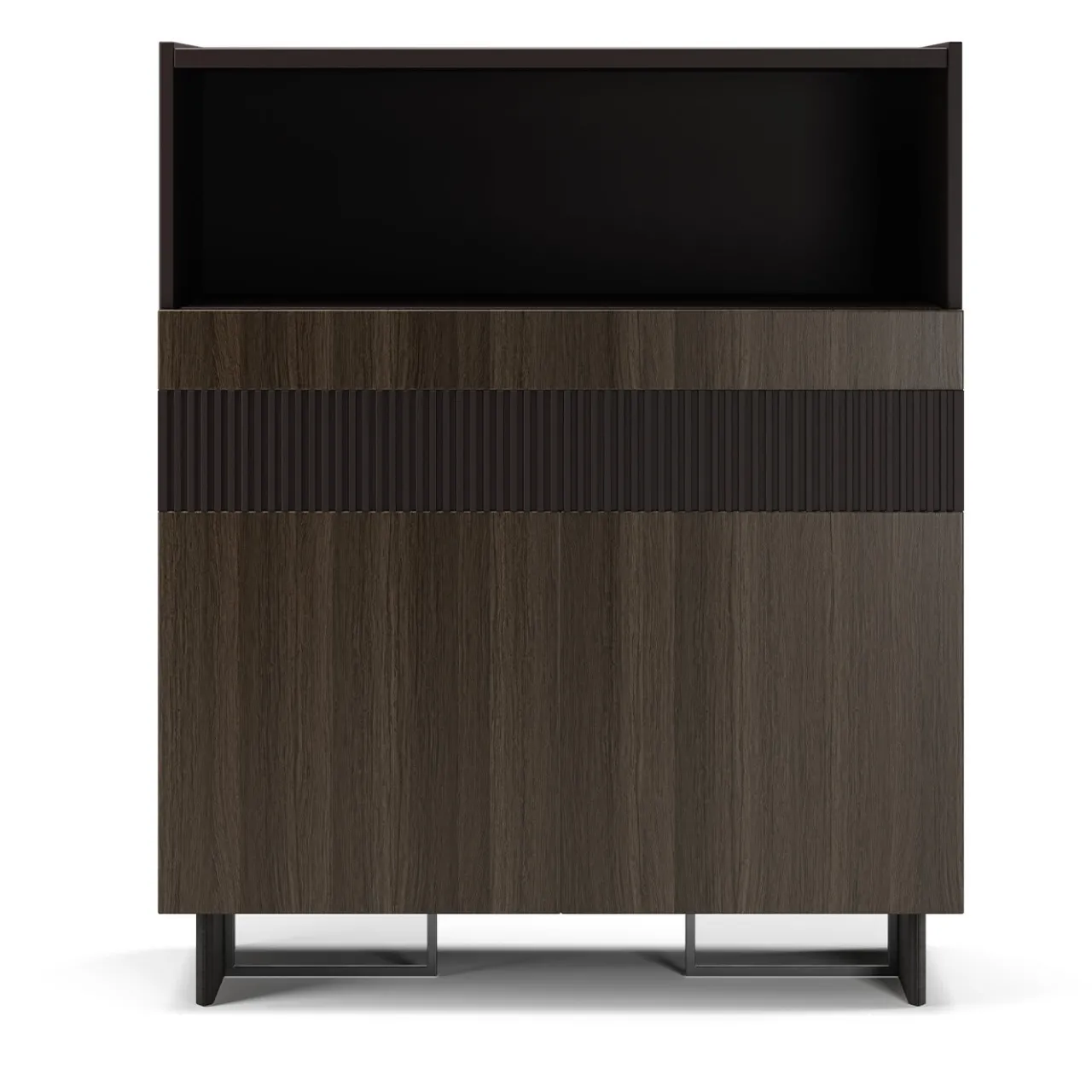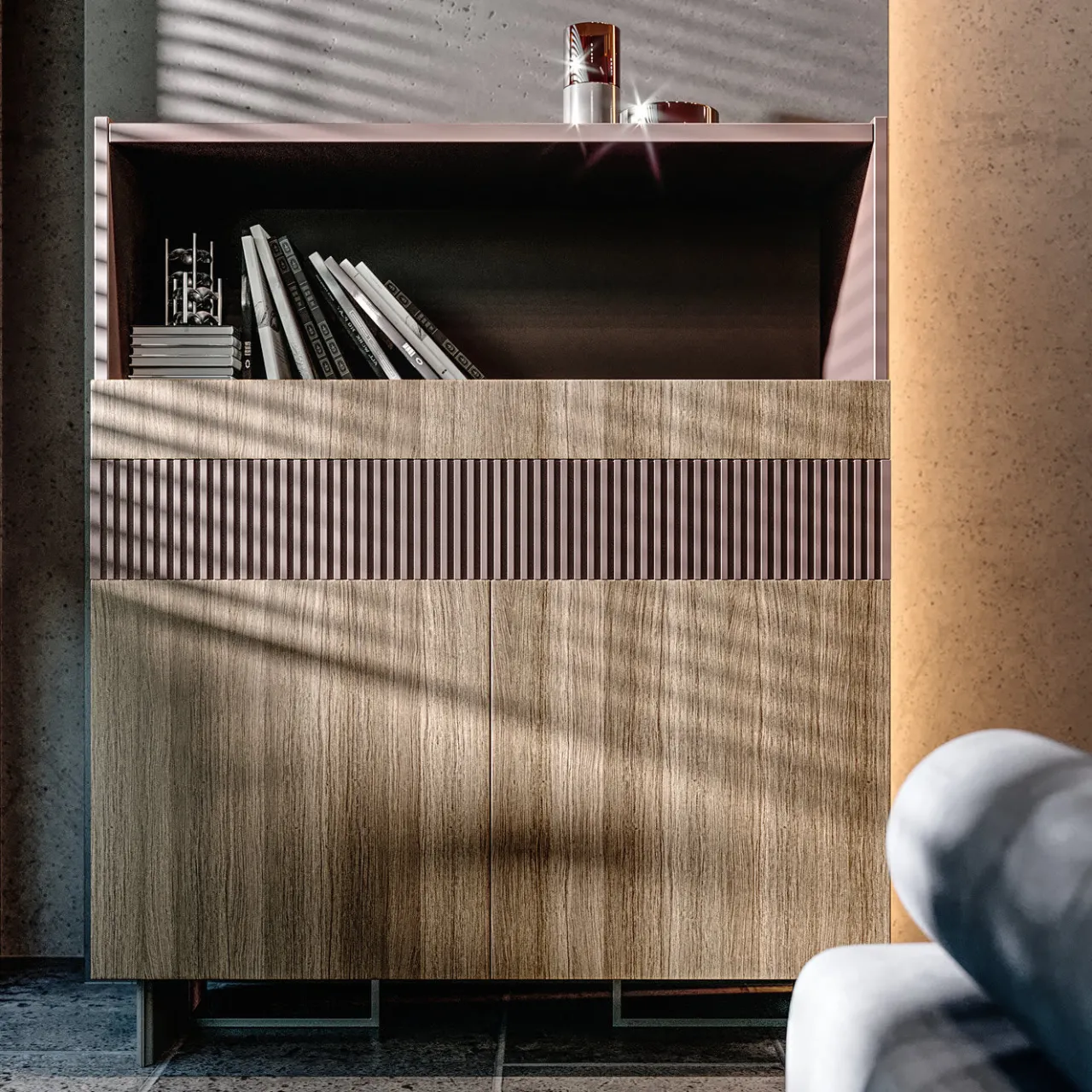 Definita da un elegante profilo squadrato, questa madia in legno poggia su un’intrigante base composta da elementi perpendicolari: due piedini in metallo traforato finitura titanio attraversati da piccoli pannelli rivestiti in ecopelle. Il mobile offre un ampio vano a giorno, uno spazioso ripostiglio chiuso da due ante rivestite in rovere grigio e un cassetto laccato e fresato che crea una sapiente combinazione di materiali e texture.