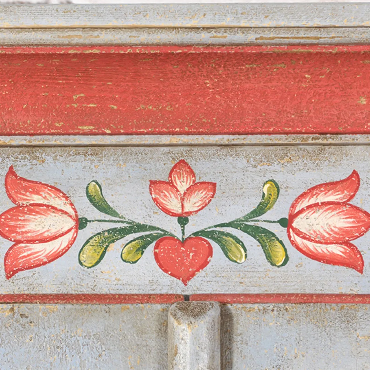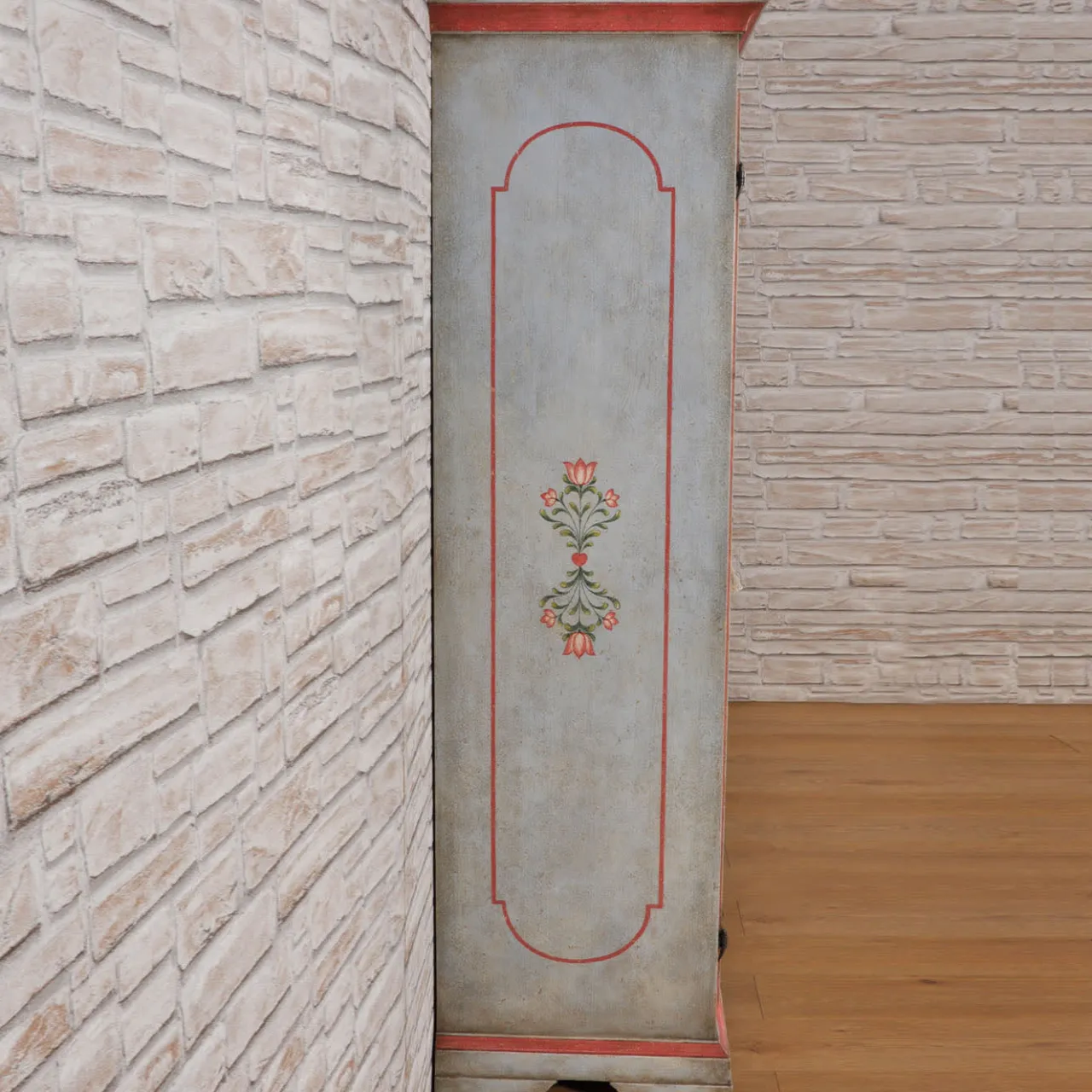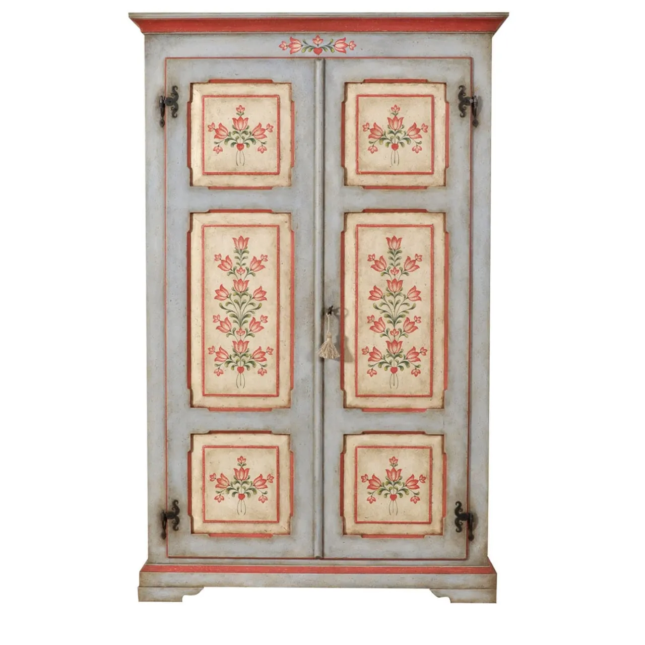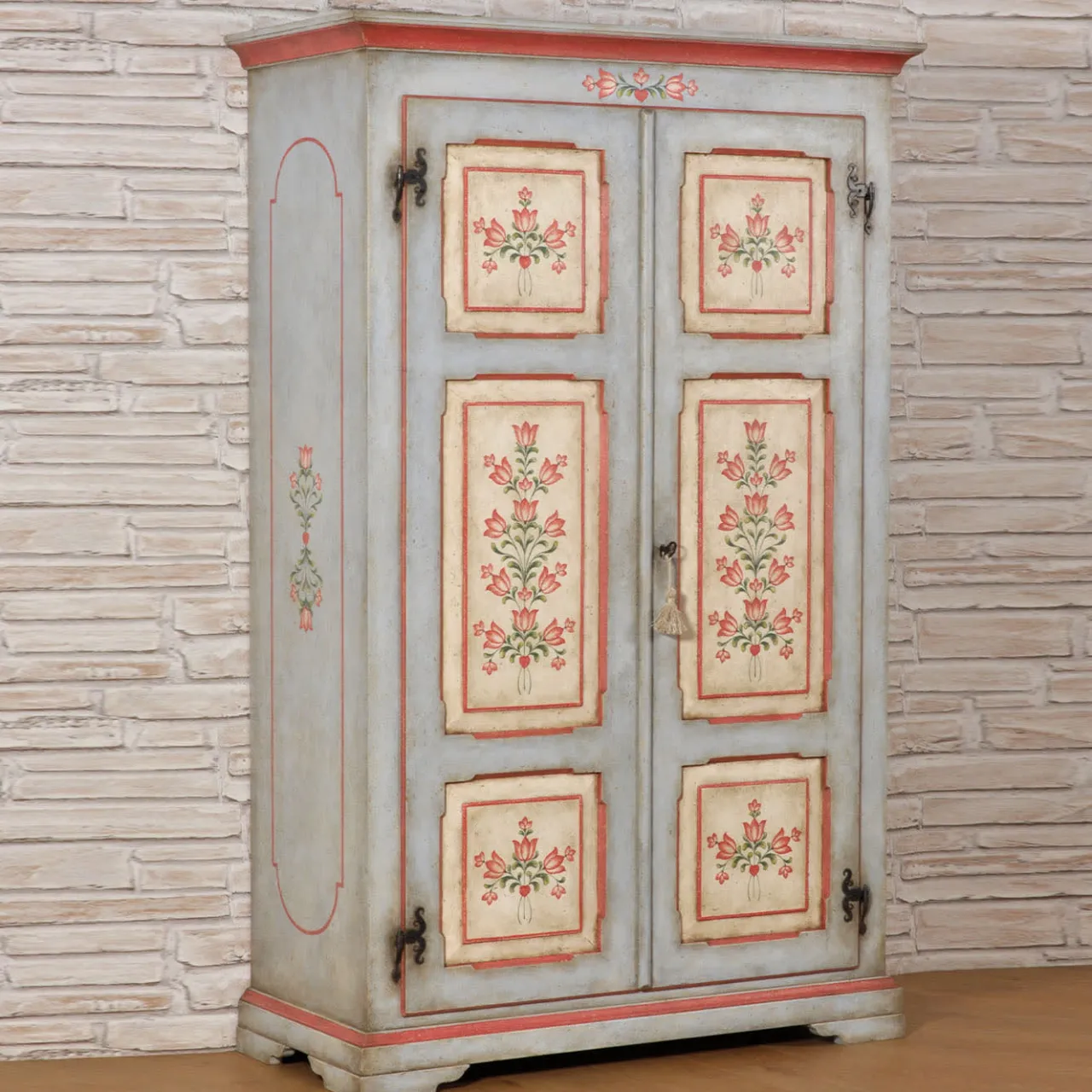 Romantico e raffinato, questo armadio è un gioiello di ebanisteria che riproduce un disegno barocco tirolese originale della fine del XVII secolo. Decorato con colori a tempera a base d’acqua, sfoggia una delicata combinazione di azzurro e beige che permette di far risaltare i motivi floreali, insieme alle cerniere e alla rocca in ferro. La gommalacca e la cera d’api impreziosiscono e proteggono il pezzo. Consultare il Concierge per le personalizzazioni.