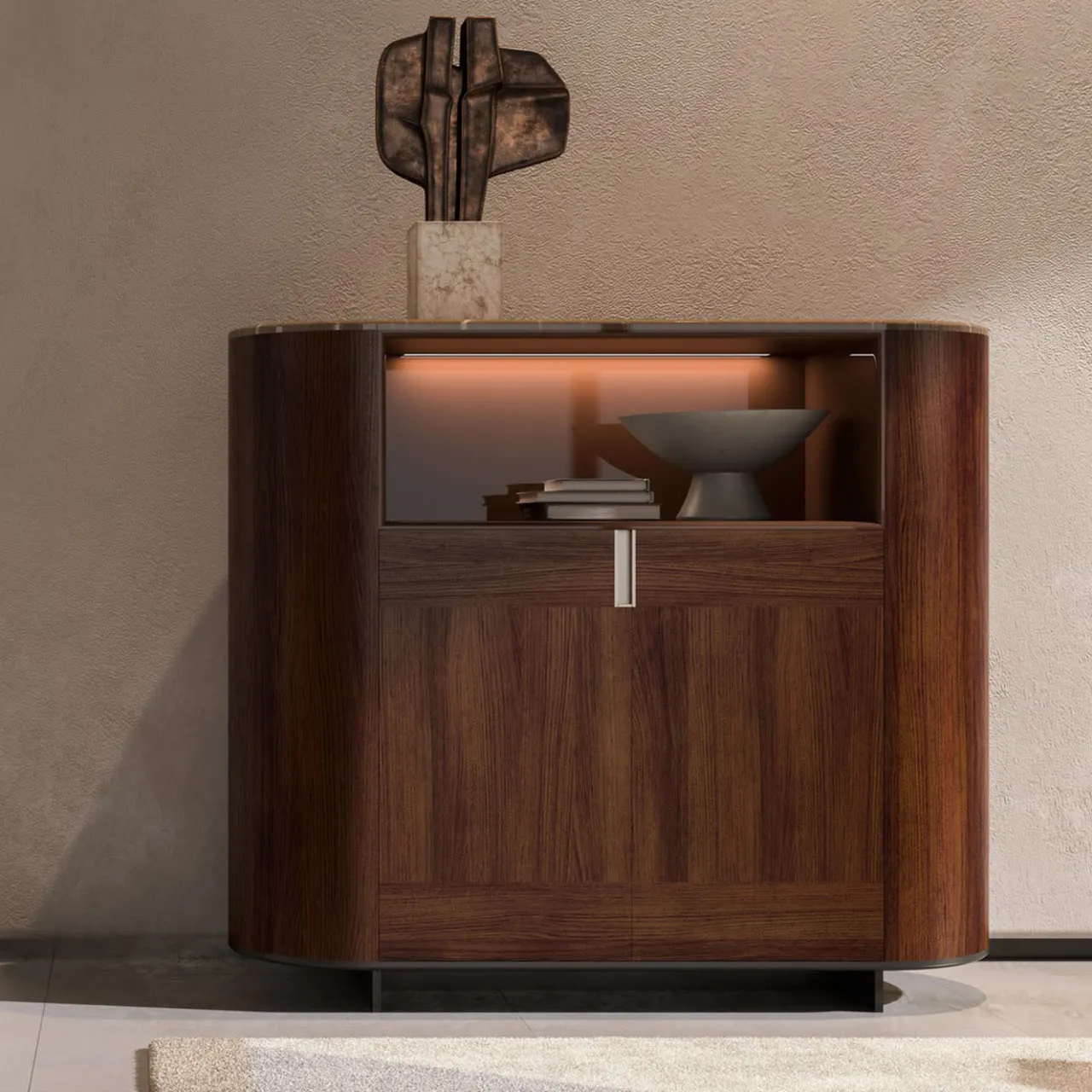 Credenza alta a vista con struttura in legno di palissandro Santos. Laccato a vista. Piano in marmo Amani. Dettagli metallici in acciaio spazzolato.
