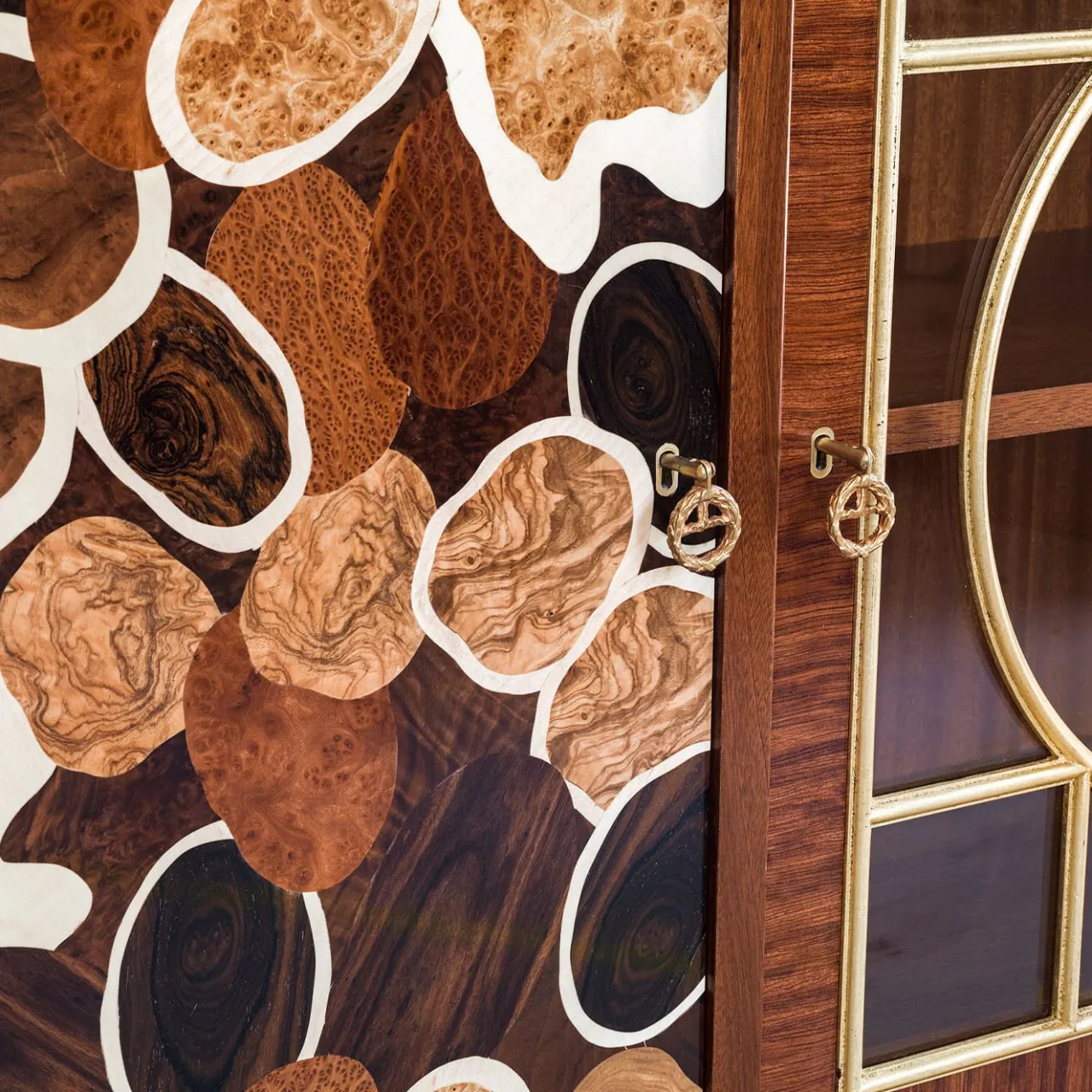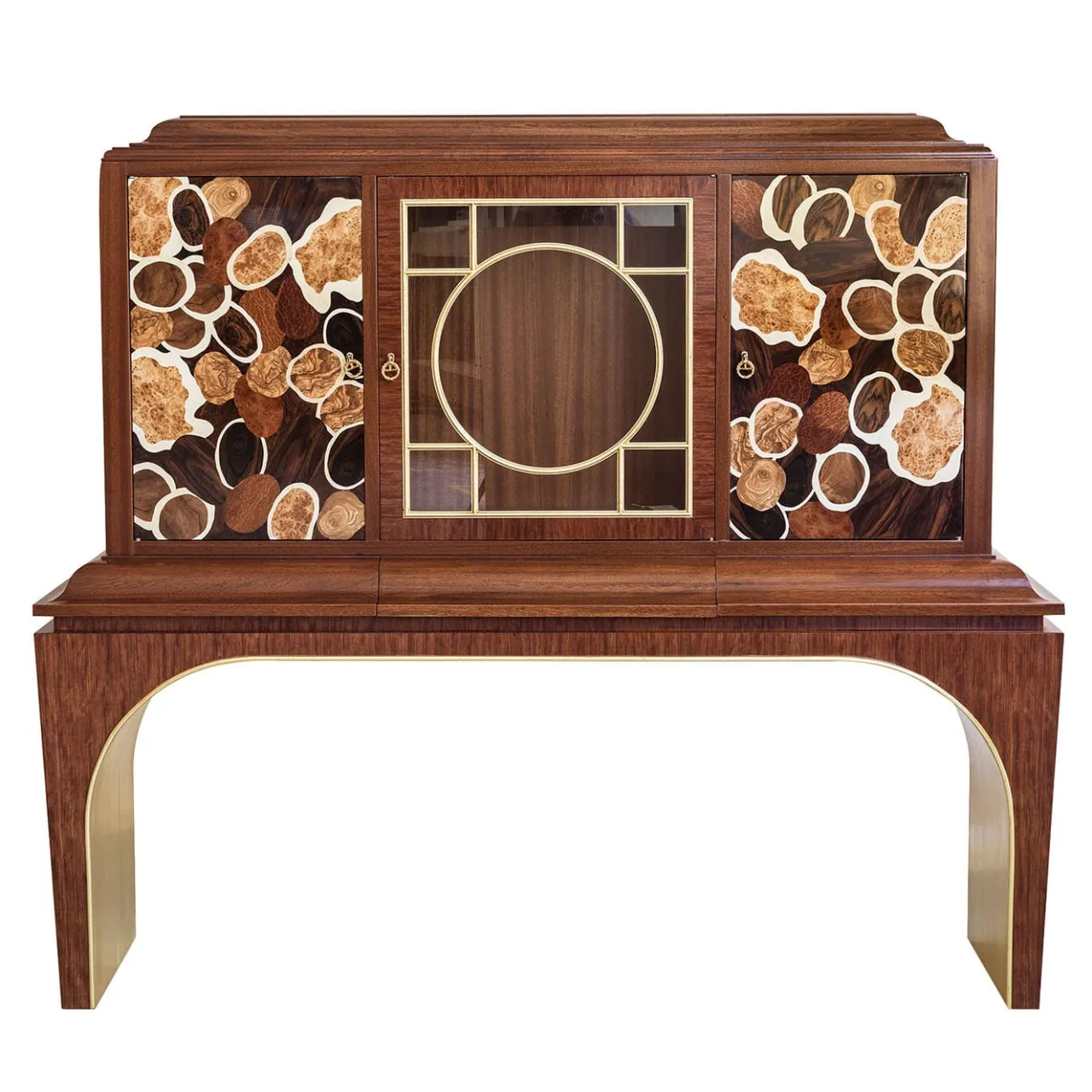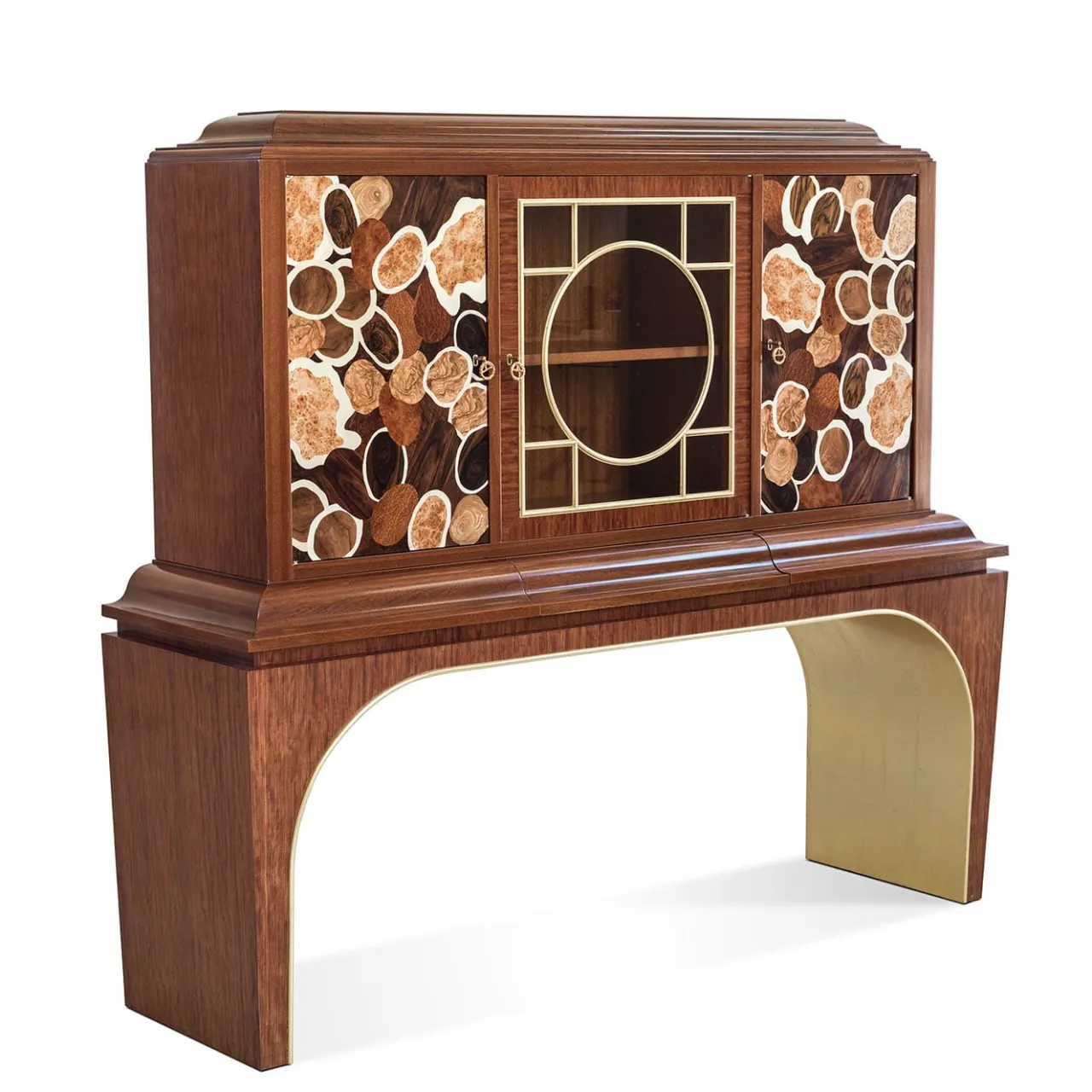 Questo prezioso mobile è sapientemente realizzato in legno di mogano e bubinga e presenta porte intarsiate ed eleganti dettagli in ottone.