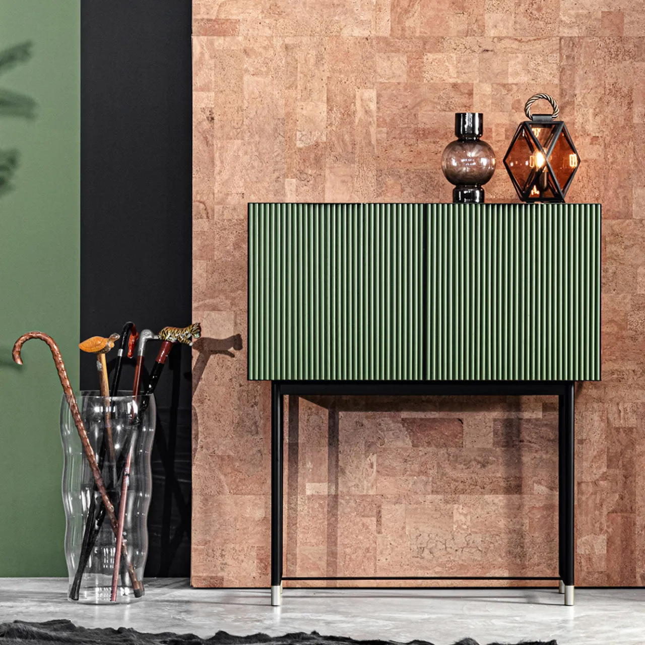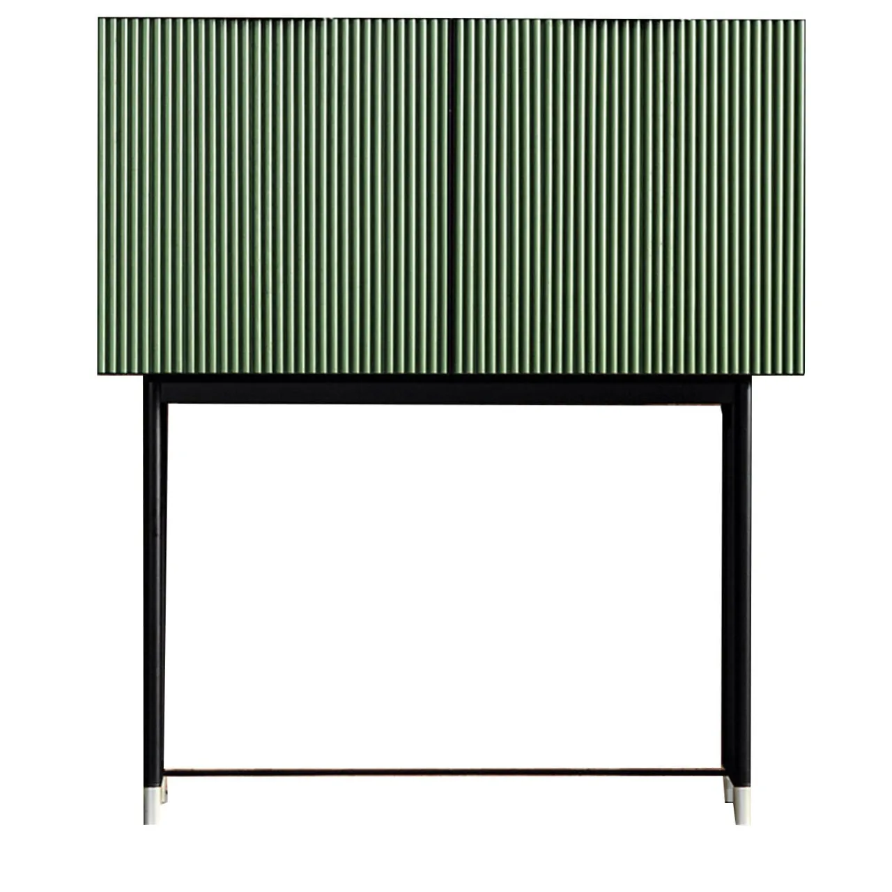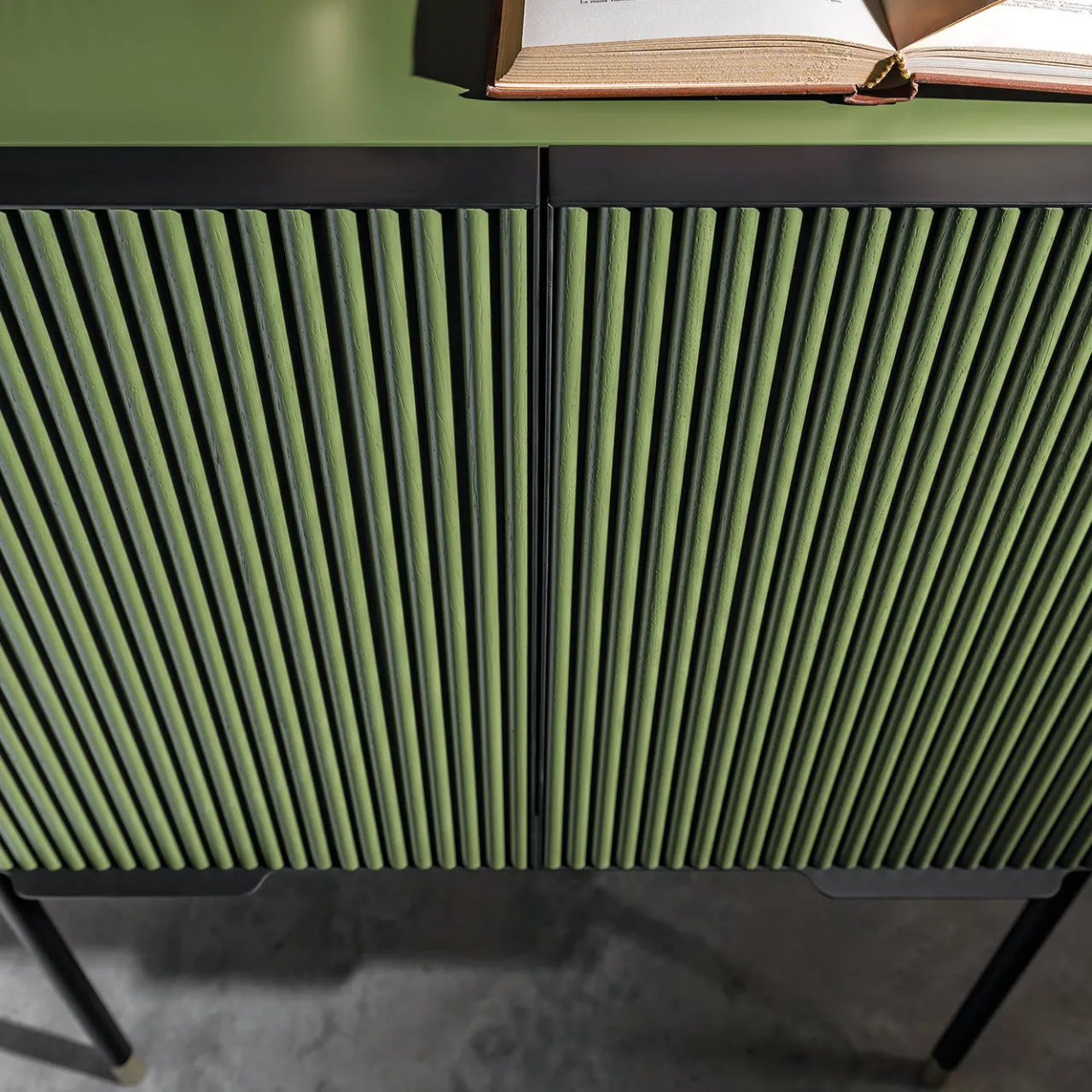 Questa credenza, elegante e versatile, è un’aggiunta testuale di grande effetto a un interno contemporaneo. Le gambe allungate in metallo nero sono impreziosite da punte in ottone satinato chiaro. La struttura esterna del piano è laccata verde opaco con ante in frassino verde a poro aperto e telaio in metallo nero. Il contrasto tra la leggerezza della base e l’imponenza del piano ha un effetto accattivante.