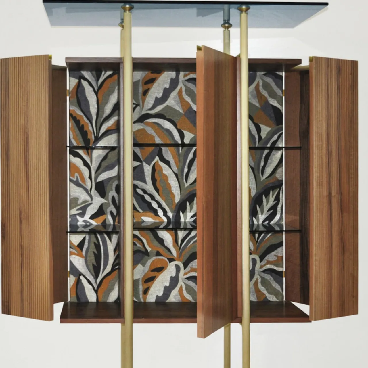 Esclusivo ed elegante elemento d’arredo che trae ispirazione da antichi bauli, questo mobile dal design eclettico si inserisce con eleganza in un ambiente contemporaneo. Presenta una struttura in ottone cilindrica e nervata e un corpo in noce canaletto, arricchito da un piano in vetro colorato. I ripiani interni sono in vetro trasparente. È personalizzabile con un interno rivestito in tessuto a fronte di una variazione di prezzo, si prega di chiedere i dettagli.