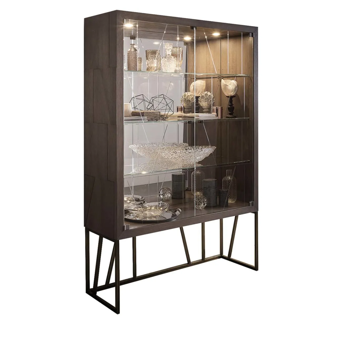 Questo mobile, che emana una raffinata ricercatezza, fonde l’arte dell’artigianato tradizionale con un’allure unica e contemporanea. Questo splendido pezzo è composto da una base in ottone brunito, caratterizzata da linee rette e diagonali, da una spessa ed elegante struttura in legno di rovere e da due ante in vetro acidato. I ripiani interni sono anch’essi in vetro e il pannello posteriore presenta uno specchio arricchito da luci LED. Questo mobile è disponibile in altre finiture e senza LED. Chiedere al Concierge i prezzi.
