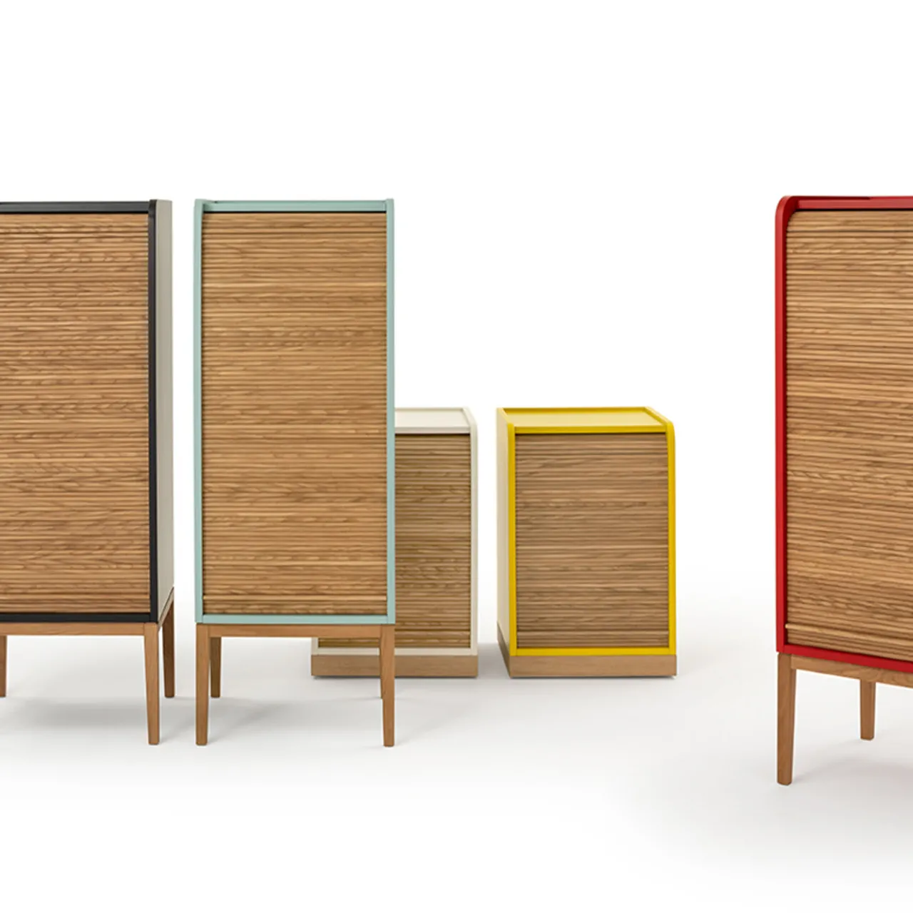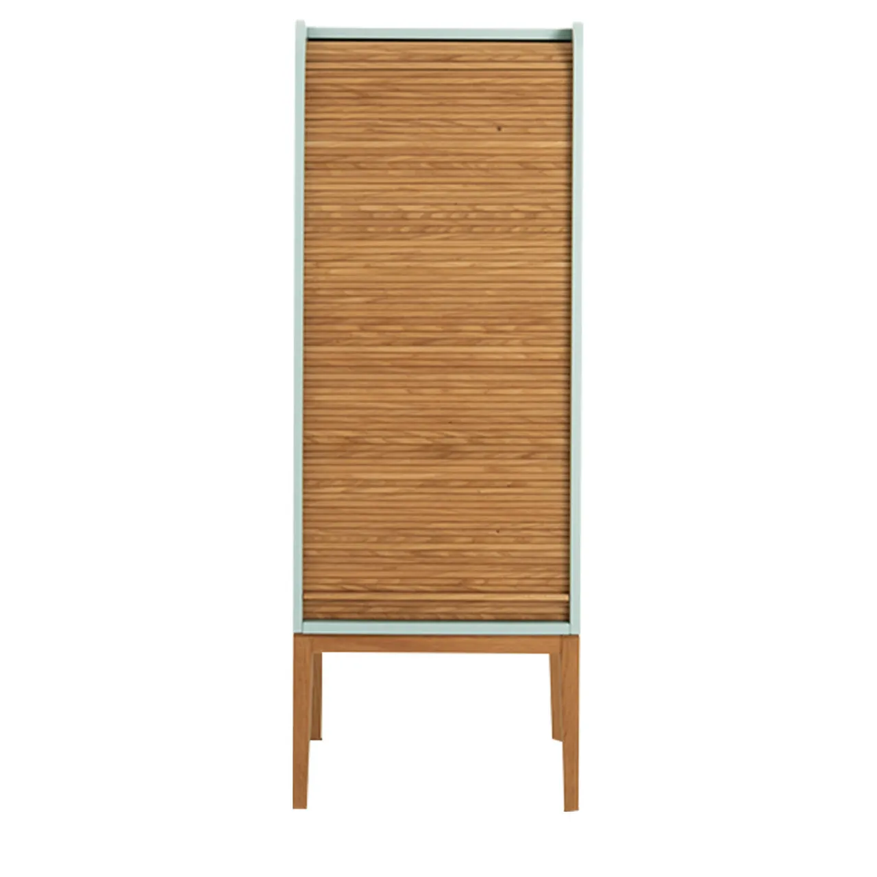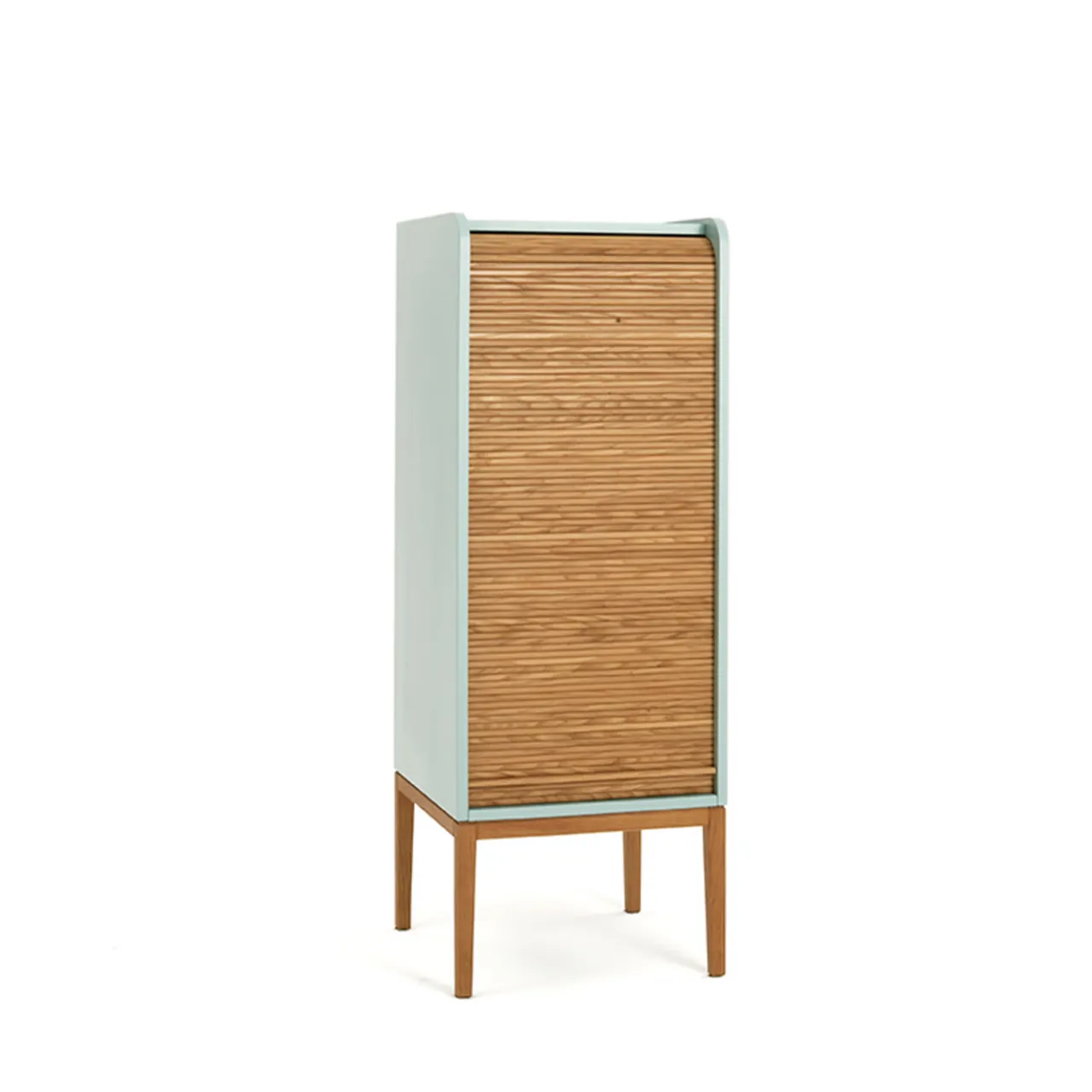 La vivacità dell’azzurro/verde incontra il rigore di un profilo filante in questo mobile che fa parte di una serie ispirata ai decori delle case degli scrittori di fine Ottocento e Novecento. Il vano interno è composto da due ripiani in rovere regolabili in tre diverse altezze e chiusi da una tapparella montata a mano su tela. Una conchiglia in legno laccato in una vivace tonalità di azzurro e verde incornicia il contenitore e poggia su quattro gambe in rovere dotate di piedini regolabili. Questo pezzo è disponibile in diversi colori, chiedete al Concierge per i dettagli.